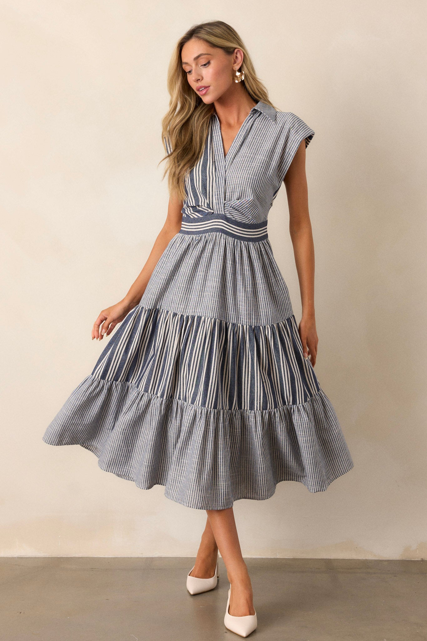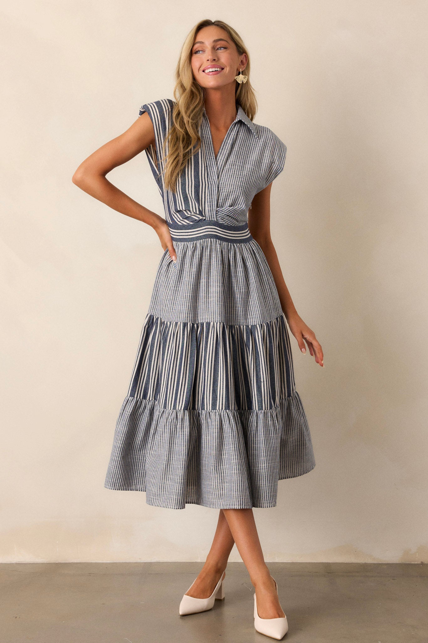 Go for a casual yet stylish look with our Along The Way Navy Stripe Cap Sleeve Midi Dress. Its cap sleeve design adds a touch of elegance while the midi length keeps it comfortable and versatile. Perfect for any occasion, this dress will take you along your day with effortless style. This navy dress features built in shoulder pads, a mixed stripe pattern, a tiered skirt bottom, collared neckline with functional button front detailing a discrete side zipper under the left sleeve, and cap sleeves.