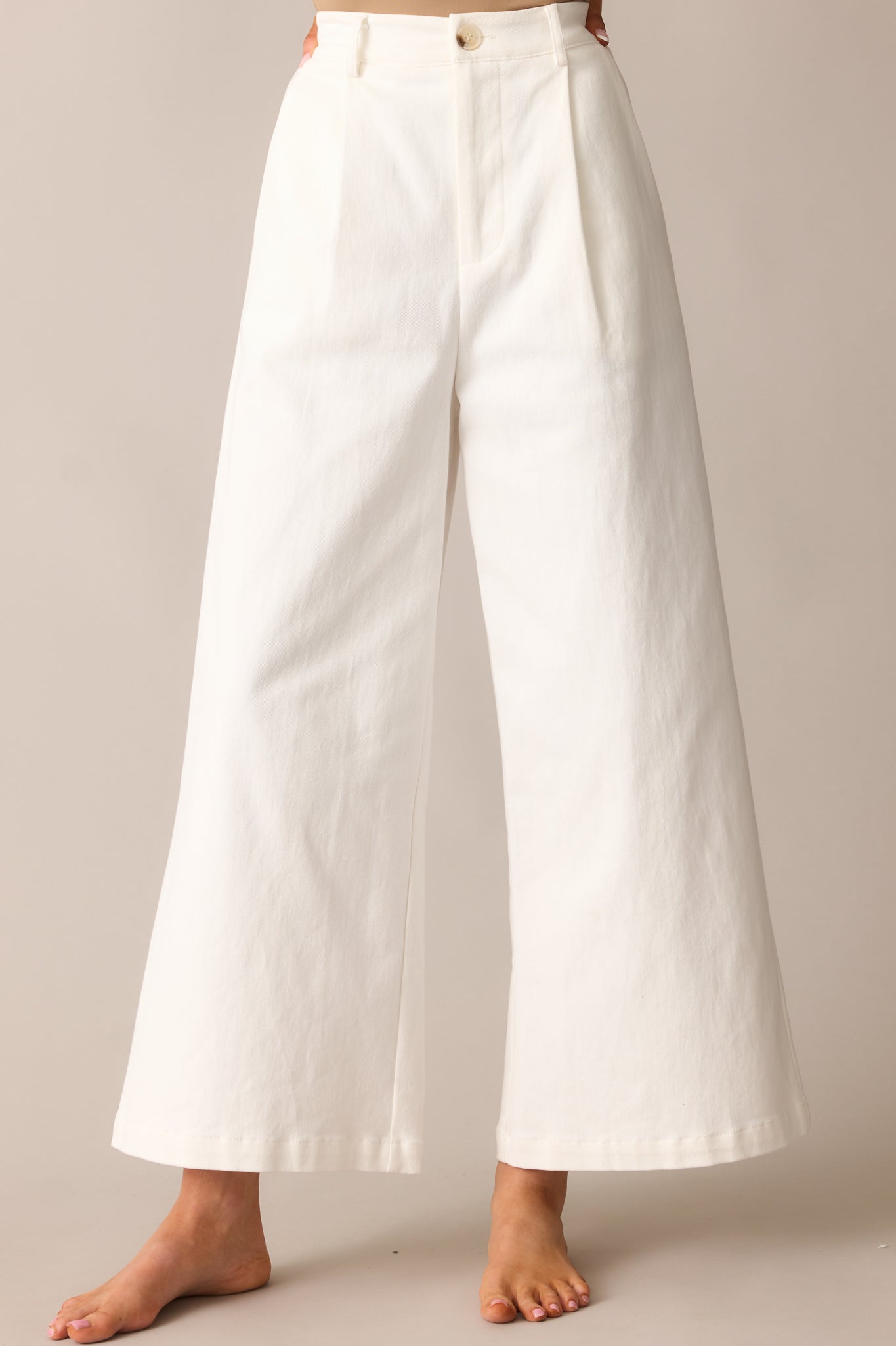 Unleash your inner fashionista with our Call It Fate Ivory Wide Leg Cropped Jeans. The wide leg design elongates legs and provides a comfortable fit, while the ivory color adds a touch of sophistication. Perfect for any occasion, these jeans are a must-have for your wardrobe. These wide leg jeans feature a high waisted design, an elastic waist insert, functional belt loops, a button zipper closure, functional hip pockets and a wide leg.