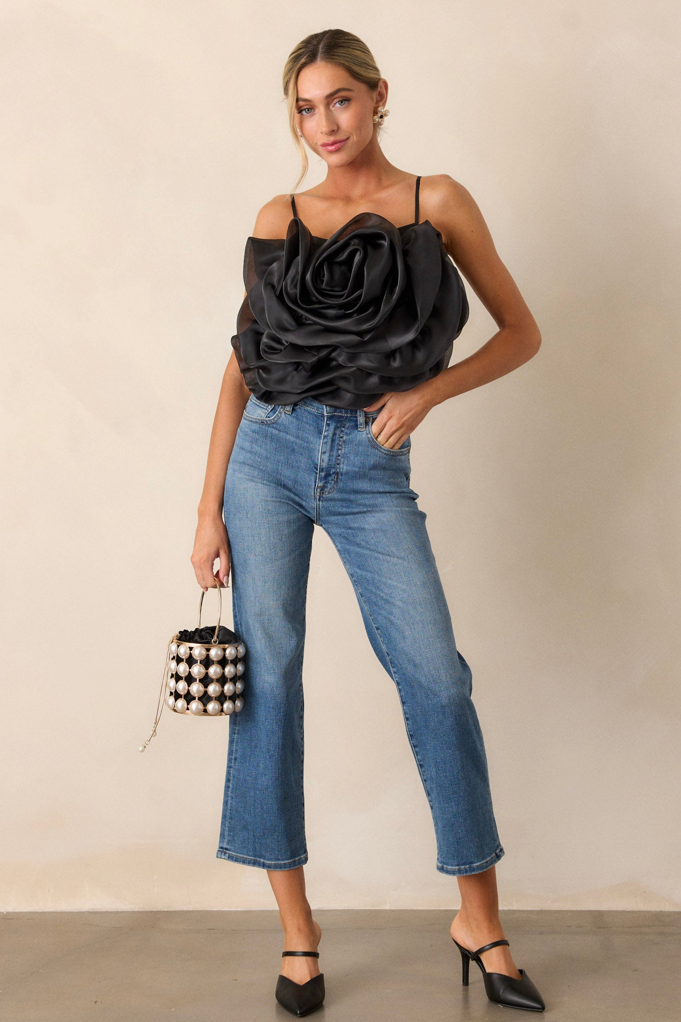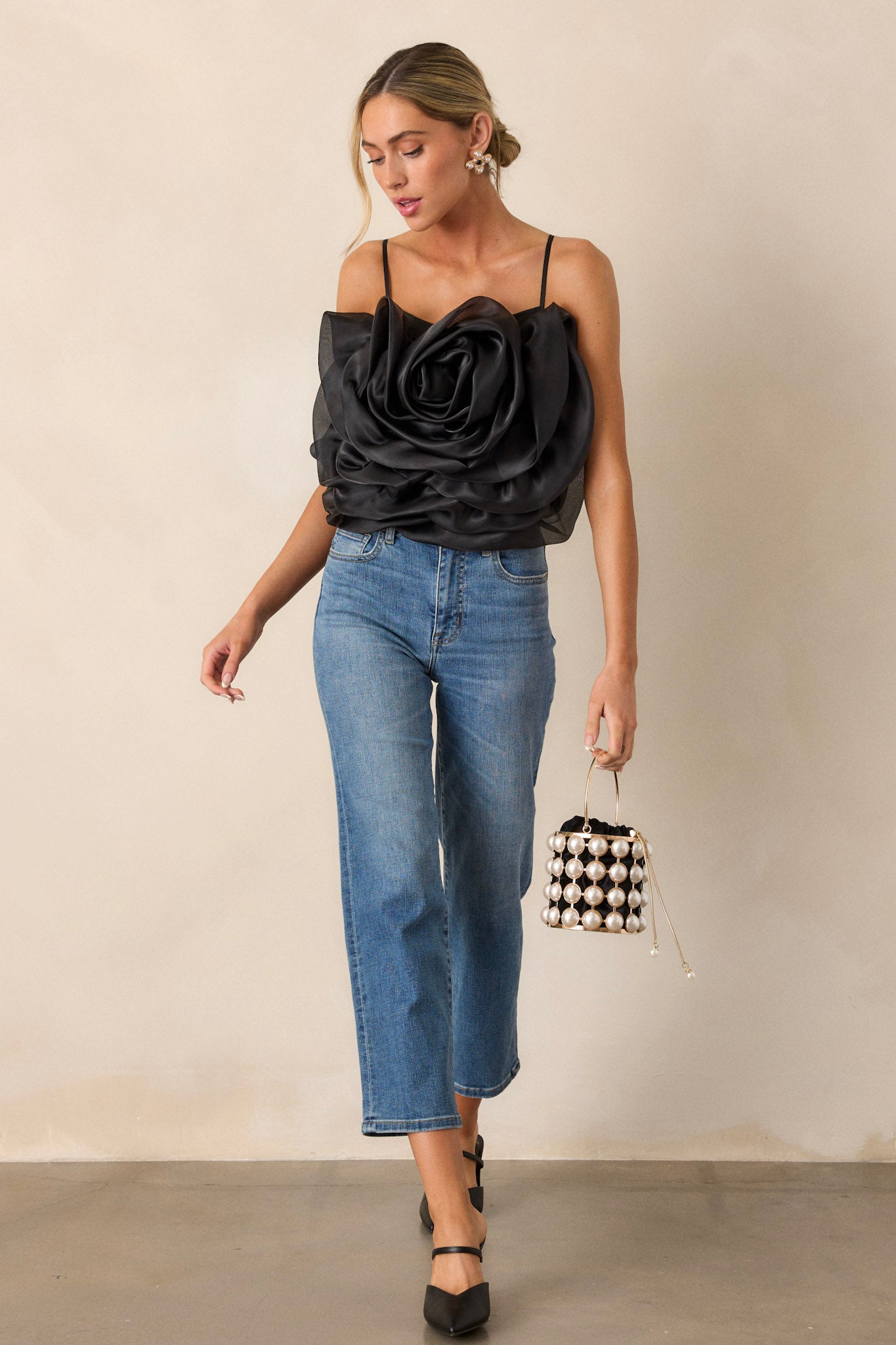 Add a touch of edgy femininity to your wardrobe with our Dark Blossom Black Flower Crop Top. Its cropped length and dark floral pattern make it perfect for pairing with high-waisted bottoms. Be effortlessly bold and chic in this one-of-a-kind piece. This black crop top features a square neckline, thin & stretchy adjustable straps, a fully smocked back, a large 3-D flower, and a cropped hemline.