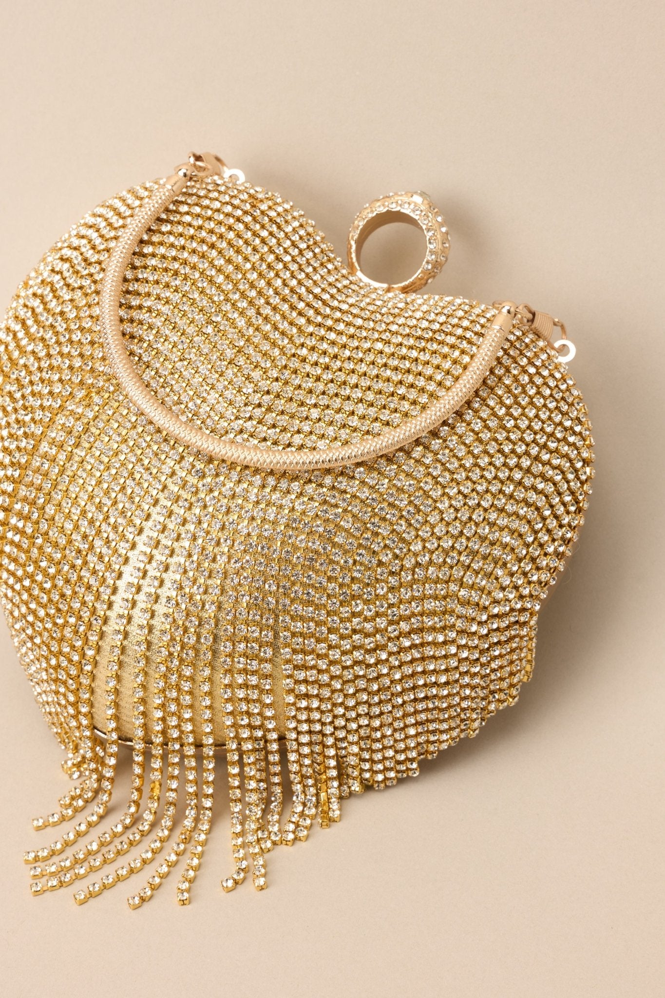 Carry your heart on your shoulder (well, technically in your hand) with the I Give You My Heart Gold Handbag! This gold-colored handbag is both stylish and functional with a spacious interior, perfect for holding your essentials. Let your heart shine with this unique and playful accessory! This handbag features gold hardware, rhinestone fringe, a removable chain strap, a ring like feature, and a snap closure.