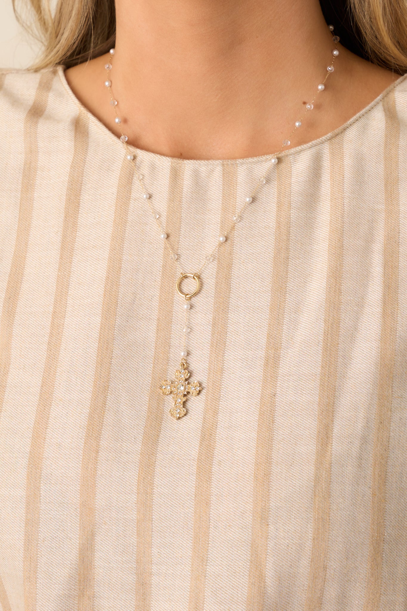 Radiate timeless elegance with the Love That Lasts Rosary-Style Cross Necklace. This beautiful piece combines classic design with modern sophistication, perfect for adding a touch of refinement to any outfit. Its delicate style makes it a versatile accessory for both special occasions and everyday wear. This gold necklace features a y-shaped rosary-style chain, evenly spaced clear rhinestones and ivory faux pearls along the chain, a cross pendant adorned with rhinestones, and a lobster claw clasp.