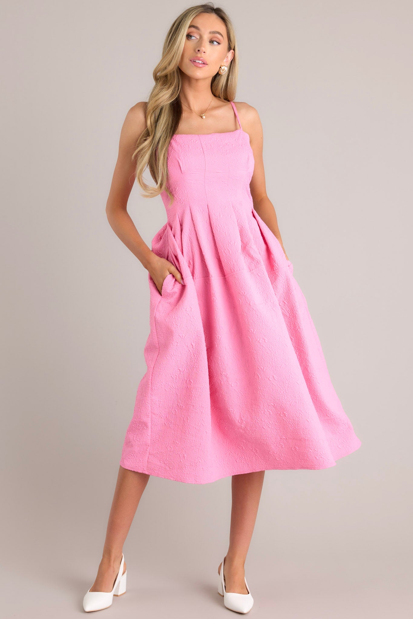 Get ready to turn heads with the Midnight Melodies Pink Midi Dress. In a bold and bright pink hue, this dress will make you stand out in any crowd. With its eye-catching color, you'll be sure to make a statement at any event or occasion. Perfect for those who want to add a pop of color to their wardrobe. This pink dress features a square neckline, thin adjustable straps, a smocked section at the back, a hidden zipper in the back, hip pockets, a flowy pleated skirt, and a crinkled texture throughout.