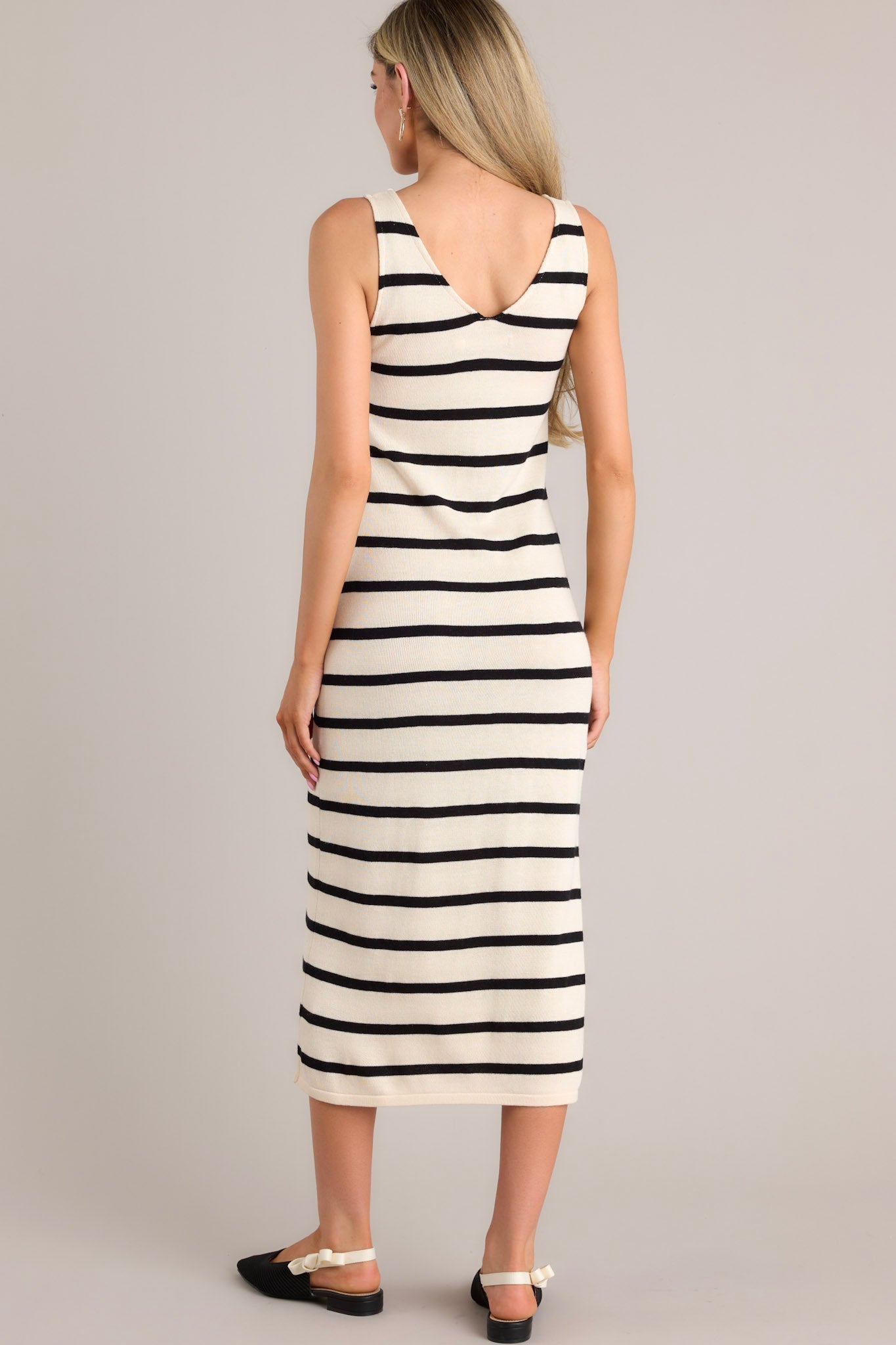 Turn up the volume on your style with our Monochrome Melody dress. This black striped midi dress will have you grooving with its sleek design and playful flair. Perfect for any occasion, pair it with your favorite accessories and let your personality shine through! This dress features a v-neckline, a classic stripe pattern, a sweater material, and side slit.