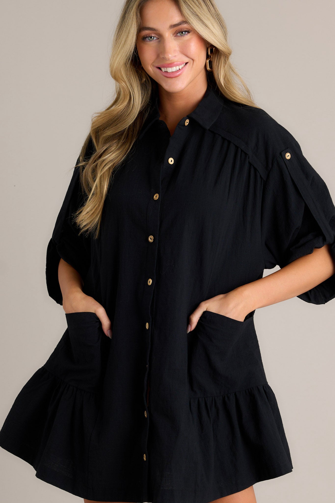 Get ready to turn heads in the Posh Vision 100% Cotton Black Button Front Mini Dress. With its playful and fun button front design, this dress is perfect for any occasion. Made with 100% cotton, you'll experience the ultimate comfort while looking stylish. Elevate your wardrobe with this quirky and chic mini dress! This button front dress features a collared high neckline, a functional button front, functional hip pockets, cuffed half sleeves and a tiered design.