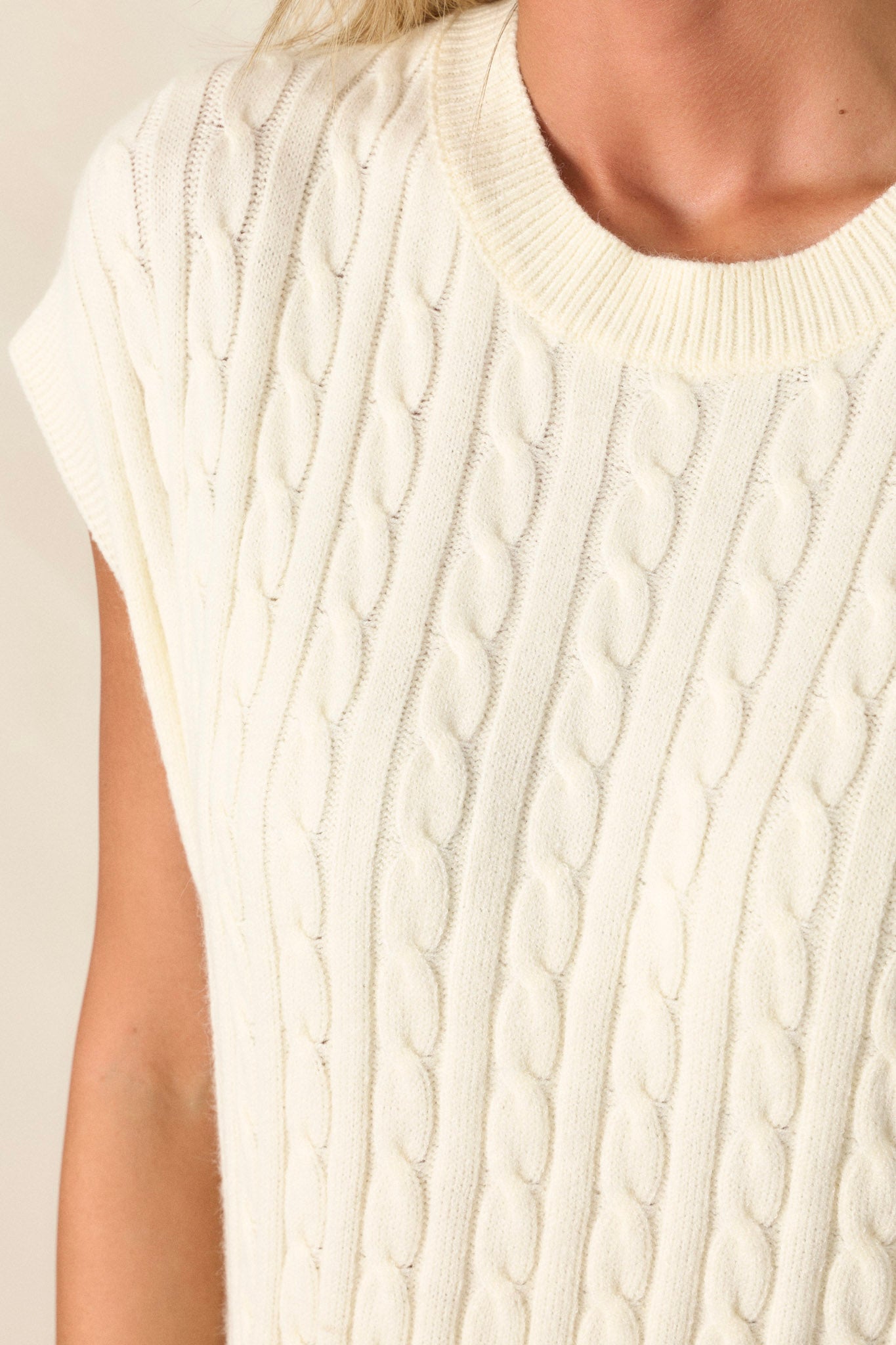 Stay cozy and chic with our Talking To You Taupe Cable-Knit Sleeveless Sweater. Embrace the soft and warm feel of its cable-knit design in a versatile cream hue. Perfect for layering or wearing on its own, this sweater adds a touch of effortless style to any outfit. This white top features a cable-knit design, a ribbed neckline and a ribbed waistline.