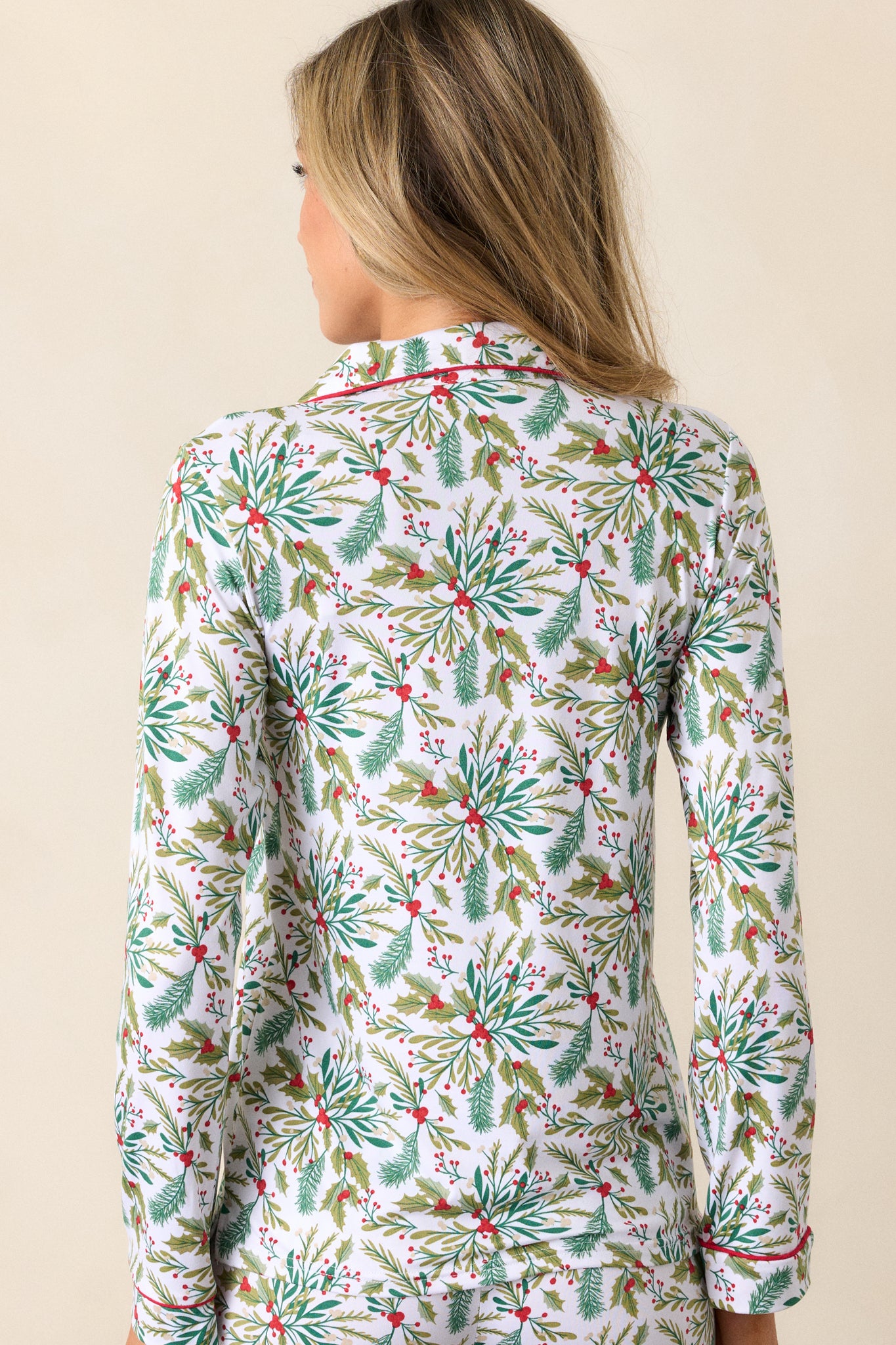 Cozy up this holiday season in our Under the Mistletoe Ivory Pajama Top. With a soft and breathable fabric, you'll stay cool and comfortable all night long. The festive print and relaxed fit make it the perfect choice for your holiday lounging. Spread some cheer and treat yourself to this must-have pajama top. This ivory pajama top features a collared neckline, a mistletoe print, a front breast pocket, red trim, and long sleeves.