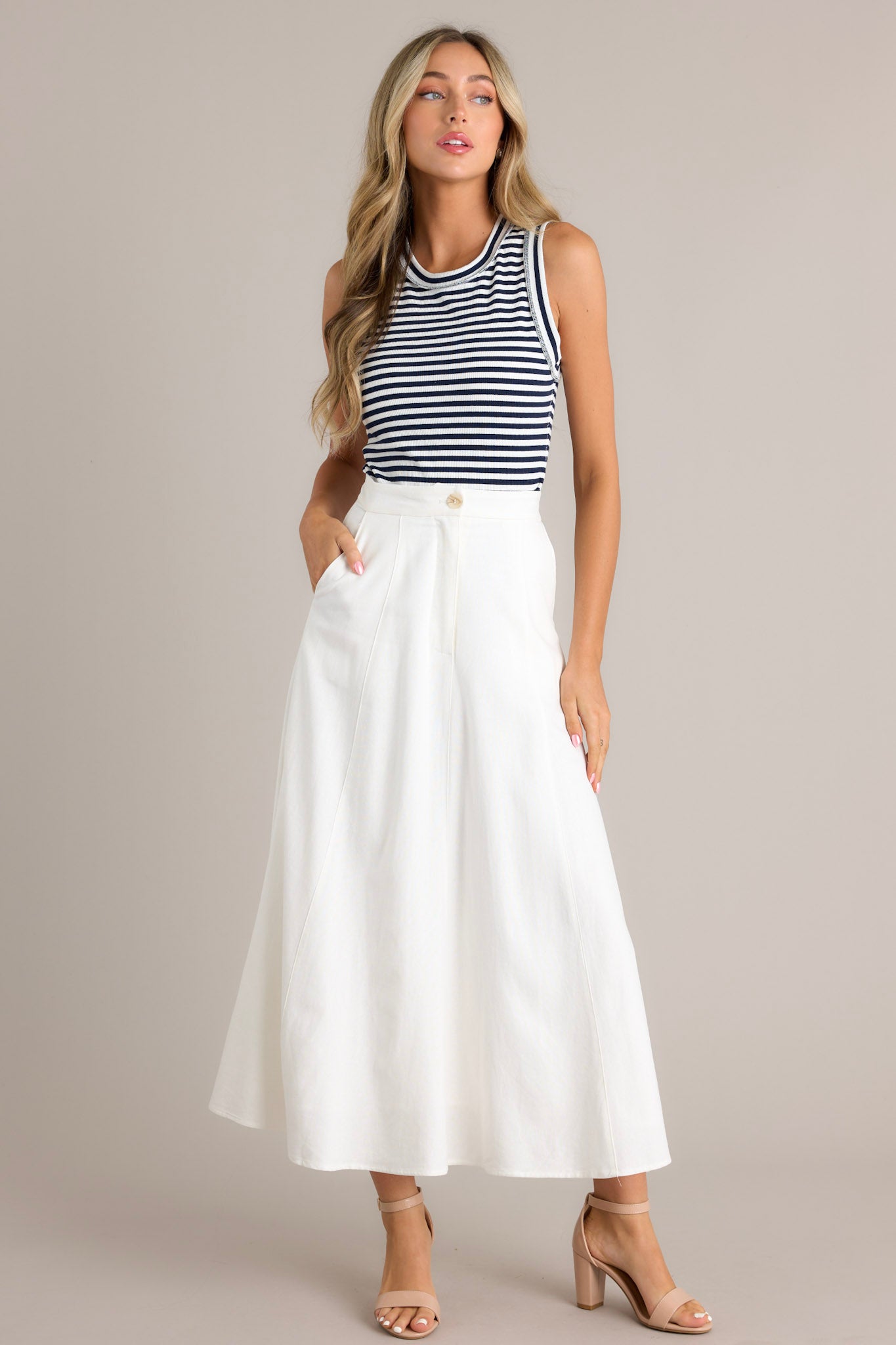 Unleash your Unfiltered Joy with this navy and white stripe tank! Made with high-quality fabric and a comfortable fit, this tank is perfect for any casual occasion. Let your carefree and playful side shine through with this fun and quirky tank. This tank features a ribbed scoop neckline, a classic stripe pattern, a ribbed texture, and a scoop hemline.