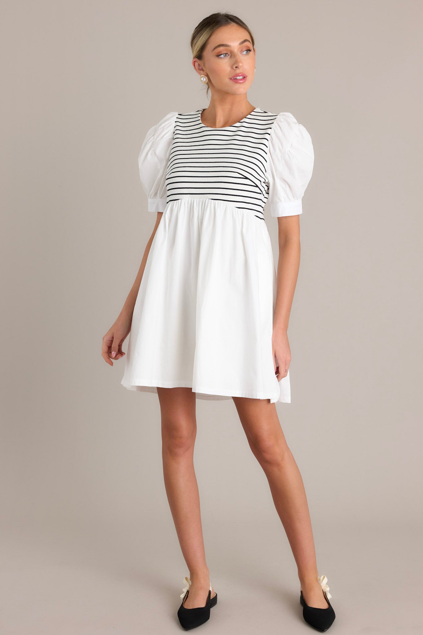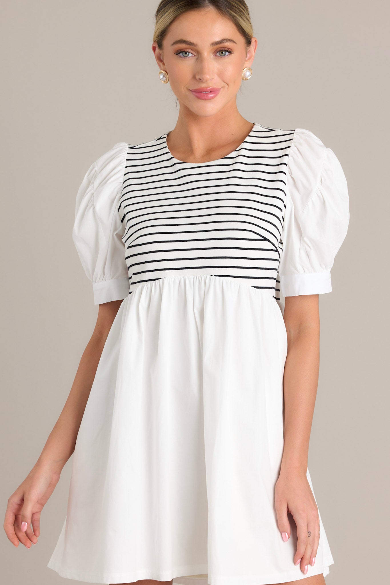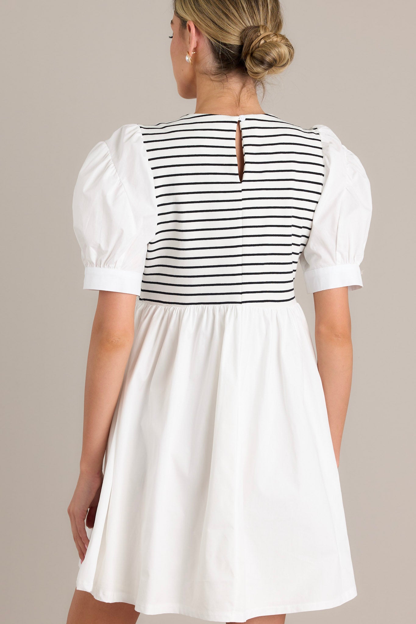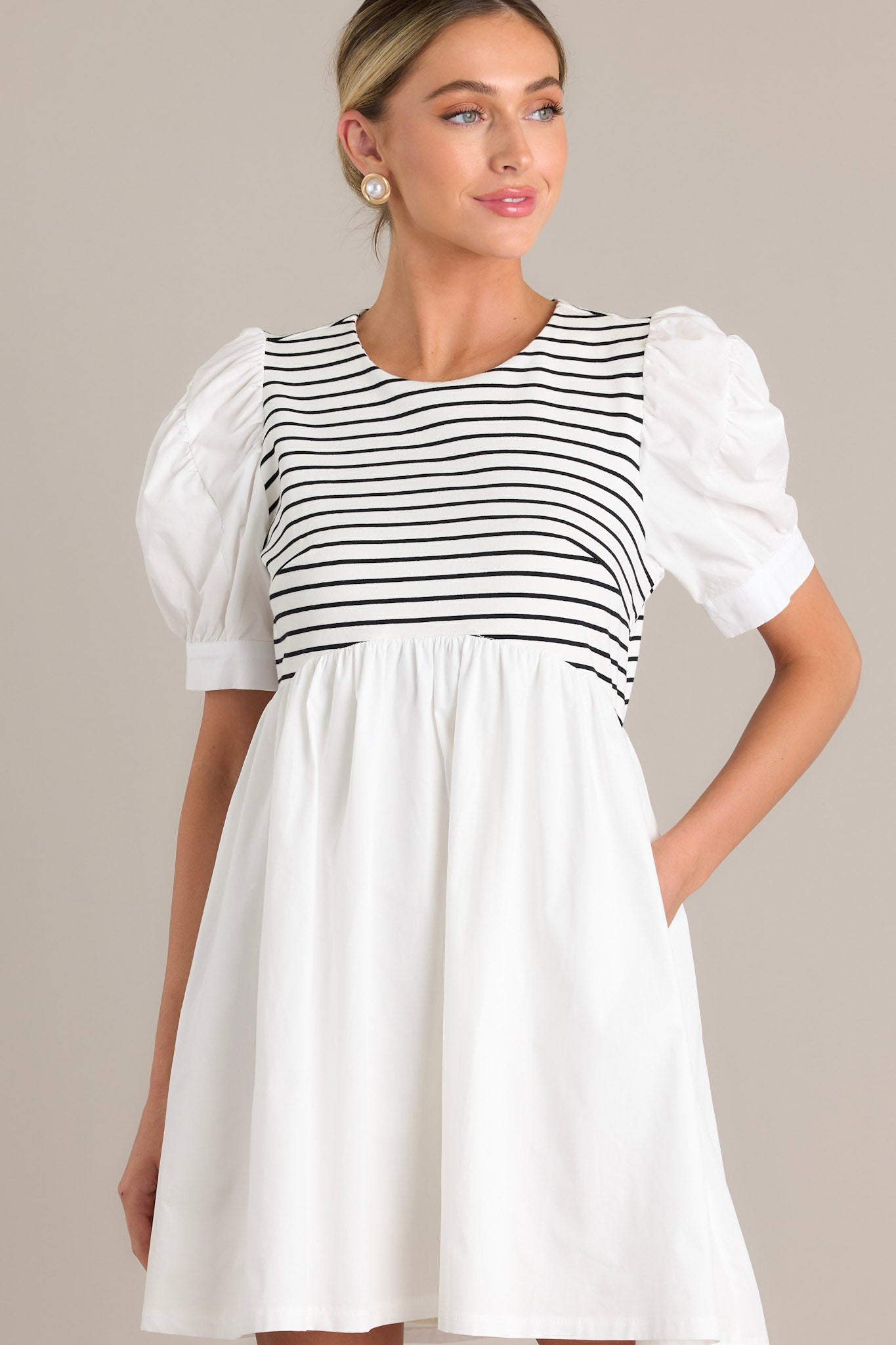 Get playful in the Urban Streak Black Stripe Mini Dress. This quirky dress features slimming black stripes and a mini length for a fun and flirty look. Perfect for a night out on the town or a casual day out. Don't miss out on this must-have piece for your wardrobe! This stripe mini dress features a round neckline, a keyhole with a functional button, a striped bodice, functional hip pockets, and short cuffed puff sleeves.