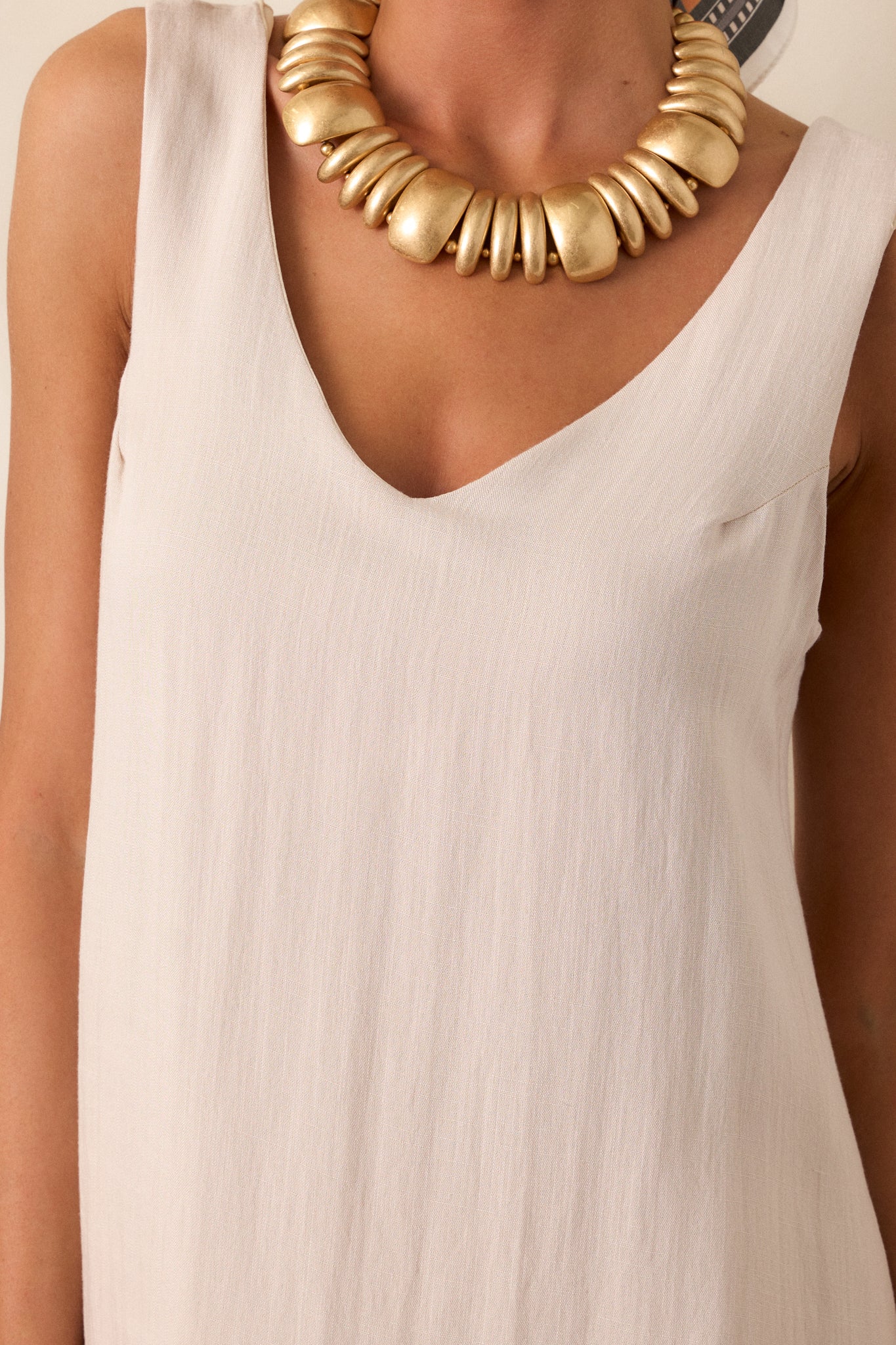 Indulge in effortless elegance with our Wandering Mind Ivory Sleeveless Mini Shift Dress. This mini dress boasts a timeless design that will take you from day to night with ease. Made from high-quality materials, it is comfortable and versatile. Perfect for any occasion, it's a must-have in your wardrobe! This ivory mini dress features a v-neckline, a sleeveless design, two functional hip pockets, and a shift silhouette.