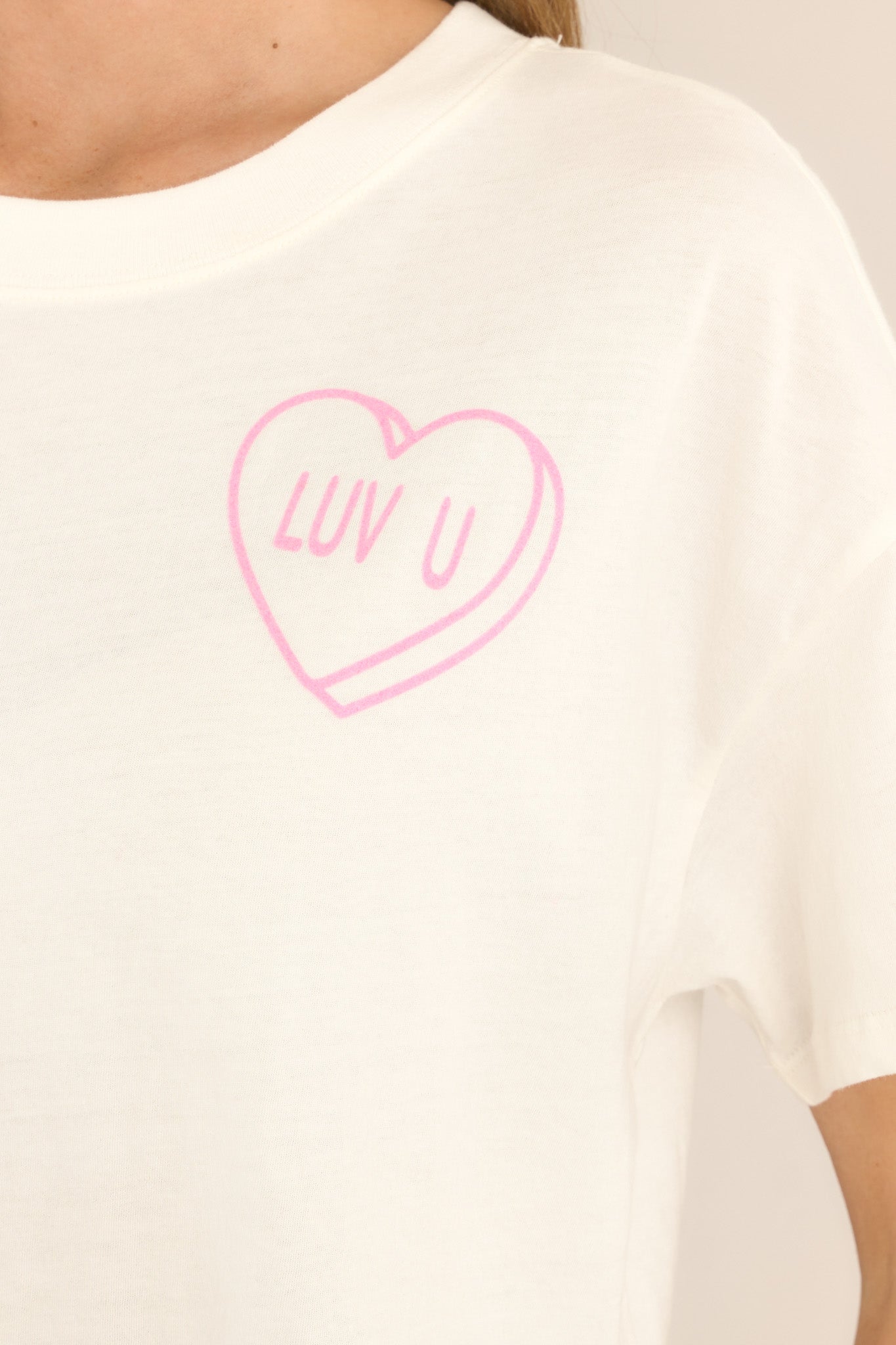 Spread some love with the Z-Supply Luv U Vanilla Ice Tee. With its comfortable fit and unique style, it's sure to be your new go-to. Perfect for any casual outing or lounging around the house, it's sure to bring a smile to everyone's face. You'll "Luv" this quirky and fun tee! This tee features a crew neckline, dropped shoulders, a festive graphic, and a split hemline.
