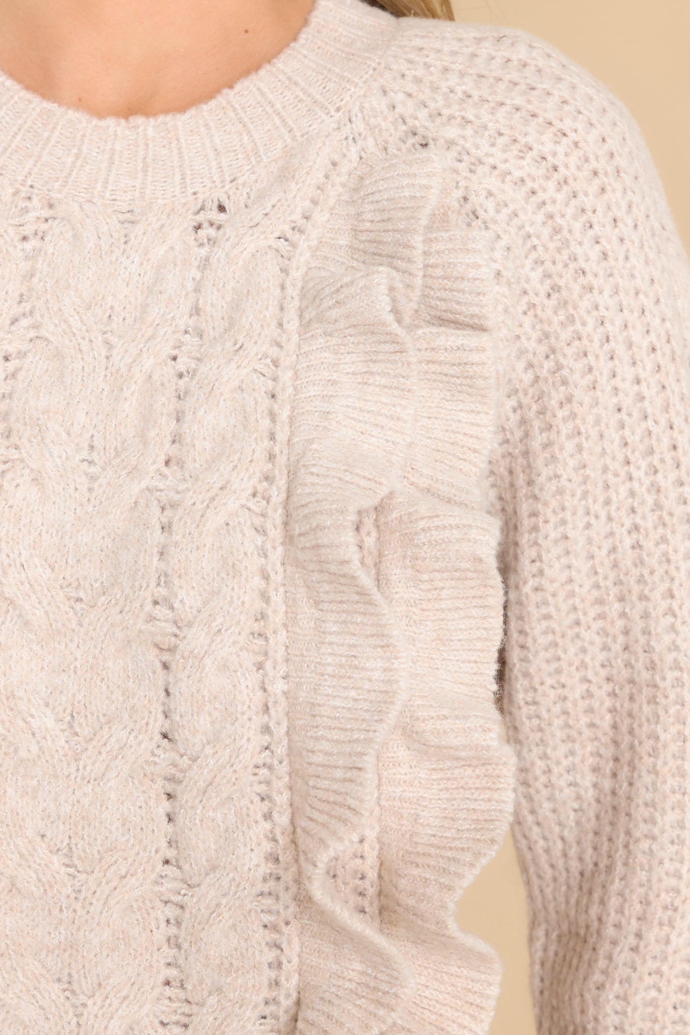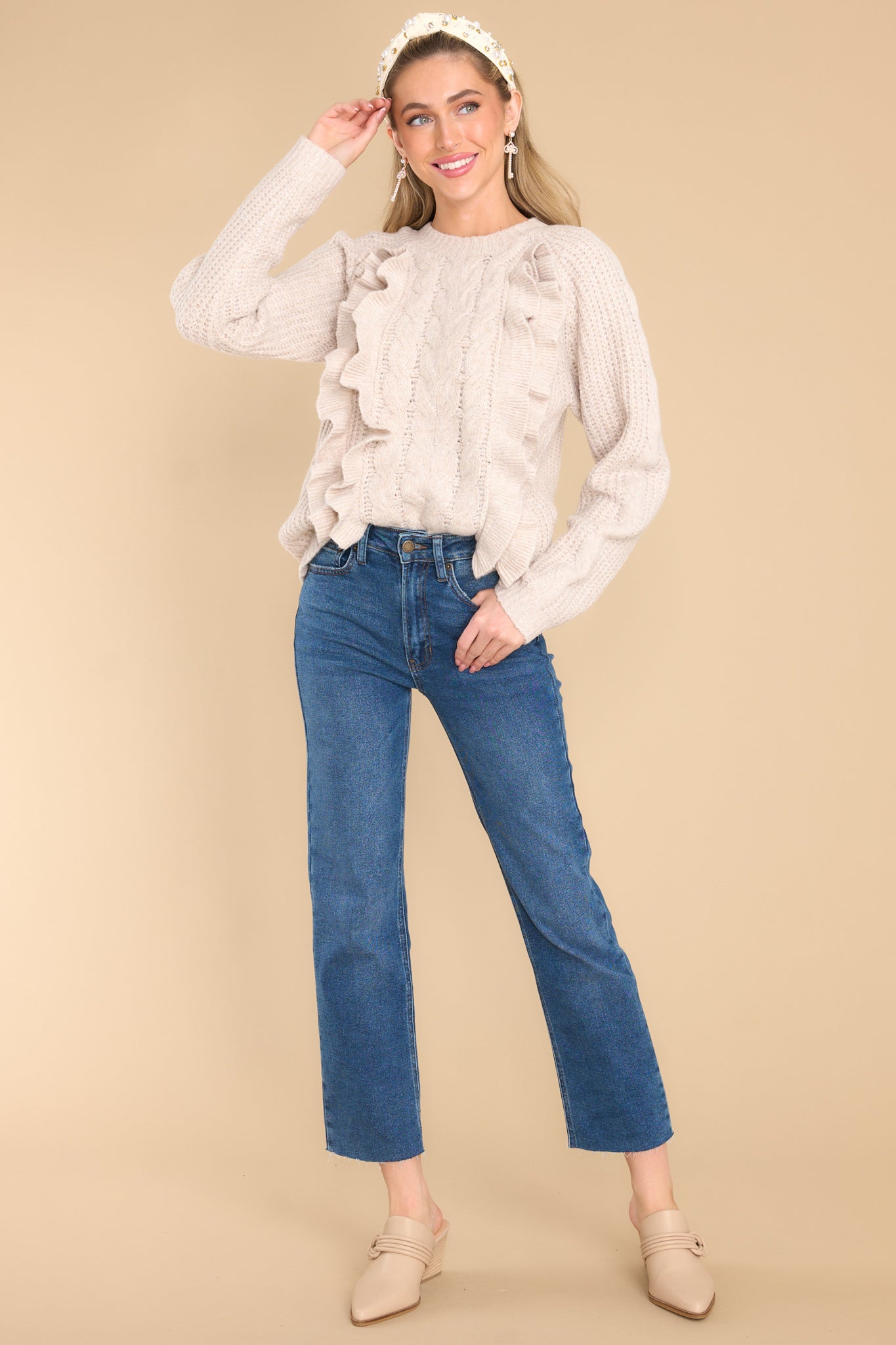Full-length view of beige pants featuring a high-waisted design, fitted waistband, slight pleats, functional hip pockets, and a wide leg silhouette Front view of beige pants featuring a fitted waistband, high-waisted design, hook and zipper closure, slight pleats in the leg, functional hip pockets, and a wide leg.