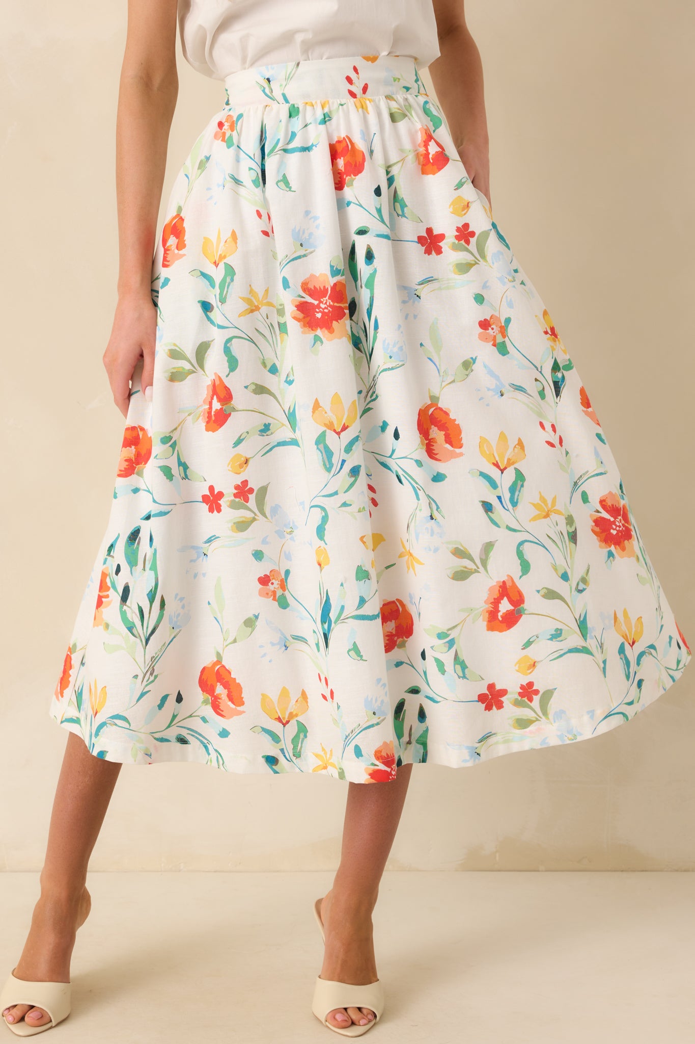 A cropped front view of the ivory ankle boots showing a smooth faux leather upper, pointed toe, and tan stacked block heel. A cropped side angle highlighting the tonal faux suede back panel and inner side zipper closure.