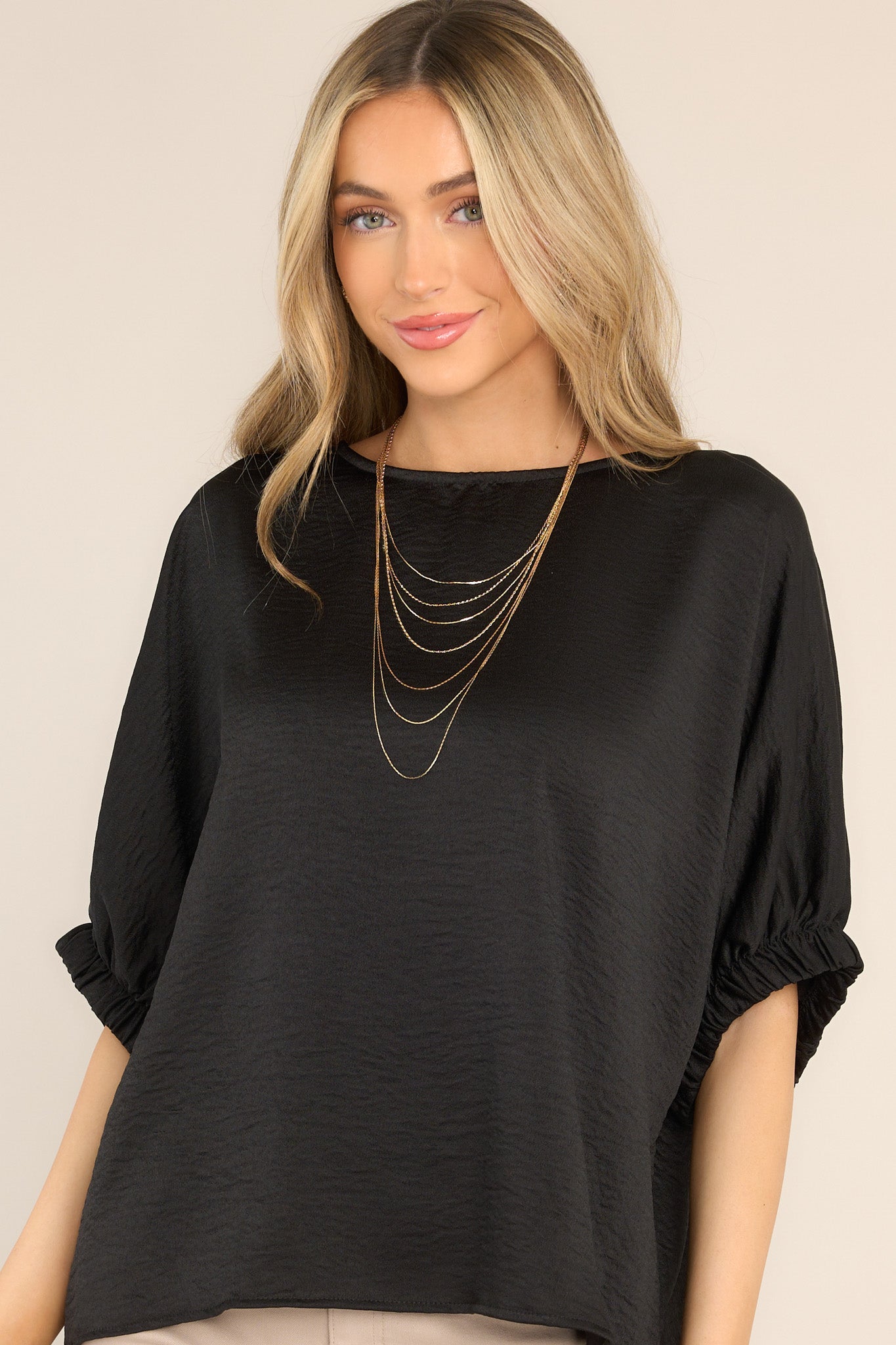 This top features a crew neckline, a satin-like material, and elastic cuffed short sleeves.
