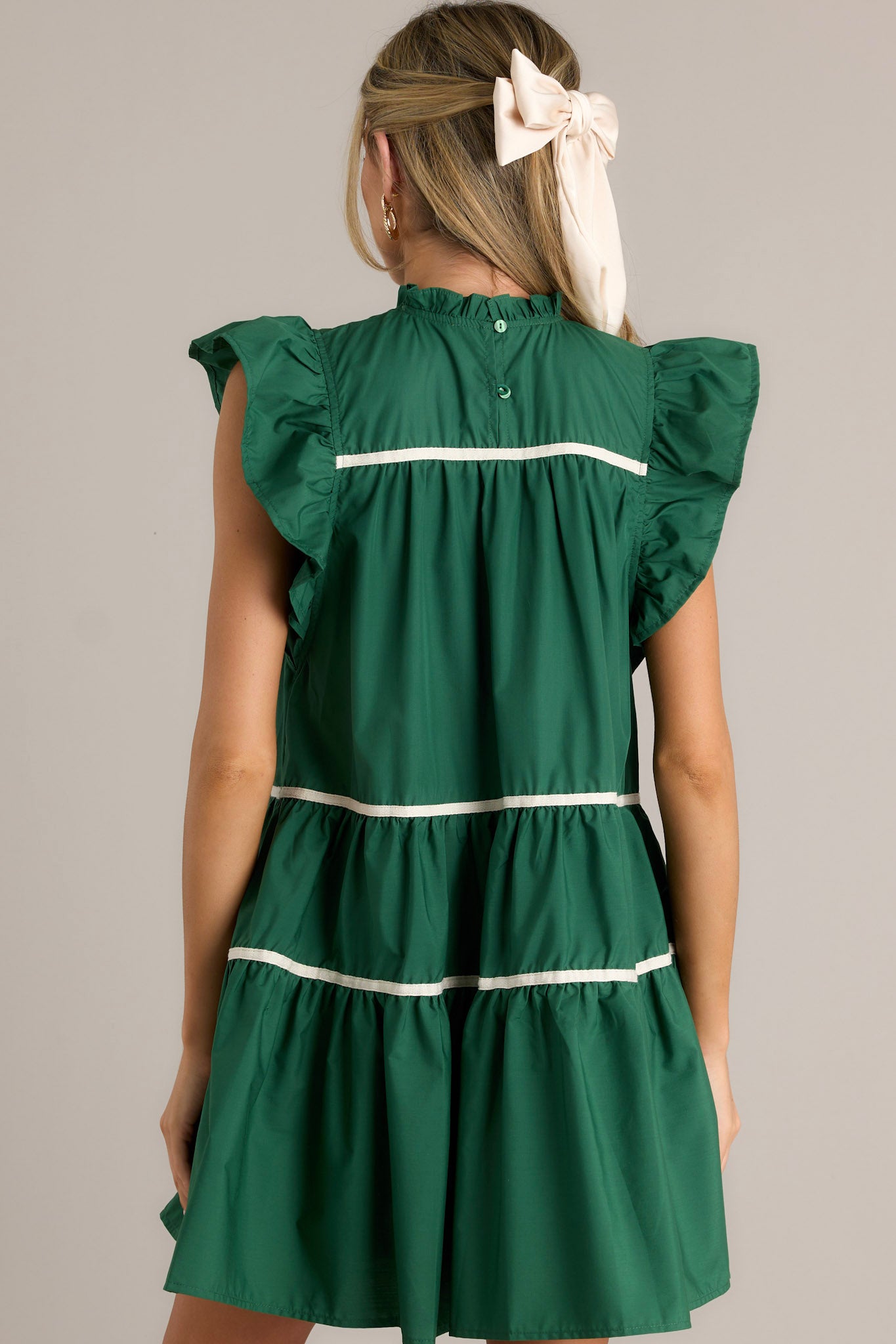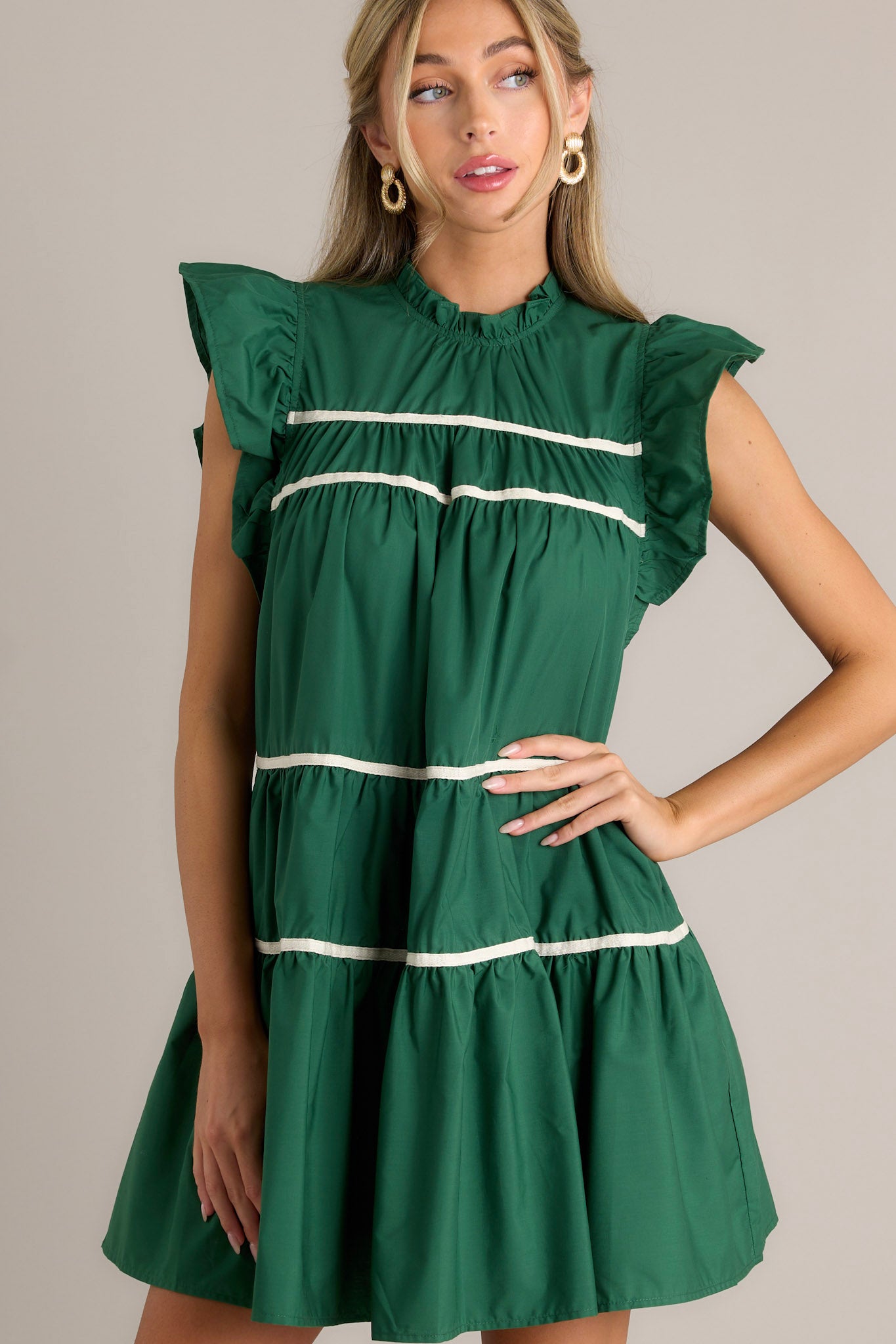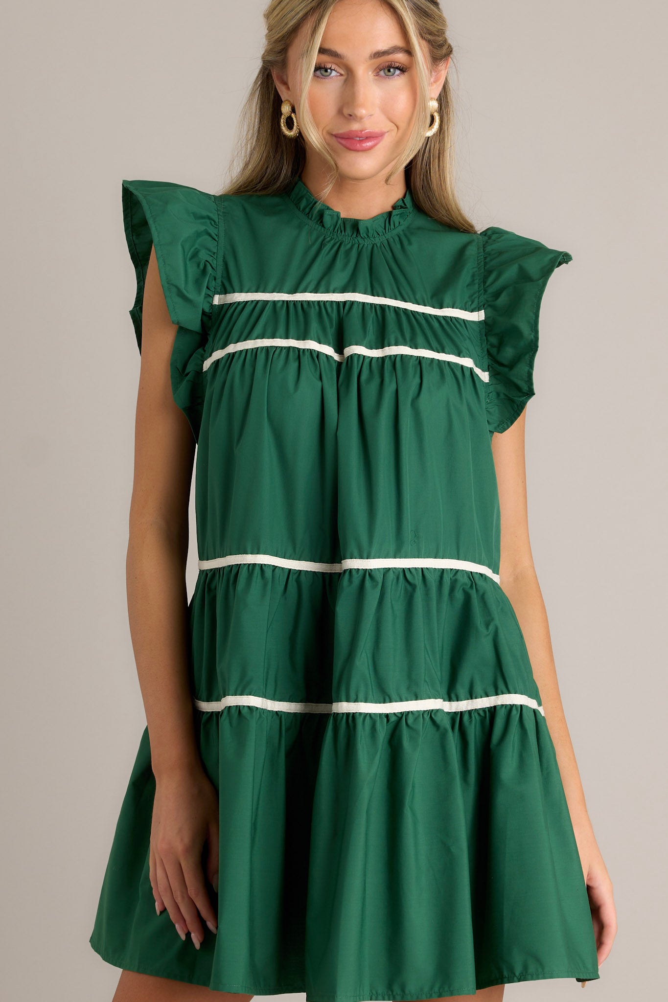 Go on a fashion adventure with our All Around The World 100% Cotton Green Mini Dress! This playful dress features a vibrant green color that will turn heads wherever you go. Perfect for any occasion, it's sure to make a statement and add a pop of color to your wardrobe. This green dress features ruffled sleeves, a round ruffle neckline, and two functional pockets.