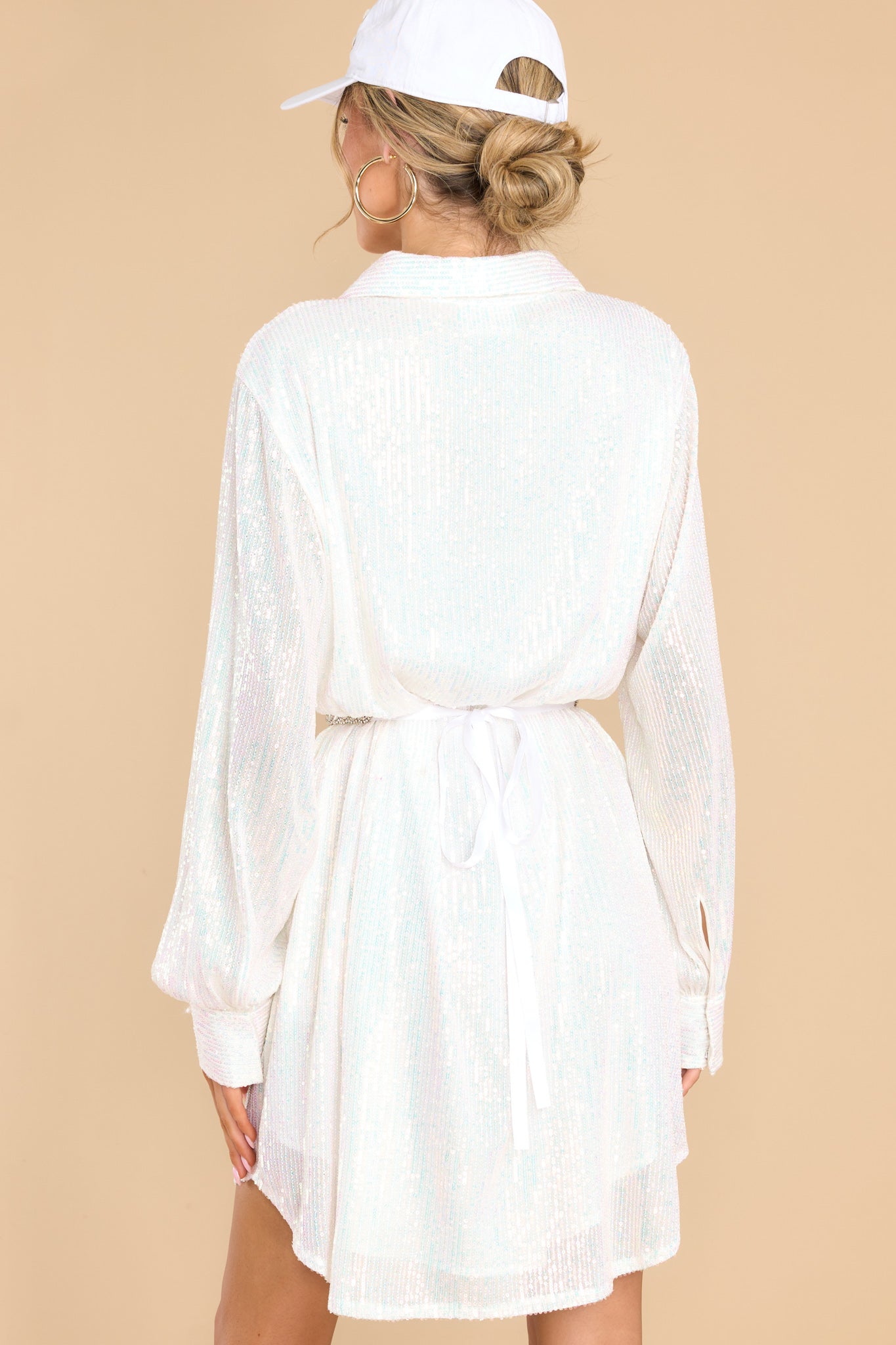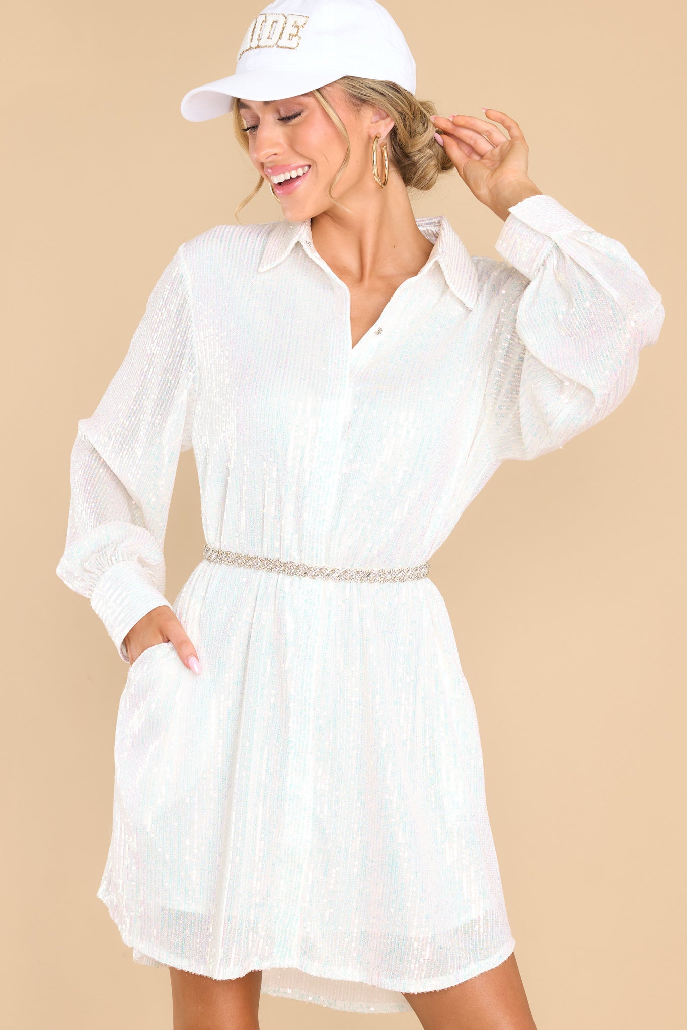 Stand out from the crowd and add some pizazz to any outfit with this All That Jazz White Sequin Dress! This essential piece is sure to catch the eye with its stunning sequins - making it the perfect way to turn heads and add a little dazzle to your style! This dress features a collared neckline, functional buttons down the front, sheer long sleeves, and sequin embellishments throughout. • 100% Polyester • Hand Wash Cold • Lined 65% Rayon, 35% Polyester • Imported