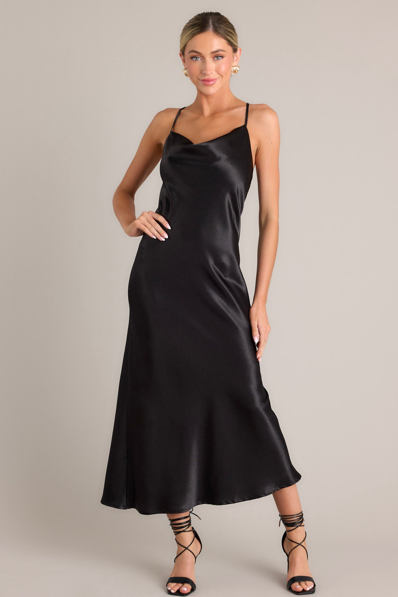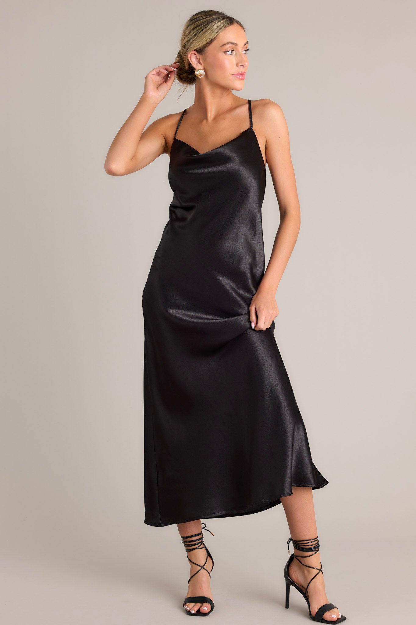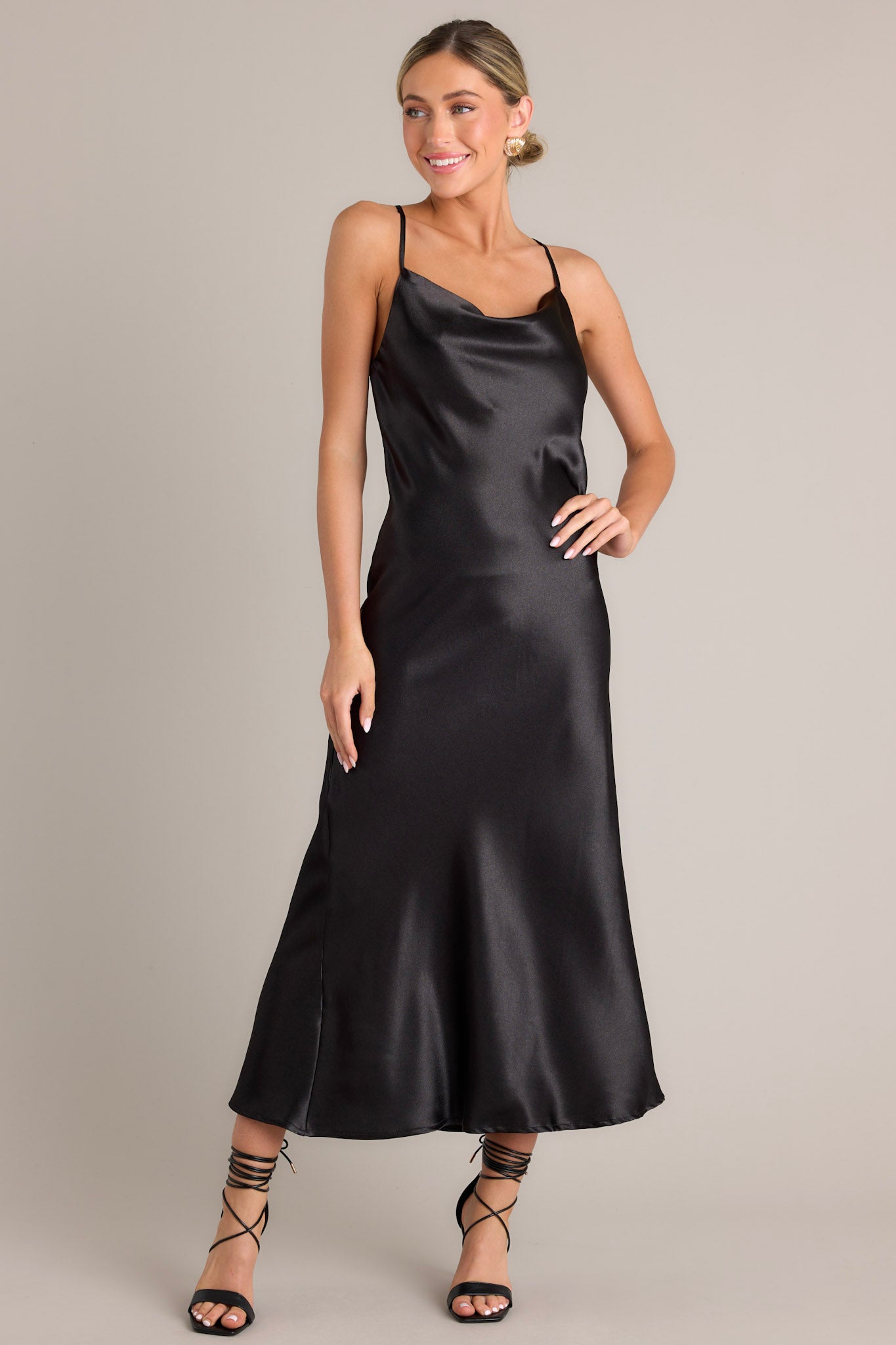 Wrap yourself up in this black cowl neck maxi dress and steal the show! Perfect for any formal occasion, this dress is yours for the taking (pun intended!). This elegant black dress features a satin-like fabric, adjustable straps, and a cowl neckline