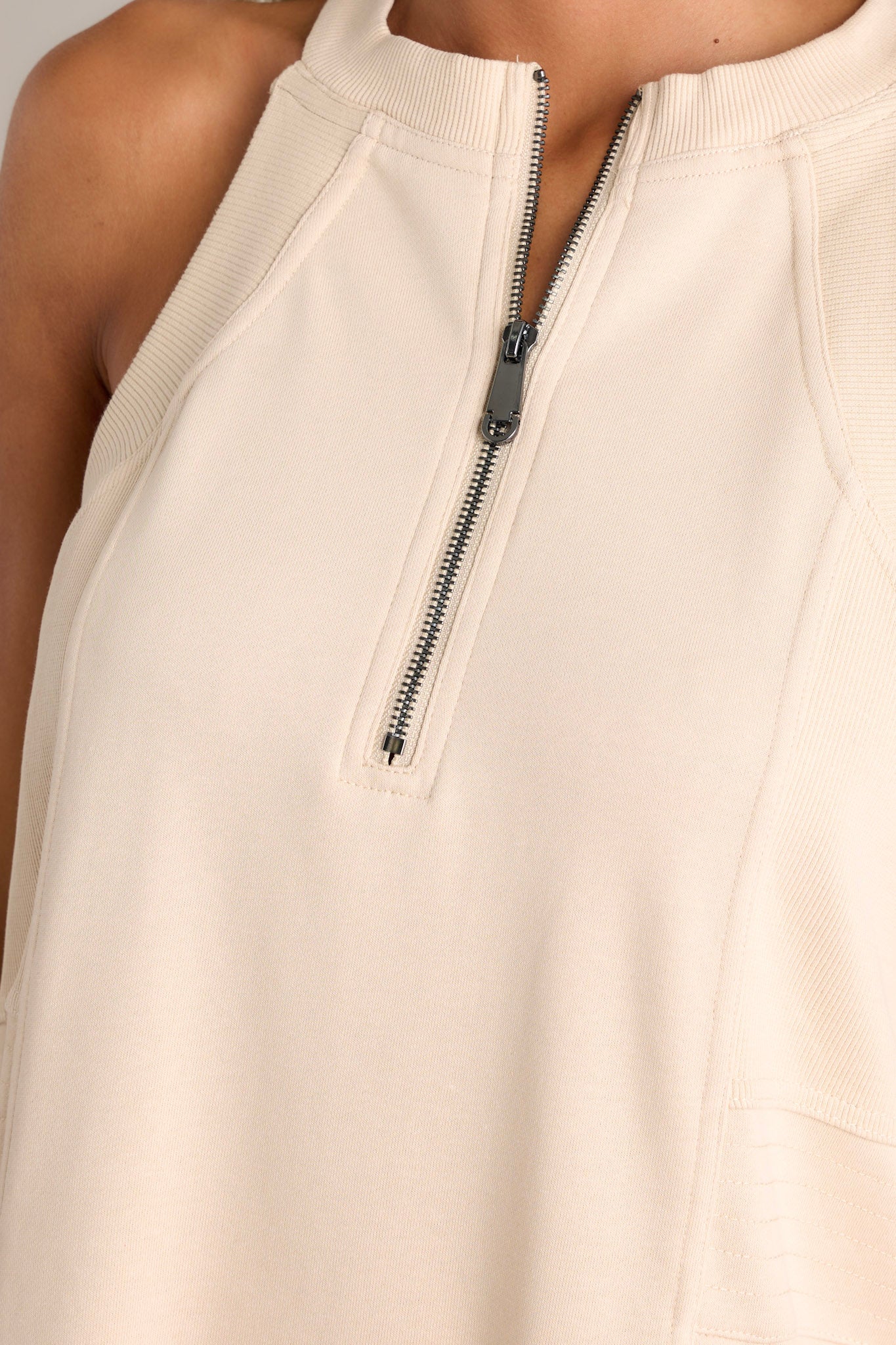 Stay comfortable and stylish with our Always Reliable 100% Cotton Beige Mini Dress. Made with soft cotton, this dress is perfect for any occasion. Whether you're running errands or going out with friends, this dress will keep you feeling confident and comfortable. This beige mini dress features high neckline, a functional zipper, textured sides, functional hip pockets, and a thick hemline.