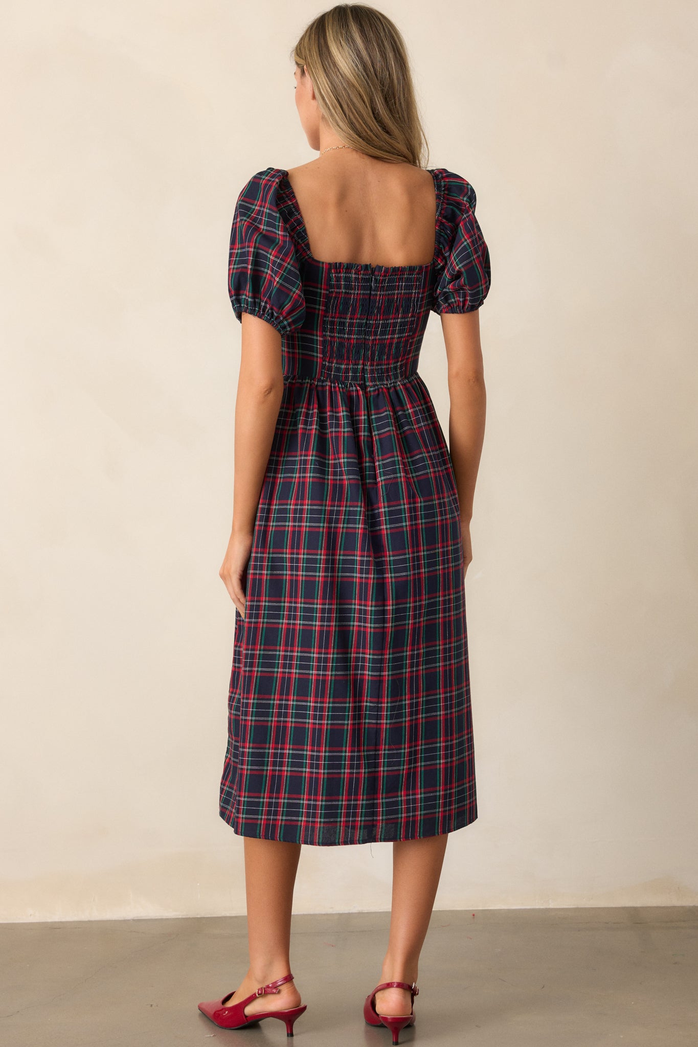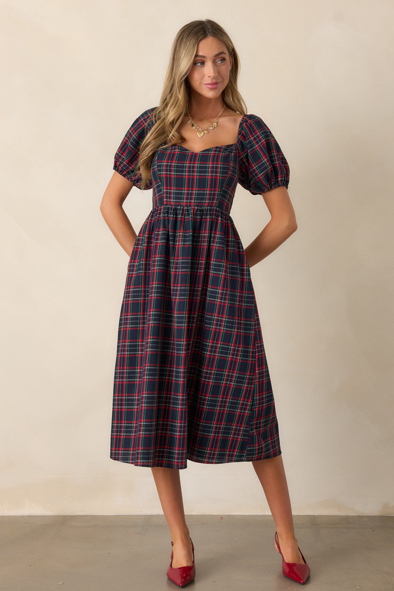 Always You Cotton Navy Plaid Puff Sleeve Midi Dress
