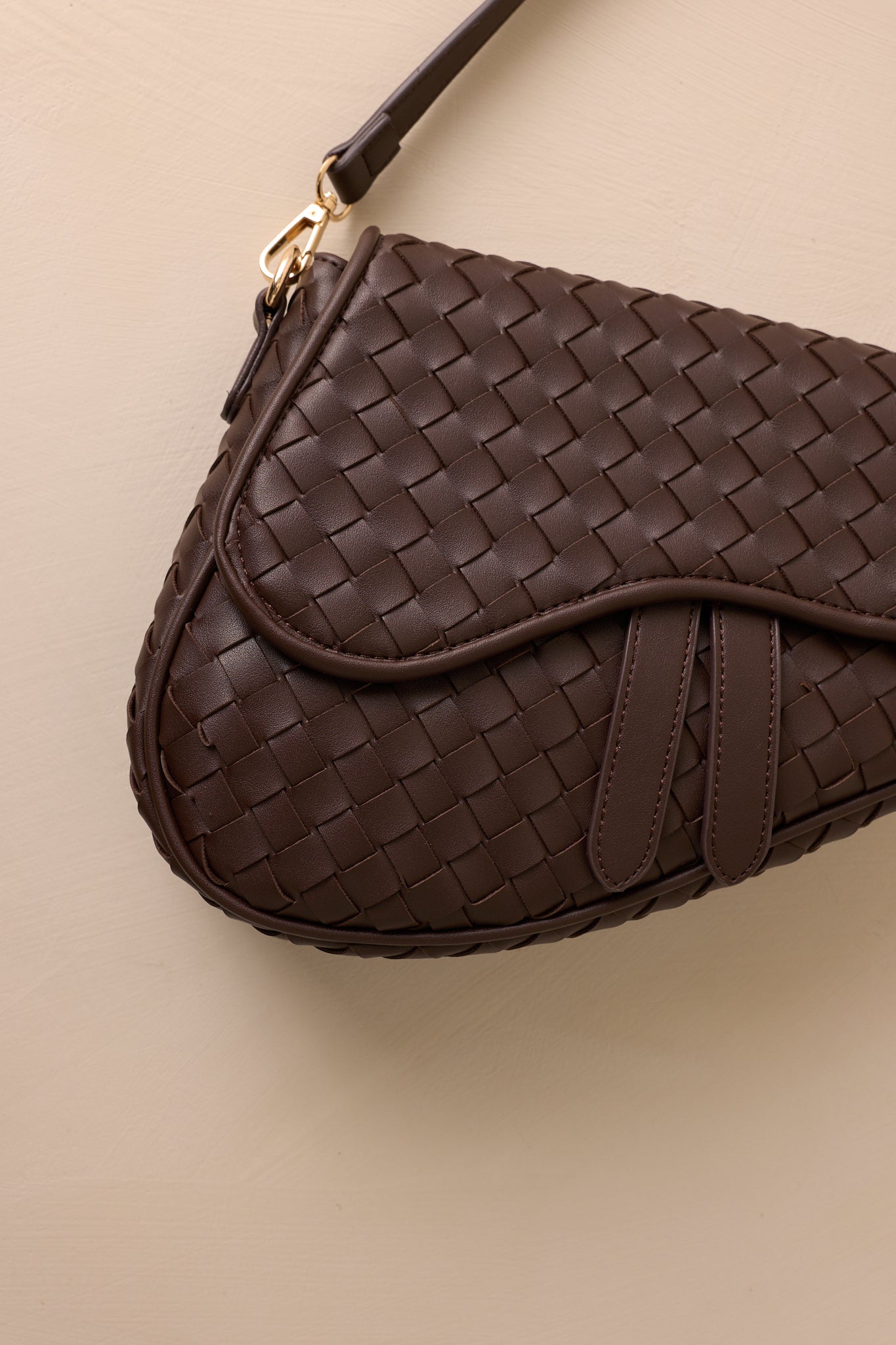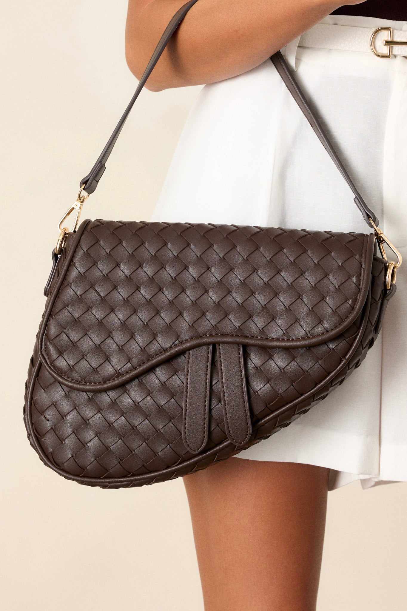 Upgrade your style with our Around City Streets woven brown saddlebag. Perfect for navigating the city streets, this saddlebag is both stylish and practical. Its woven design adds a touch of sophistication, while its spacious interior allows you to carry all your essentials on the go. Travel in style and convenience with our saddlebag. This brown handbag features gold hardware, faux leather, a woven design, a magnetic snap closure, a zipper pocket, and an additional strap.