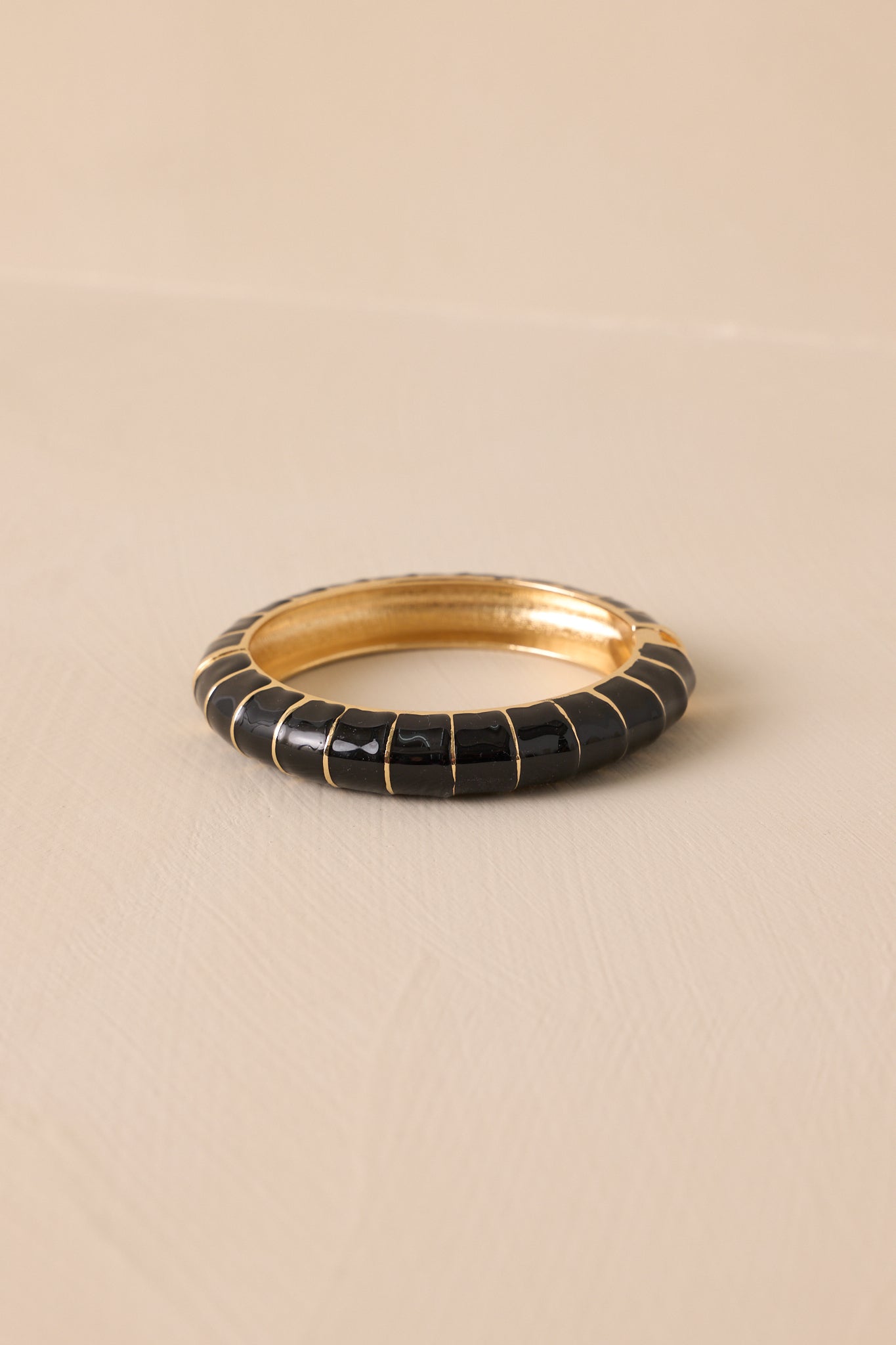 Upgrade your jewelry game with our Better Miss Me Black & Gold Hinged Bracelet. Made with high-quality materials, this bracelet adds a touch of sophistication to any outfit. The hinged design ensures a comfortable fit while its sleek black and gold color combination adds an elegant touch. This hinged bracelet features a black and gold pattern, a gold inside, and a hinge closure.