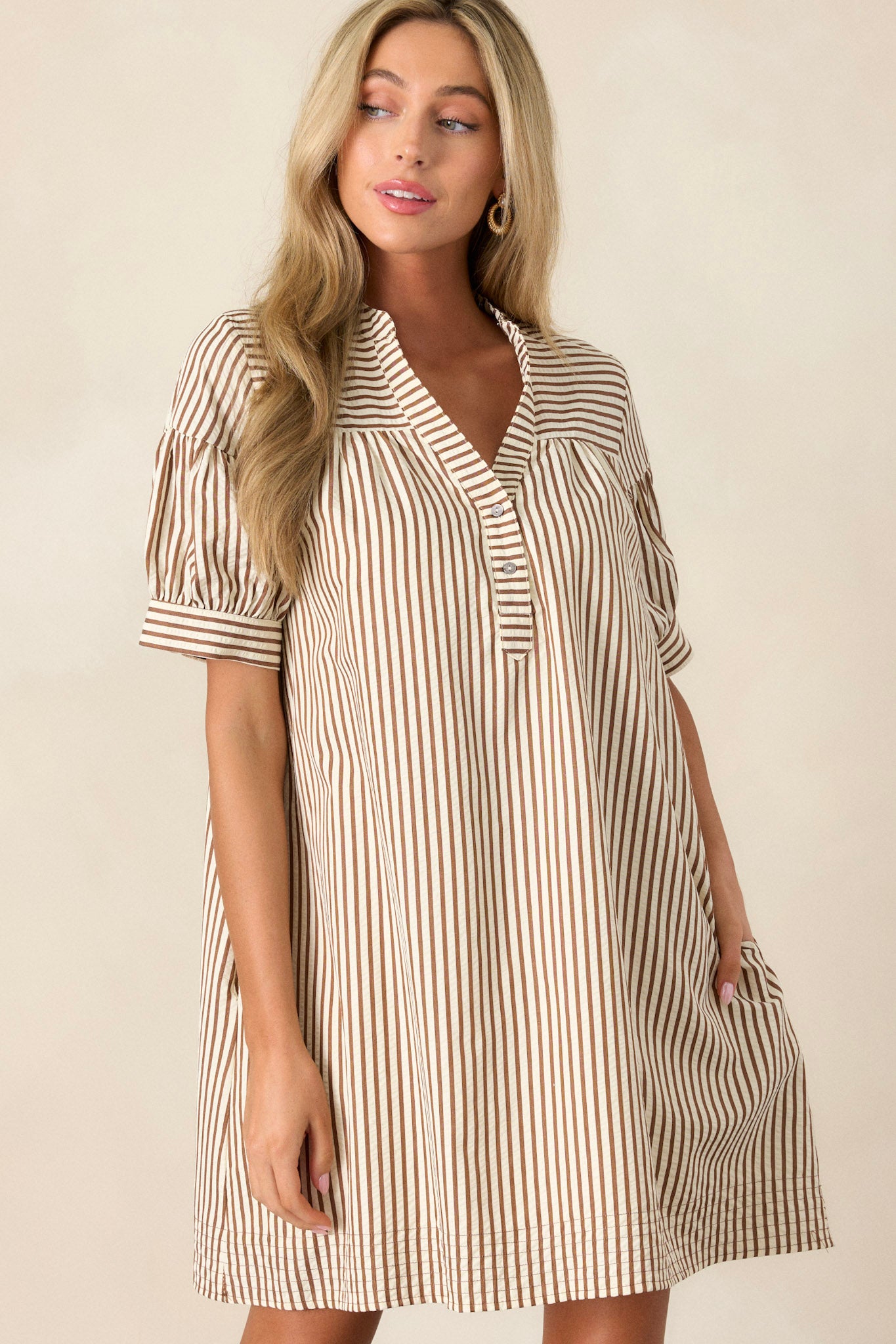 Look effortlessly chic in our Bitter Sweet Symphony Brown Stripe Mini Dress. Made with a classic brown and white stripe pattern, this dress is perfect for any casual or semi-formal occasion. The lightweight fabric and flattering silhouette provide both comfort and style. Elevate your wardrobe and feel confident in this versatile dress. This brown stripe dress features a v-neckline, a button up bust, a relaxed fit, a vertical brown and white stripe design and short sleeves.