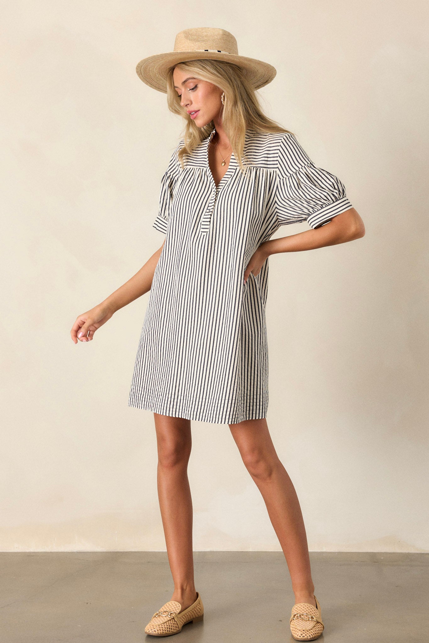 Look effortlessly chic in our Bitter Sweet Symphony Navy Stripe Mini Dress. Made with a classic navy and white stripe pattern, this dress is perfect for any casual occasion. The lightweight fabric and flattering silhouette provide both comfort and style. Elevate your wardrobe and feel confident in this versatile dress. This mini dress features a v-neckline, a button up bust, a relaxed fit, a vertical navy and white stripe design, and short sleeves.