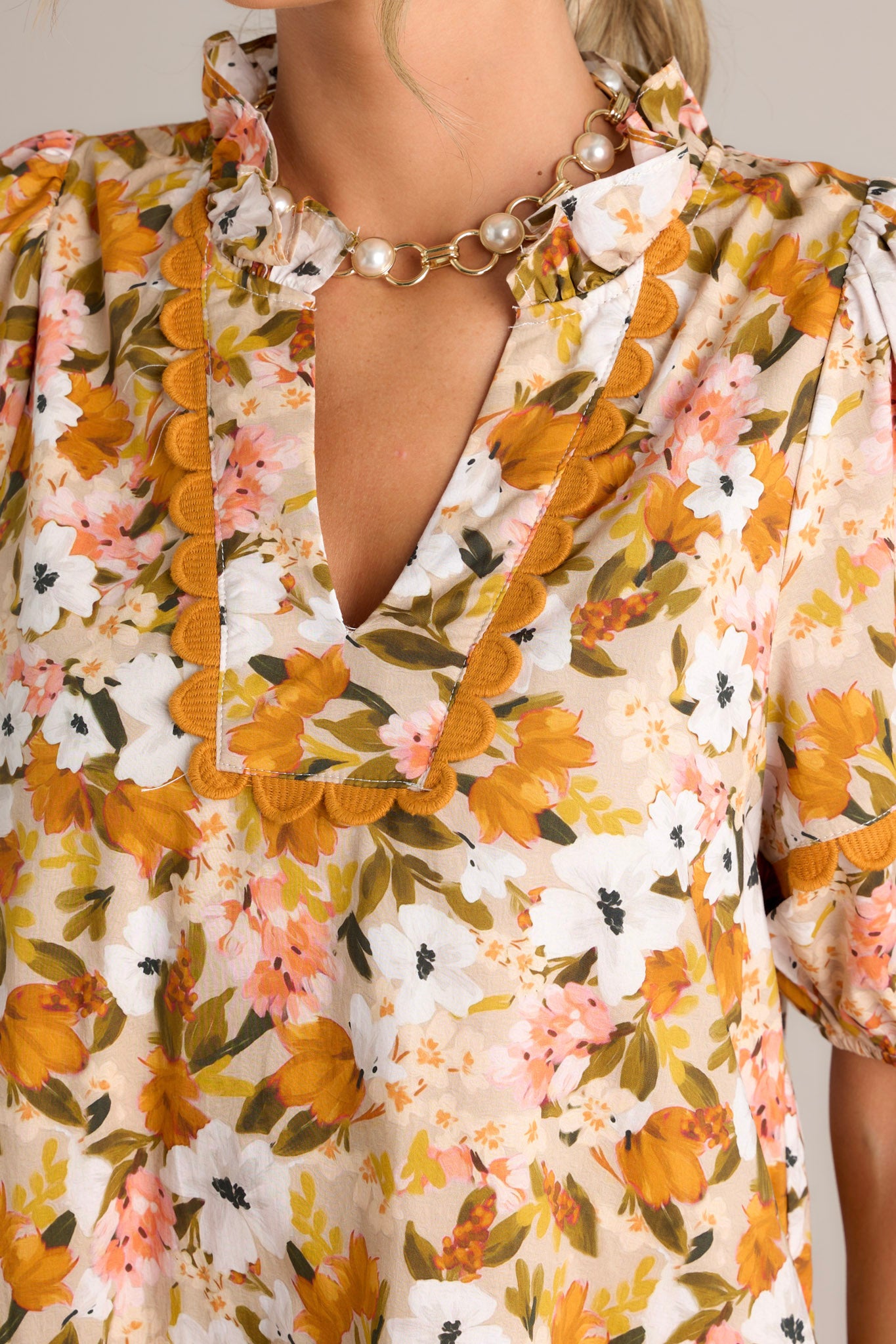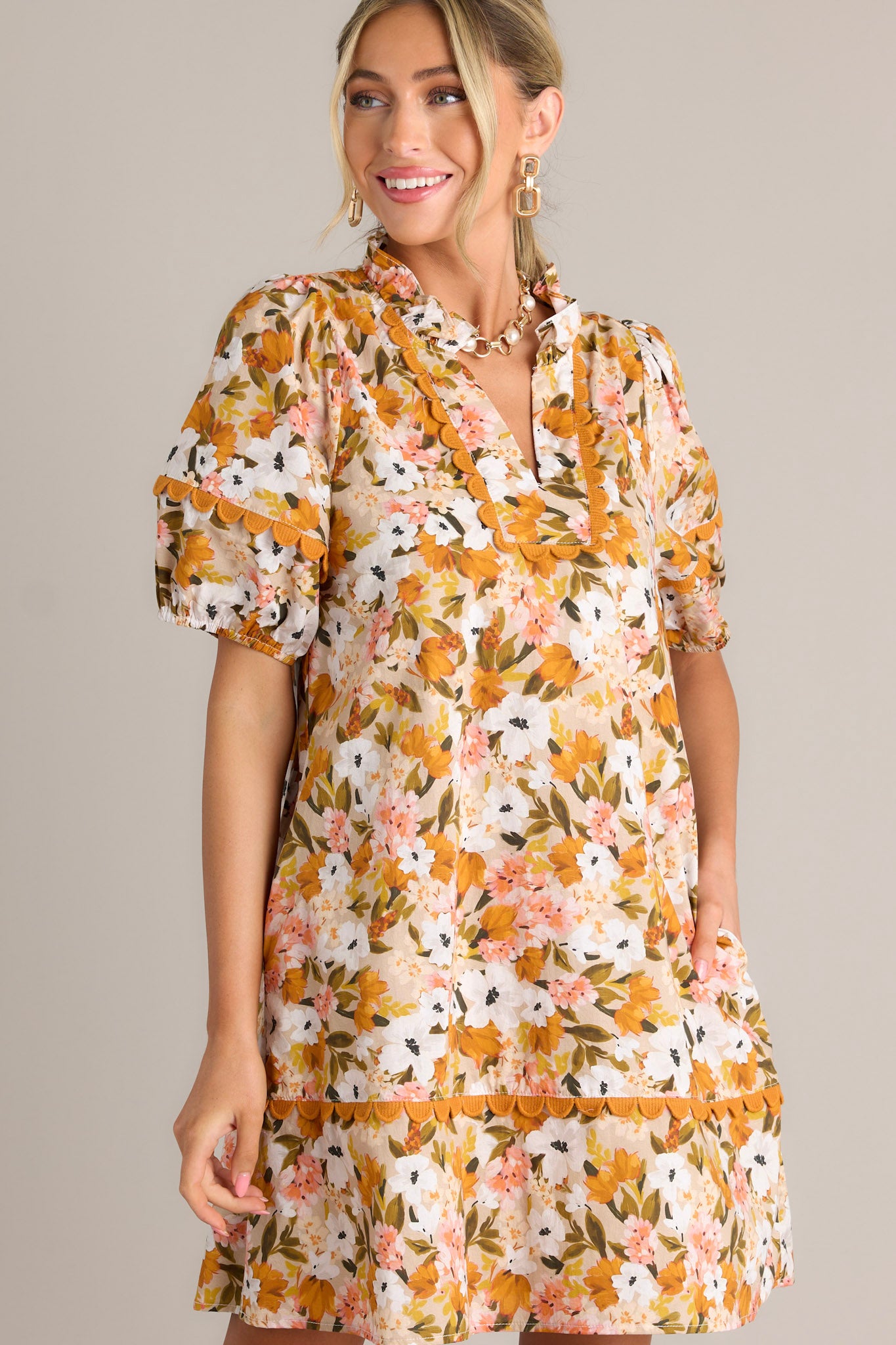 This 100% cotton mini dress is a Blissful Treasure with its honey yellow floral design. Perfect for sunny days, the soft material and playful print will keep you cool and stylish. Add a touch of quirkiness to your wardrobe with this unique piece. This yellow mini dress features a ruffled v-neckline, scalloped detailing, a relaxed fit, and elastic cuffed short sleeves.