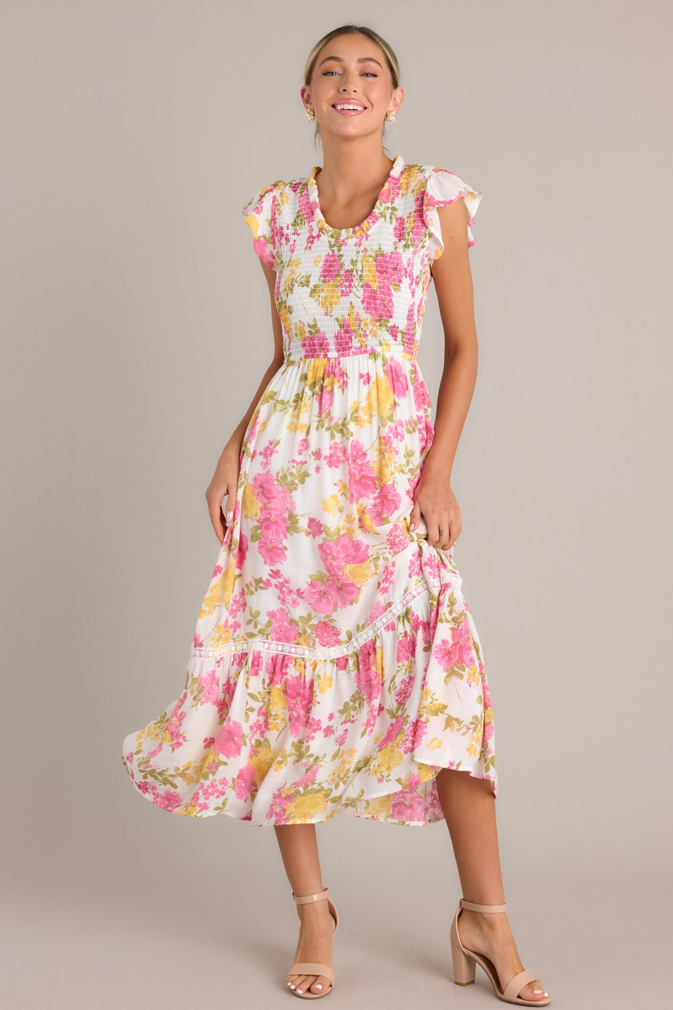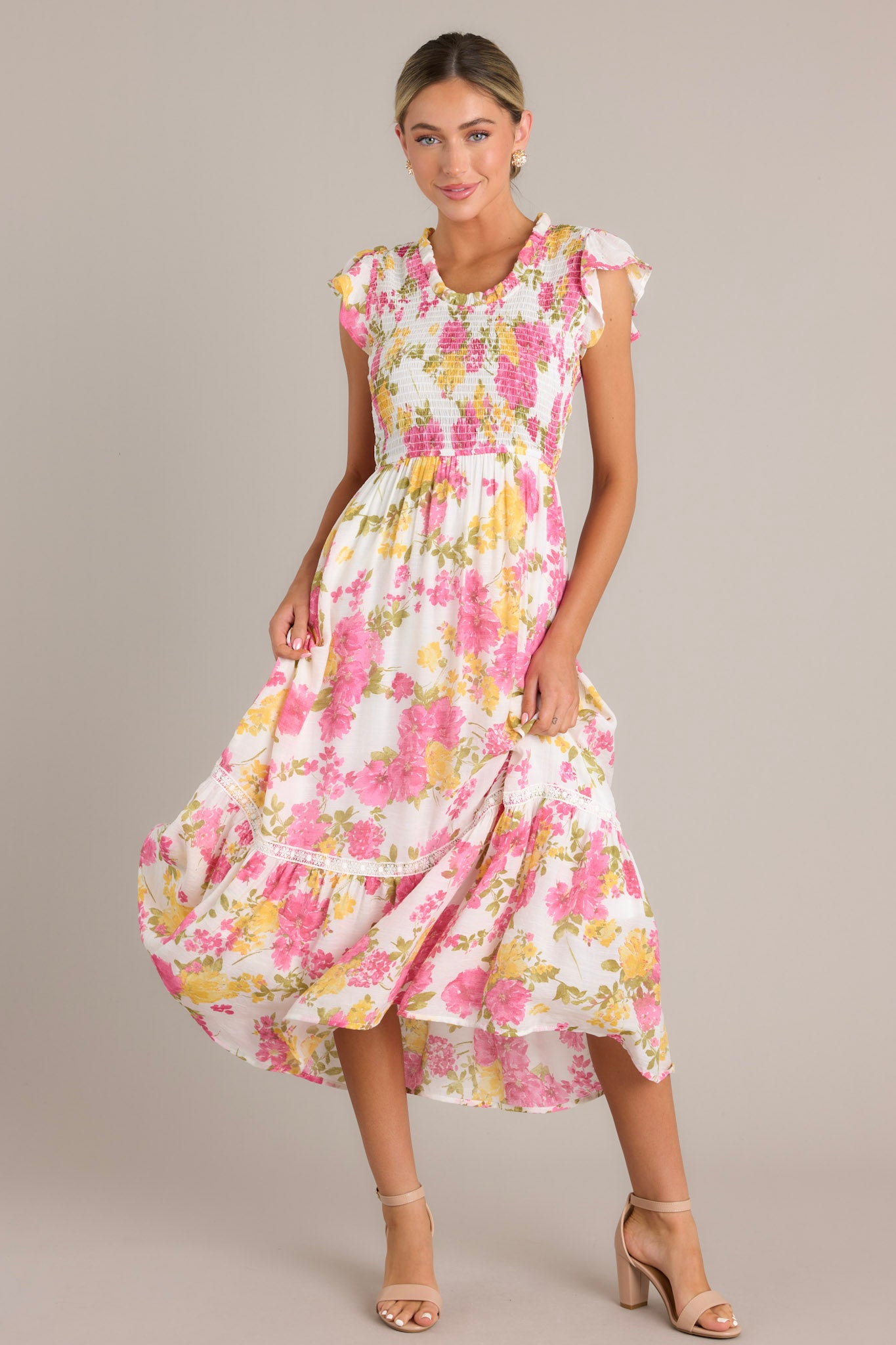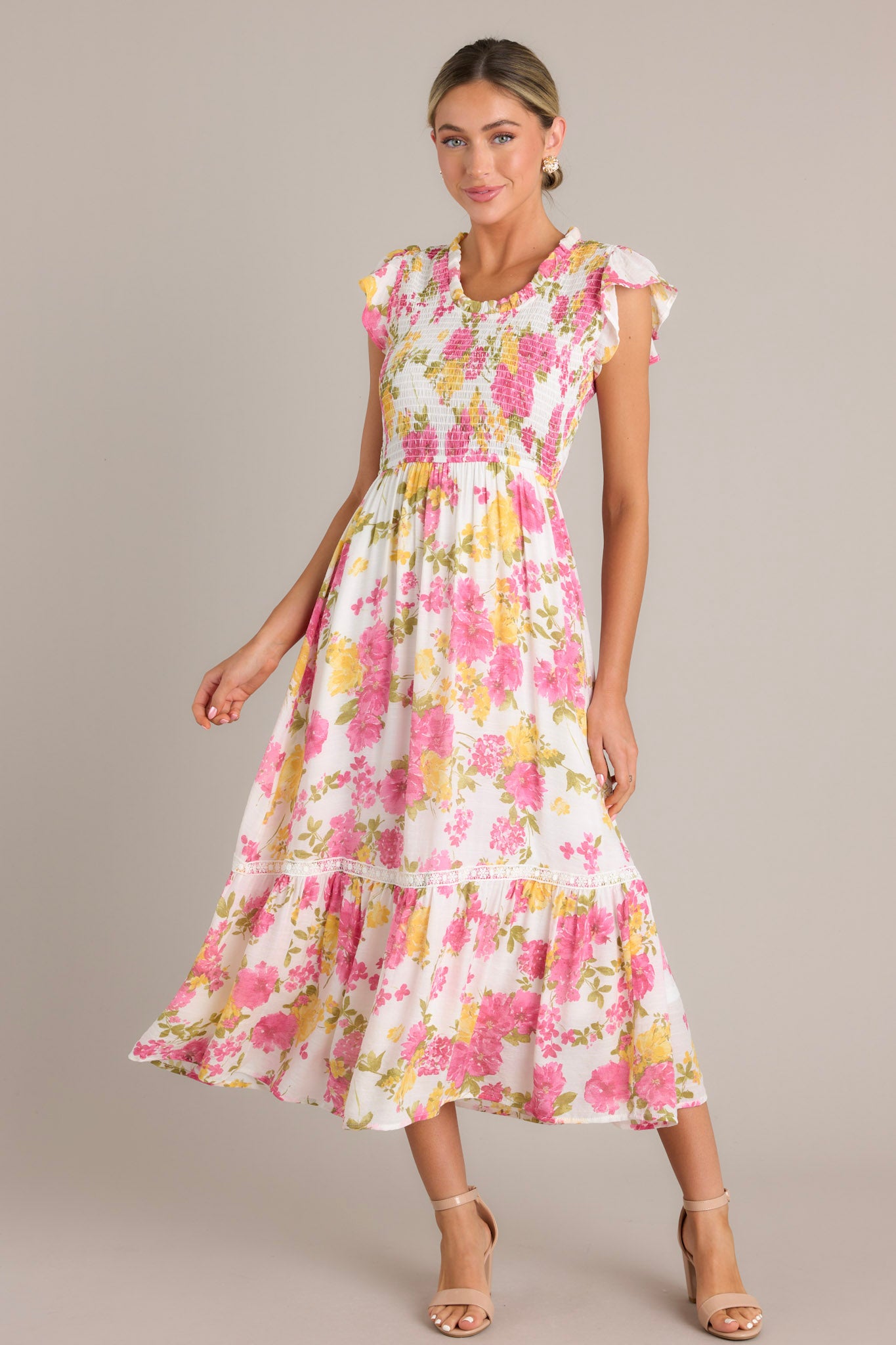 Ready to bloom? This playful midi dress features a burst of florals, perfect for your next picnic or garden party. With its unique mix of quirk and elegance, this dress is sure to make you stand out. Add some flair to your wardrobe with Bloom Burst! This white & pink floral midi dress features a ruffled scoop neckline, a fully smocked bodice, a single tier with lace detailing, and short flutter sleeves.