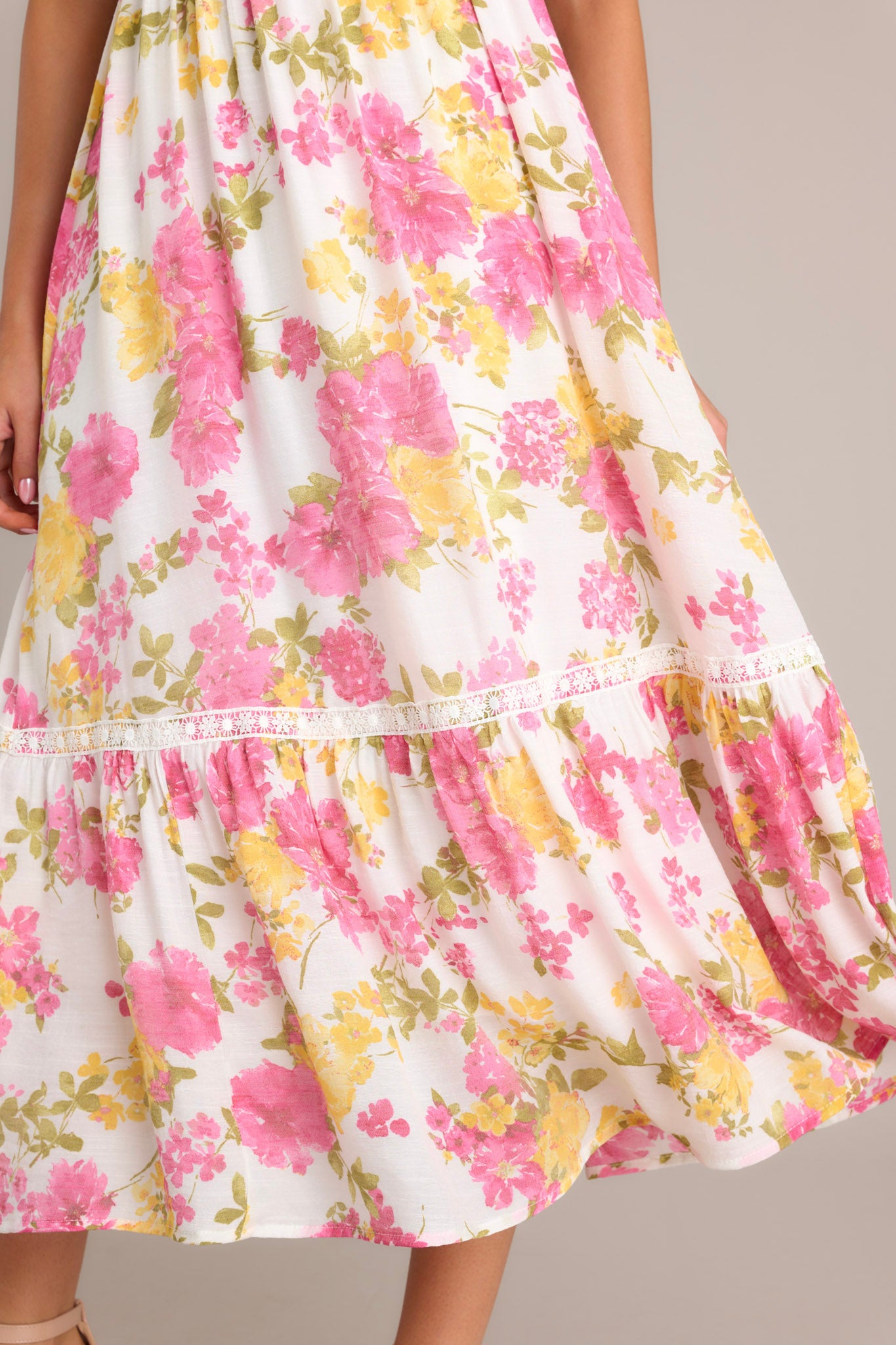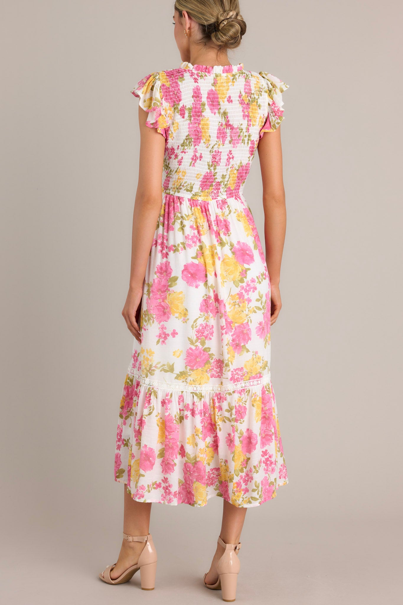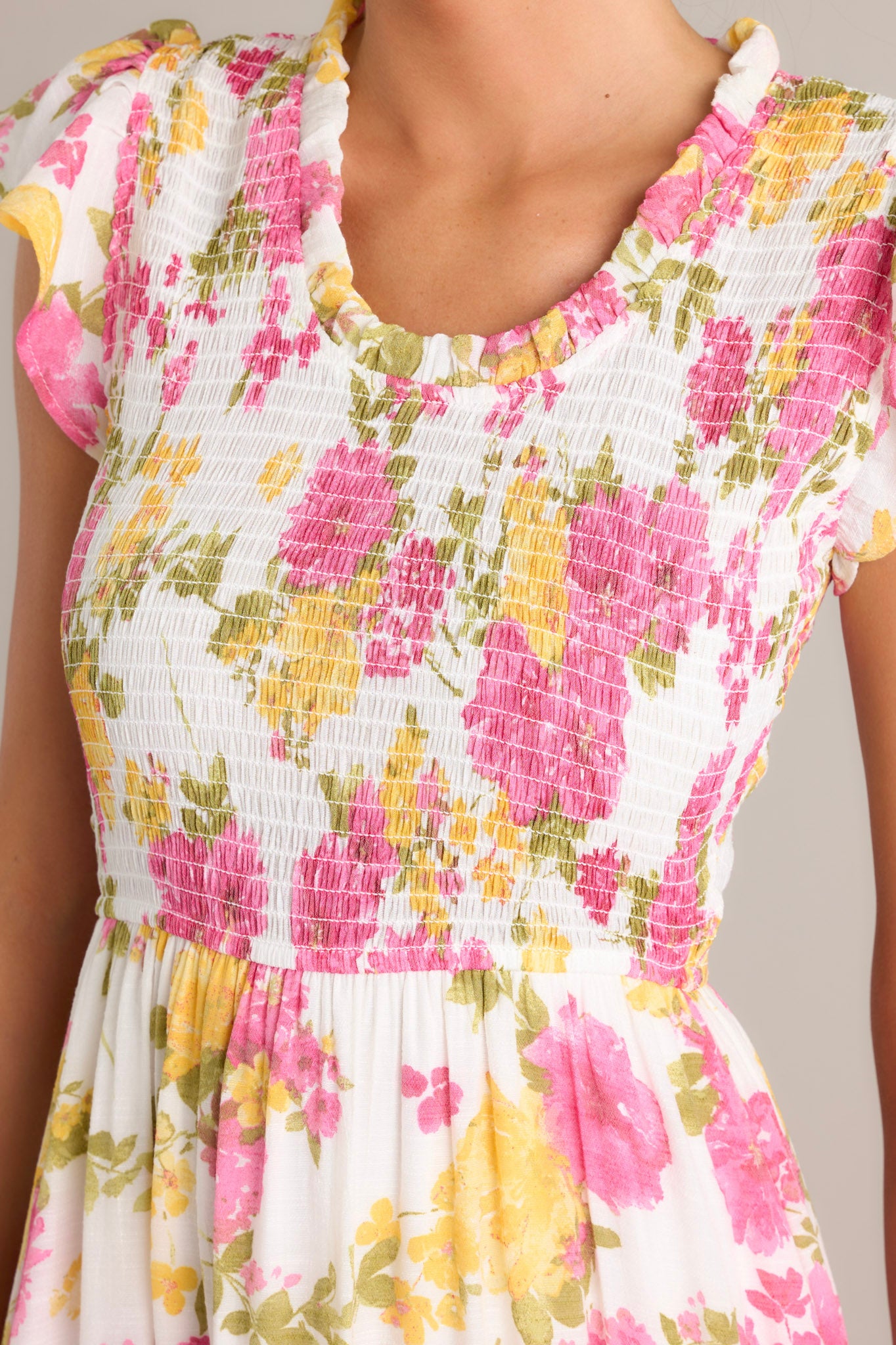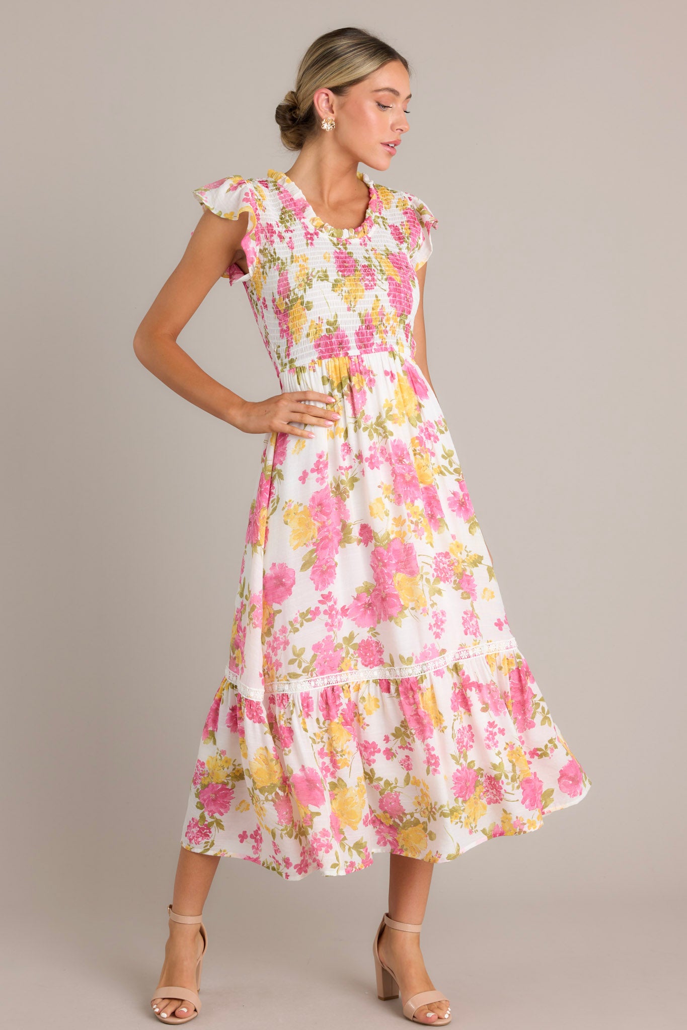 Ready to bloom? This playful midi dress features a burst of florals, perfect for your next picnic or garden party. With its unique mix of quirk and elegance, this dress is sure to make you stand out. Add some flair to your wardrobe with Bloom Burst! This white & pink floral midi dress features a ruffled scoop neckline, a fully smocked bodice, a single tier with lace detailing, and short flutter sleeves.