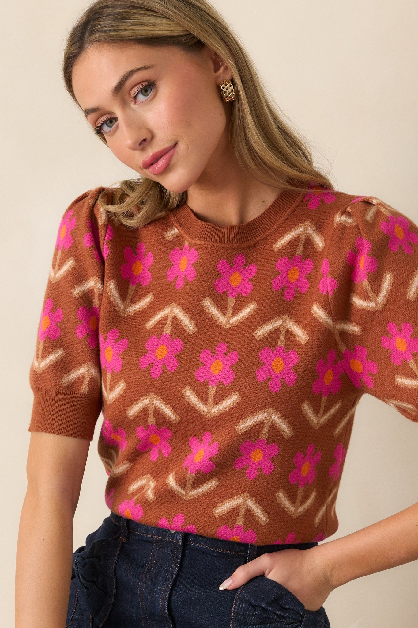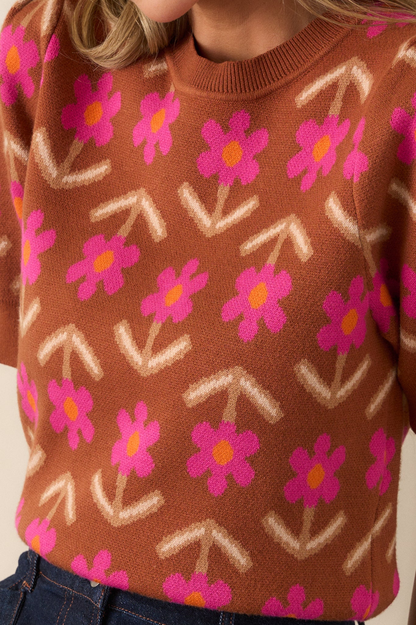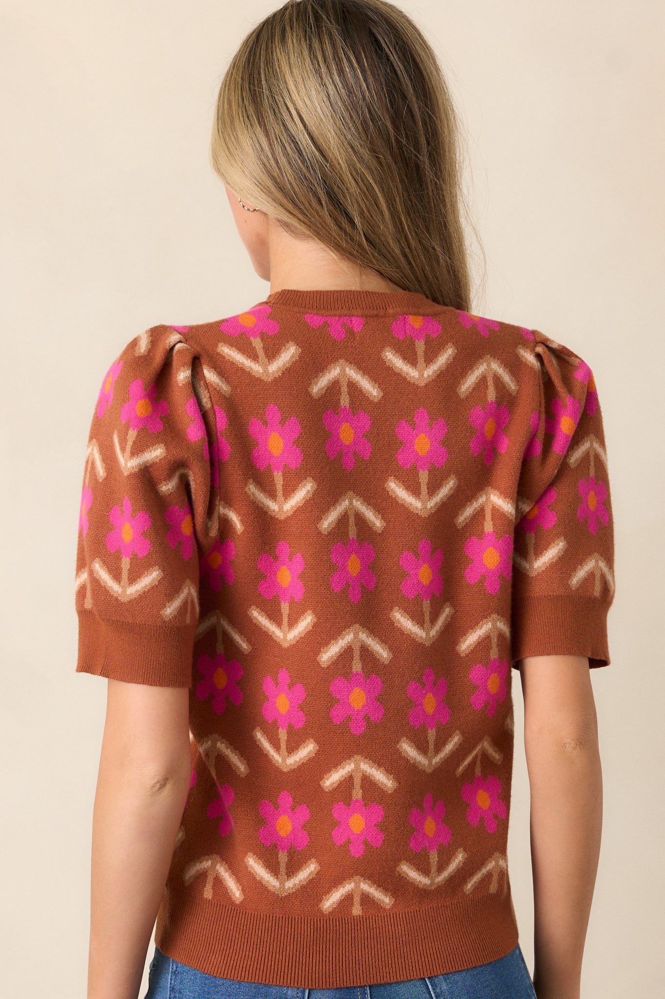 The Blooming Breezes Cinnamon Floral Short Sleeve Sweater is a versatile and stylish addition to any wardrobe. Made with a soft and cozy material and adorned with a floral pattern, this sweater is sure to provide comfort and fashion all in one. Perfect for any occasion, feel confident and chic in this must-have piece. This cinnamon sweater features a round neckline, geometric floral design, ribbed knit hemline and short sleeves with ribbed cuffs.