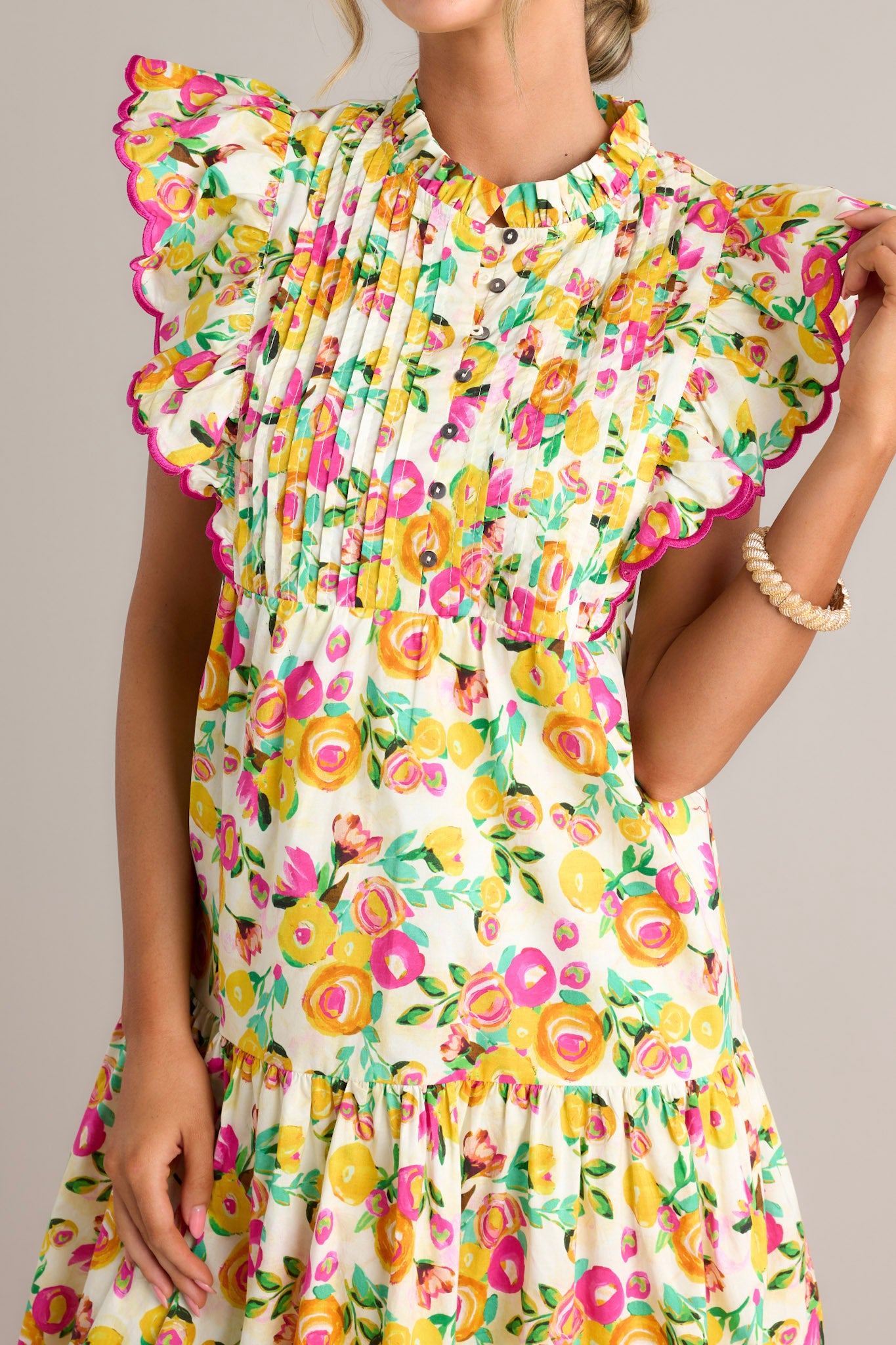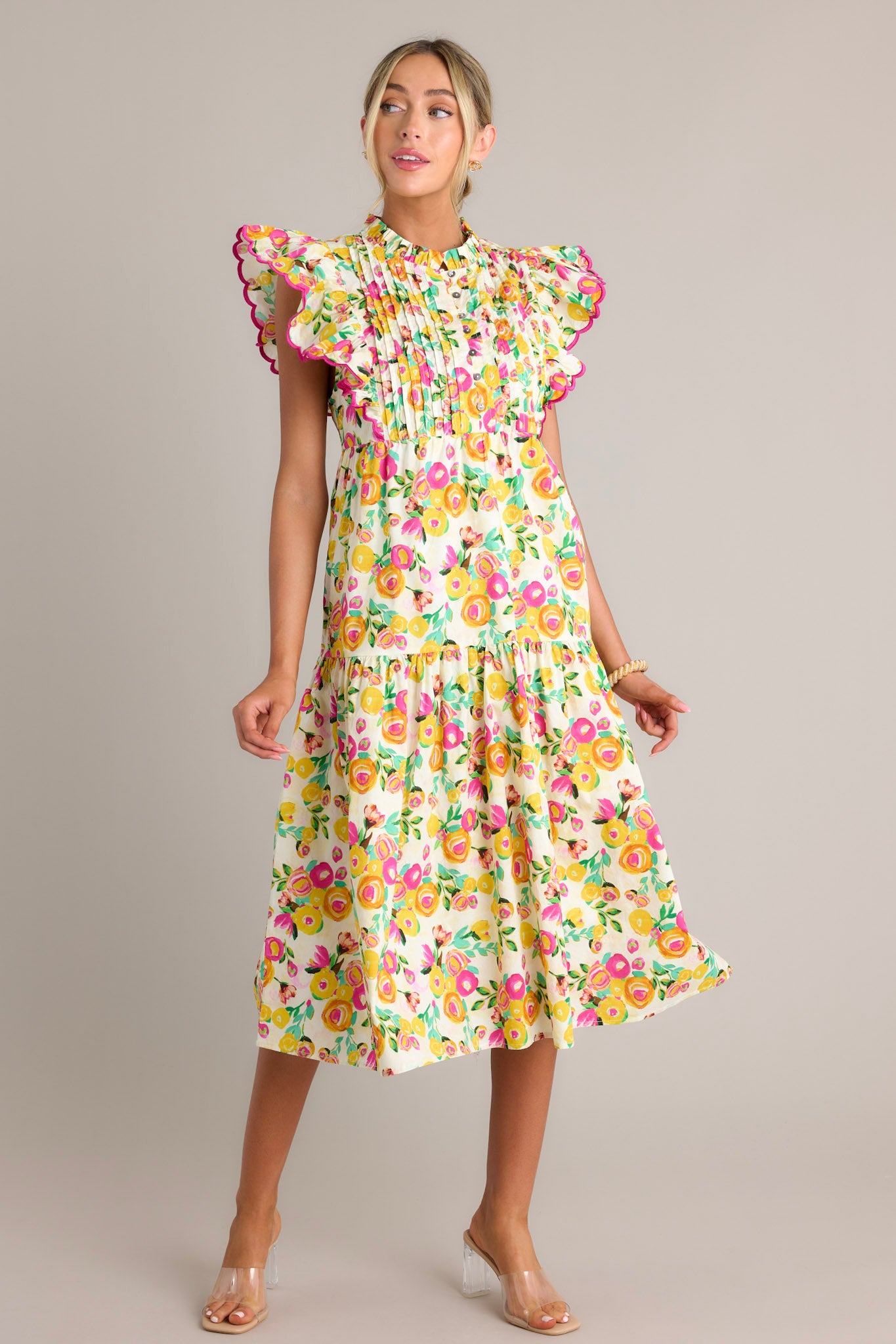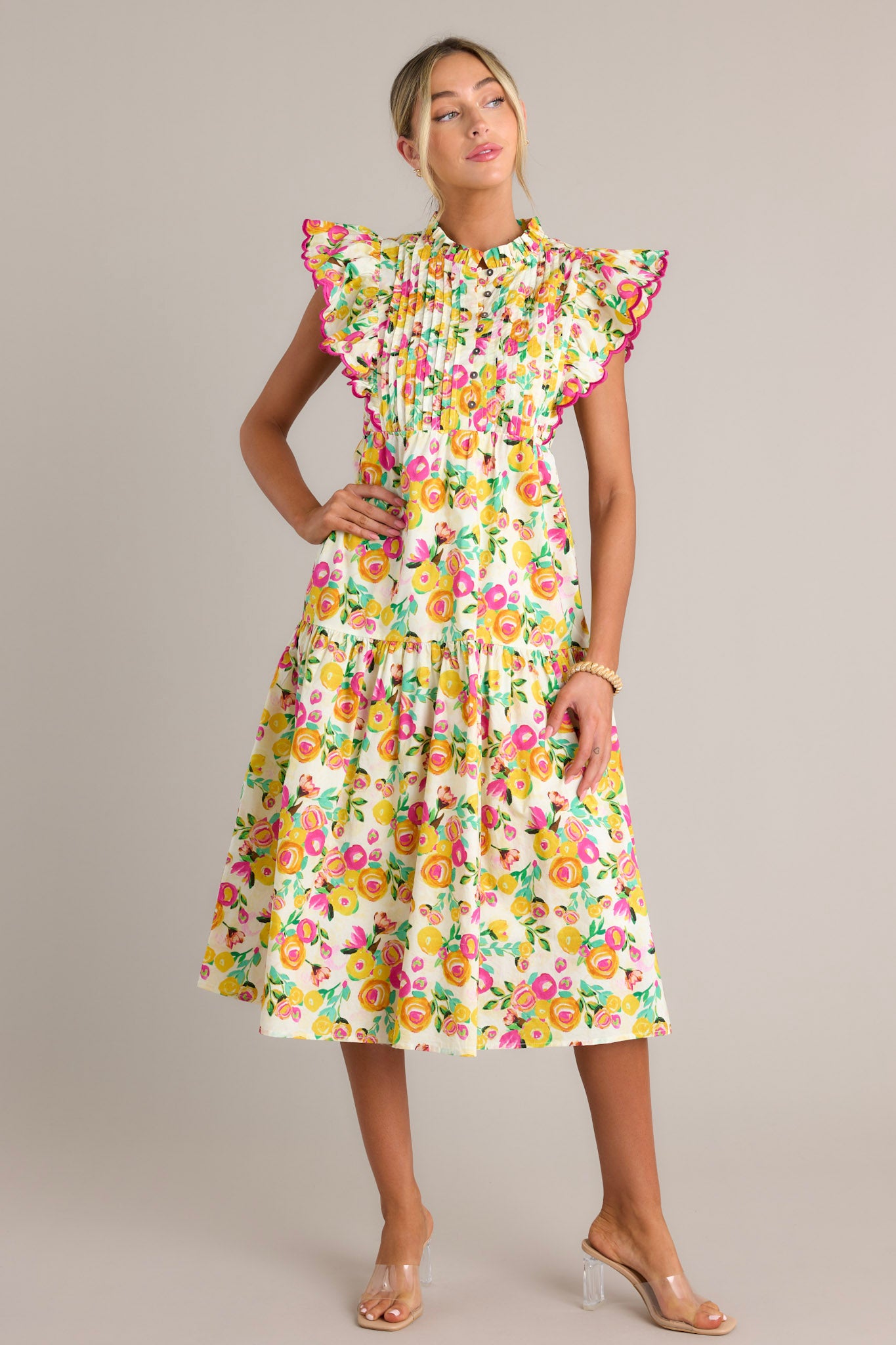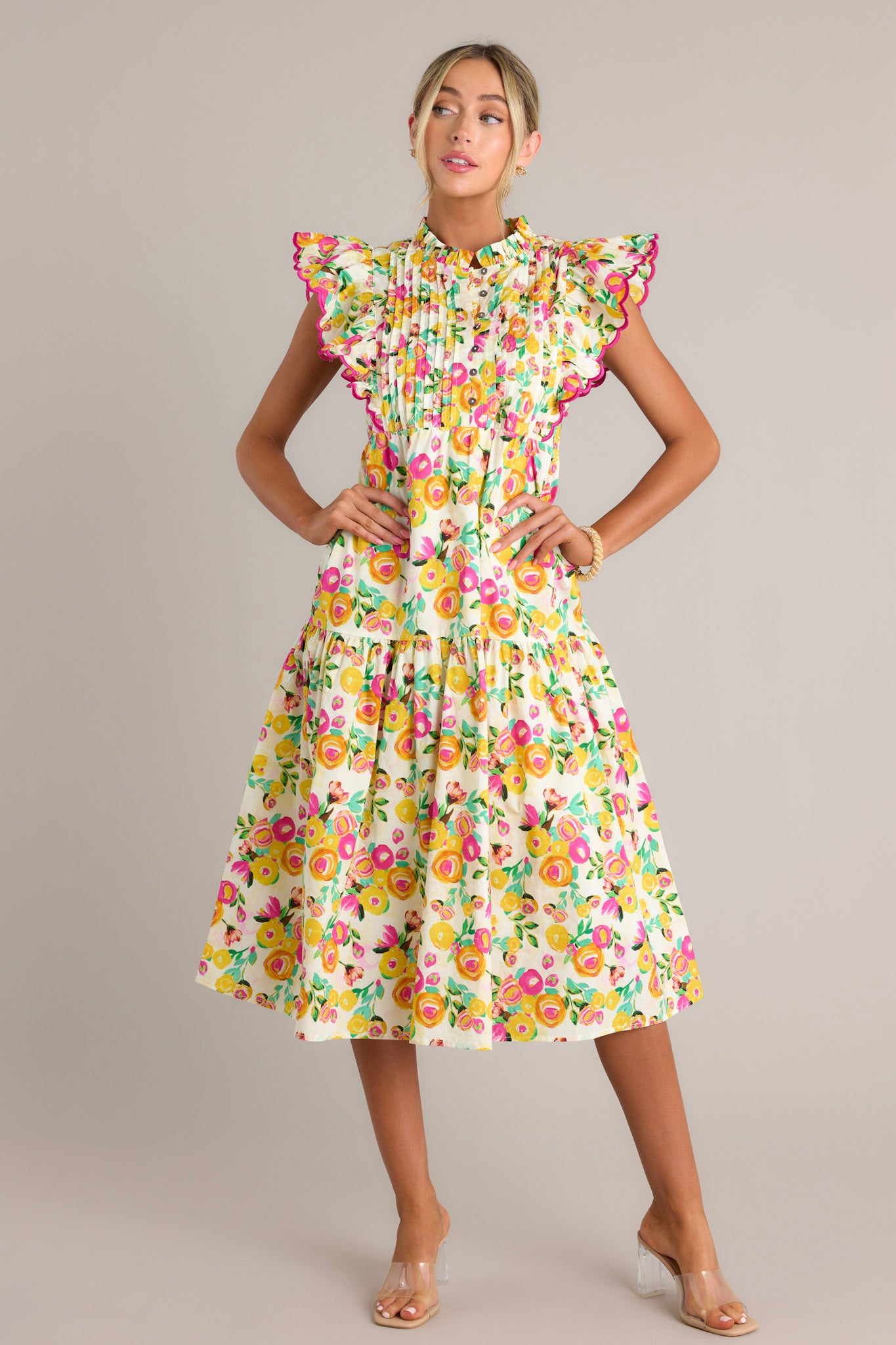 Blossom into summer fashion with our Blossoming Love midi dress! Made from 100% cotton, this dress features a beautiful yellow floral pattern that will make you stand out in any crowd. The midi length adds a touch of elegance, while the breathable cotton fabric keeps you cool and comfortable all day long. This yellow floral midi dress features a high ruffled neckline, a functional button front bodice, a pleated chest, functional hip pockets, a single tier, and short flutter sleeves.