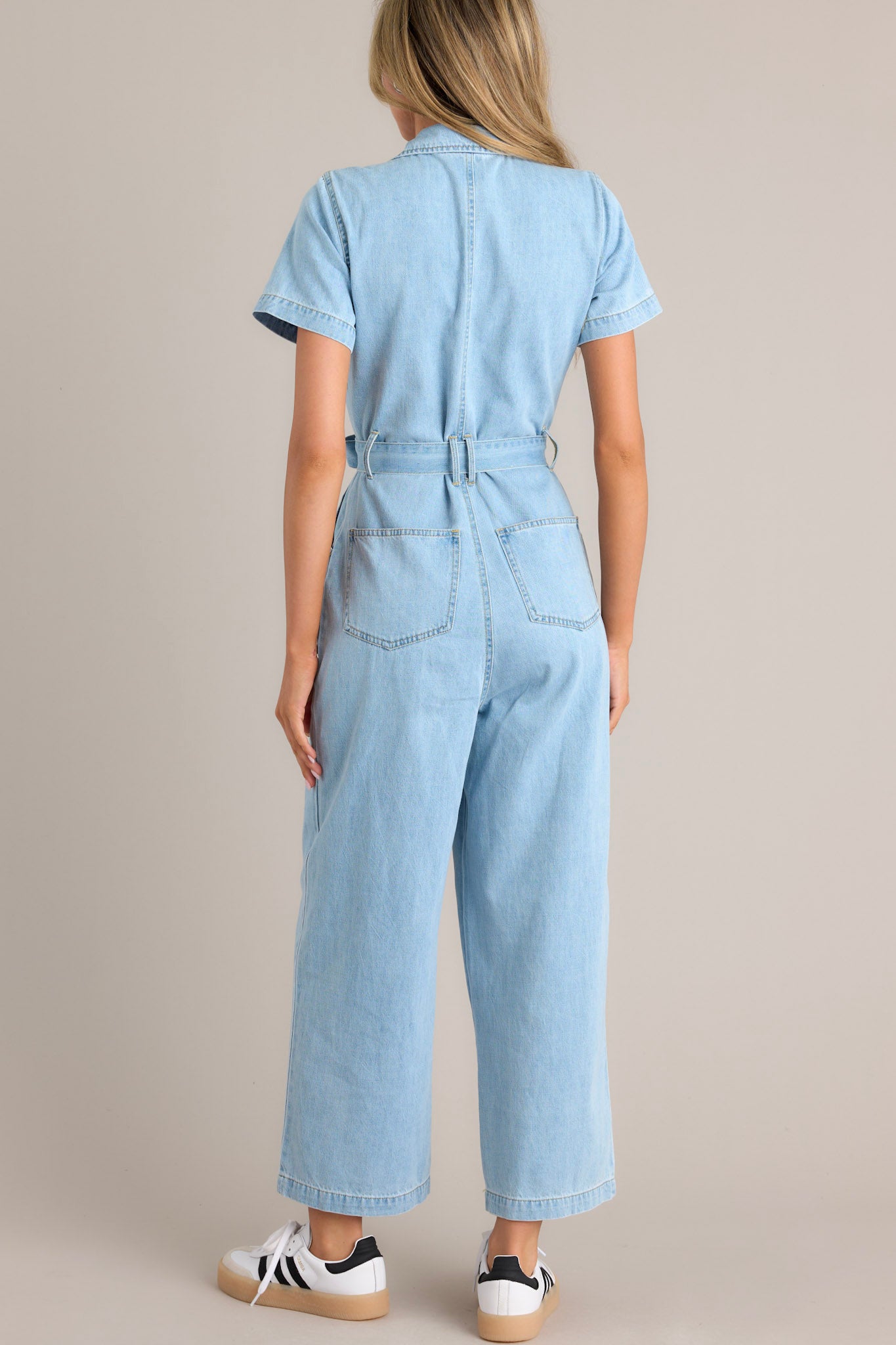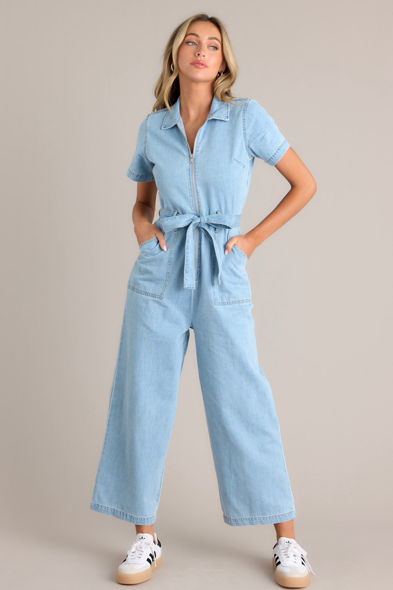 Get ready to rock some serious style with our Blue Jean Beauty Light Wash Demin Zip Front Jumpsuit! This jumpsuit features a light wash denim fabric and a zip front for easy on and off. Perfect for any casual occasion, this jumpsuit will have you looking chic and on trend without sacrificing comfort! This light denim jumpsuit features a collared neckline, a functional zipper front, belt loops, a self-tie waist belt, functional front & back pockets, a wide leg design, and short sleeves.