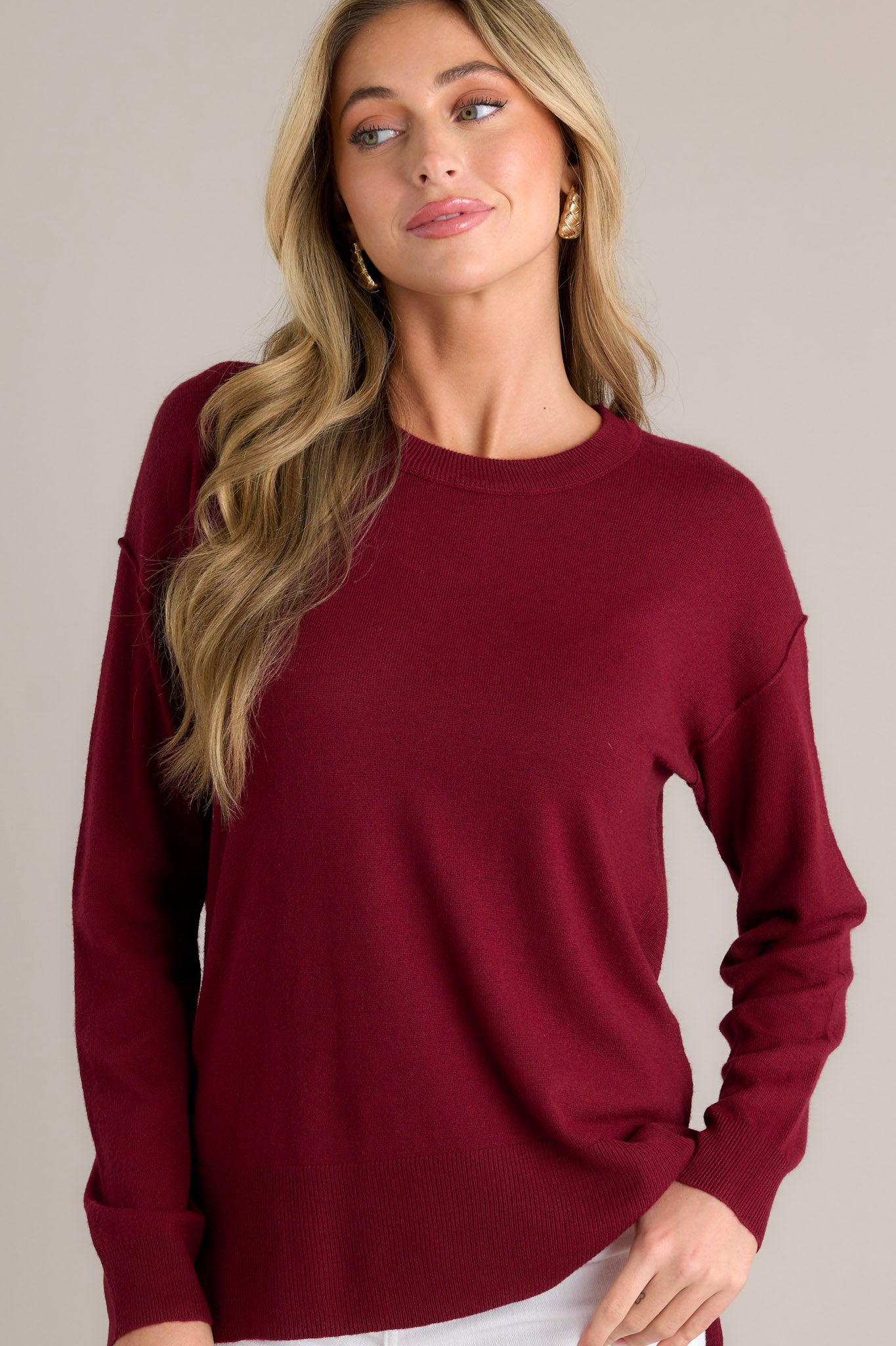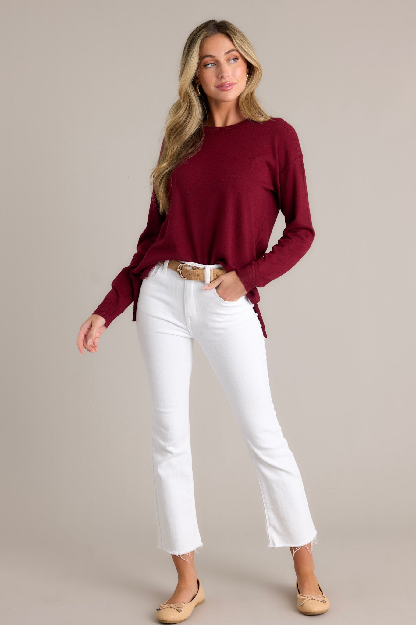 Stay cozy and stylish this fall with the Bonfire Weekends Burgundy Sweater! Featuring a lightweight, textured material, this top is perfect for any chilly fall day. Whether you're camping, toasting marshmallows, or hitting the town, you'll look and feel good in this cozy top! This sweater features a round neckline, long sleeves with ribbed cuffs, a bottom hemline that is slightly longer in the back and has slits up both sides, and a super soft feel throughout.