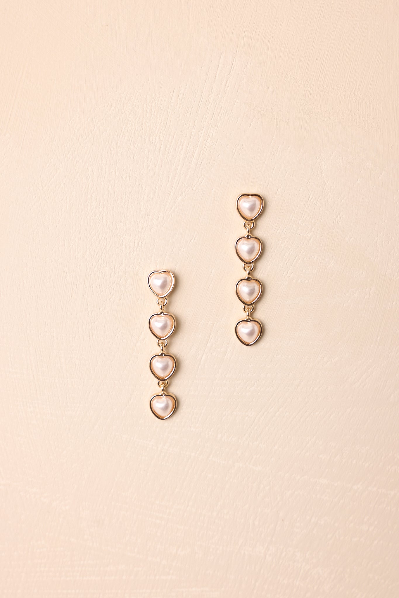 Elevate your style with our Chalice of the Unseen Gold & Ivory Faux Pearl Drop Earrings. These elegant earrings feature a unique design and stunning ivory faux pearls for a touch of sophistication. Perfect for any occasion, you'll feel confident and beautiful wearing these earrings. These gold and ivory heart drop earrings feature gold hardware, four small gold bordered ivory faux pearl hearts connected by gold jump rings, and secure back postings.