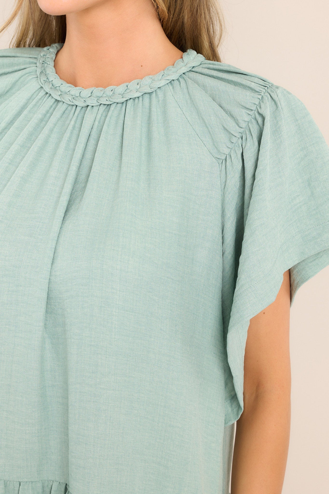 Unleash your inner fire with the Chase Your Passion Sage Green Mini Dress. Made from high-quality fabric, this dress keeps you comfortable while you pursue your dreams. The pretty sage green color and playful design will make you stand out in any crowd. Go ahead, chase your passion! This dress features a round neckline, a braided detail around the neckline, a keyhole detail at the back with a button closure, pleated detailing at the top of the sleeves, a pleated drop-waist detail, and a tiered flowy skirt.