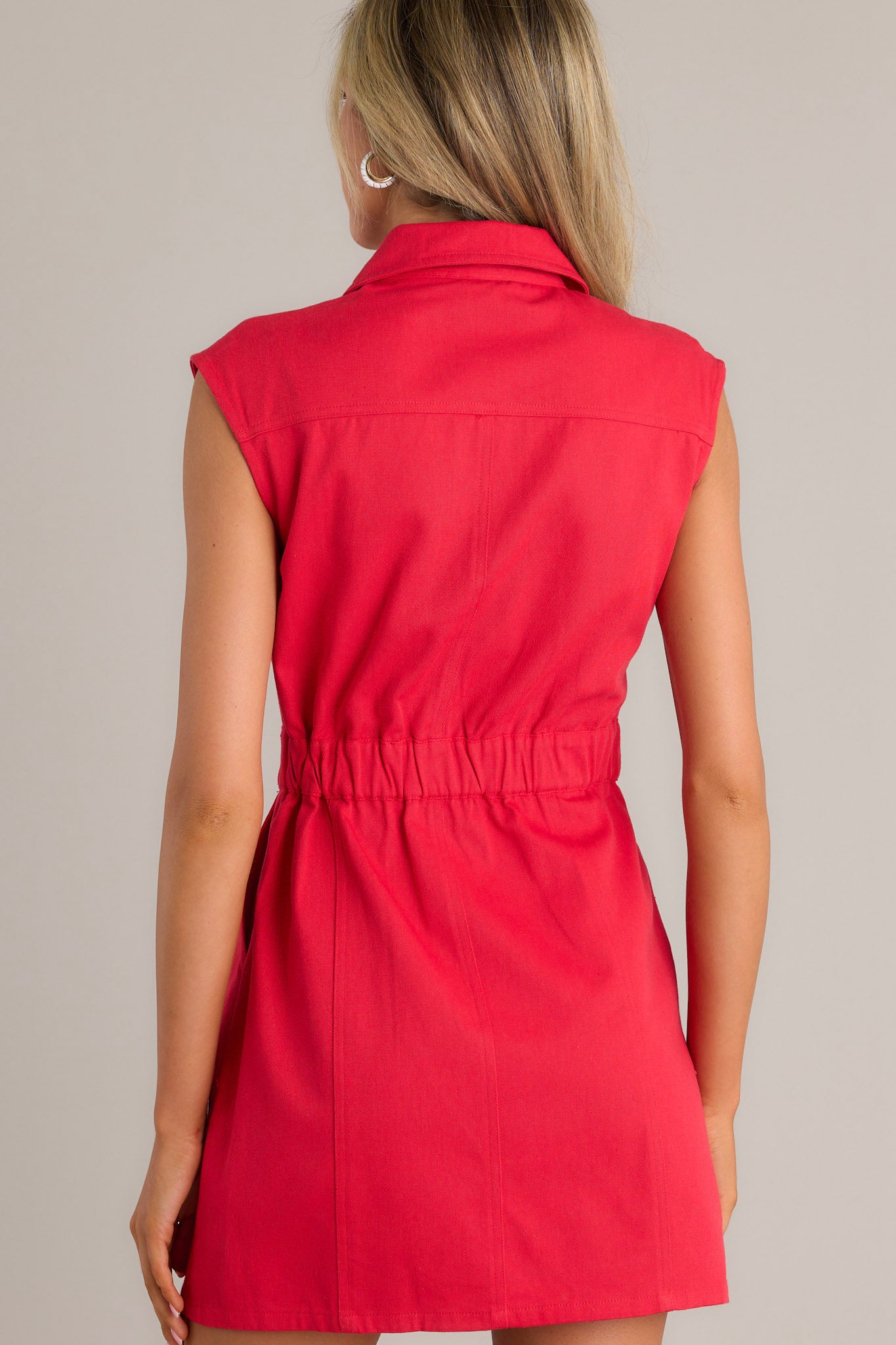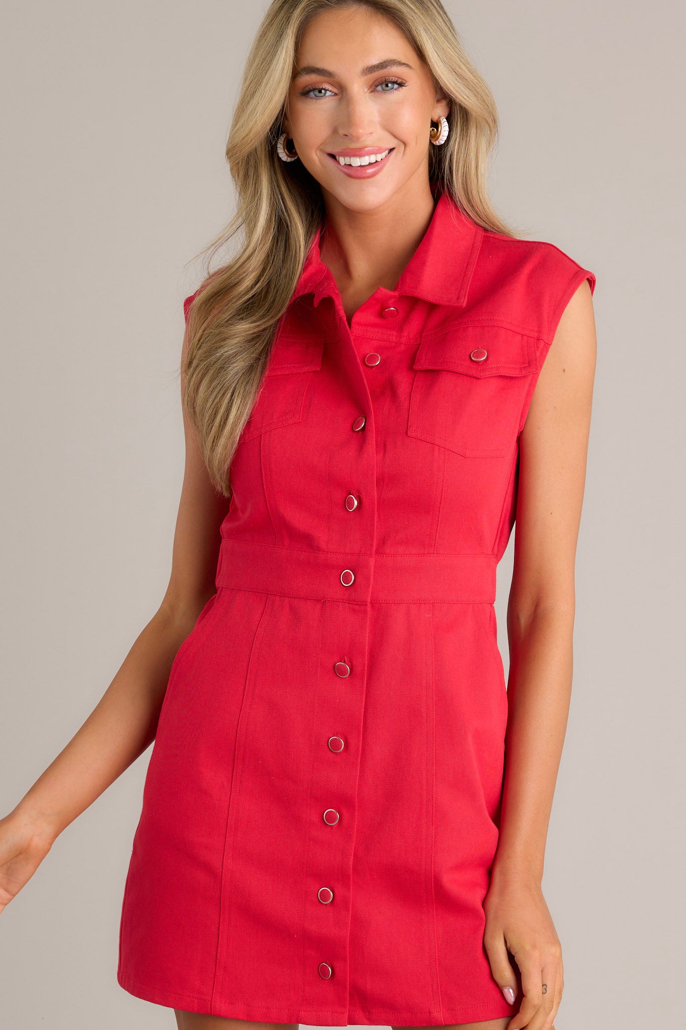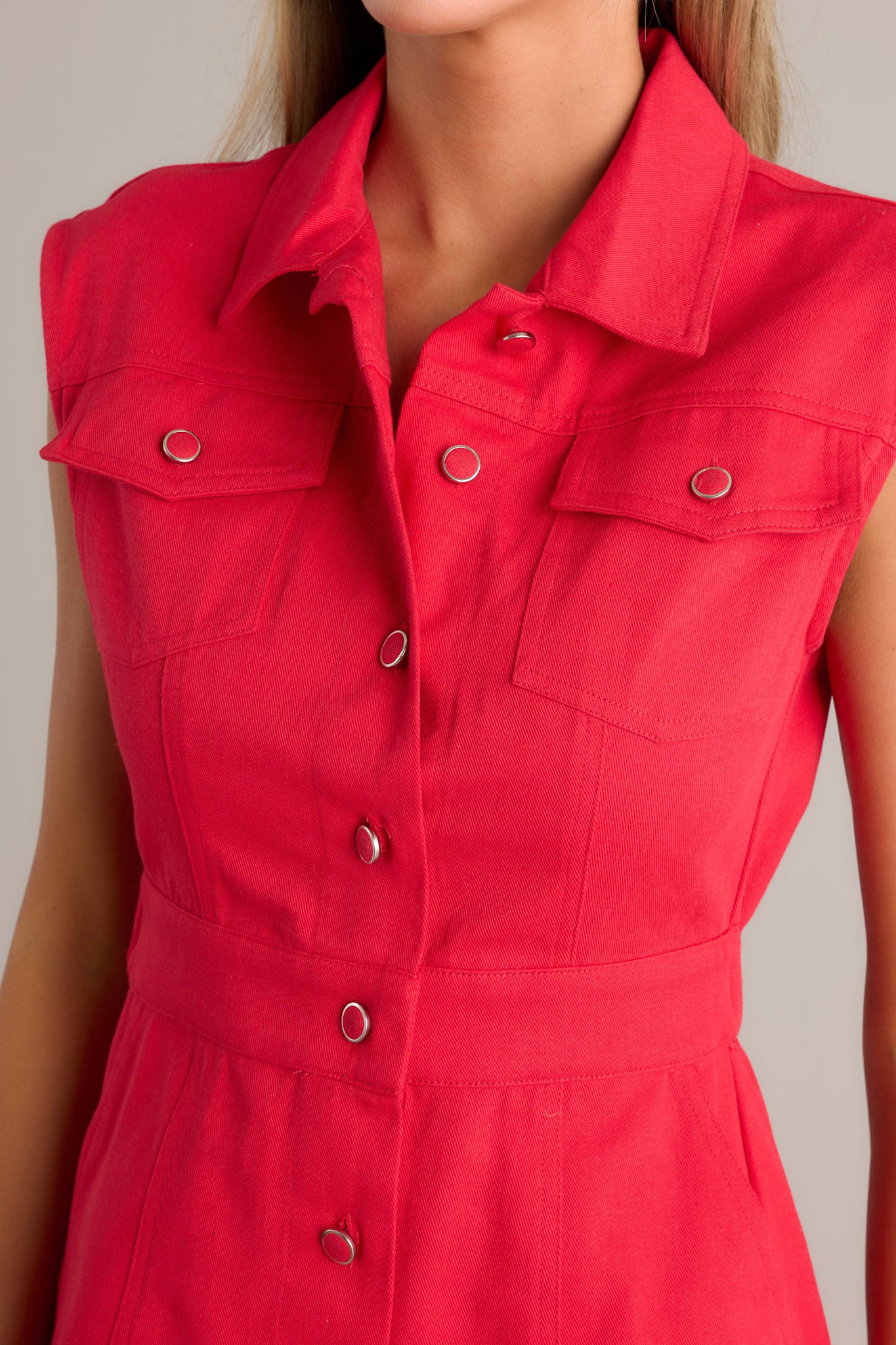 Unleash your inner bombshell with our Cherry Bombshell 100% Cotton Red Denim Mini Dress! Featuring a playful red color and a flattering button-front design, this dress is perfect for both everyday wear and special occasions. Look and feel confident in this unique and stylish dress! This red mini dress features a collared neckline, a full button front, functional breast pockets, an elastic insert in the back of the waist, functional hip pockets, and a sleeveless design.