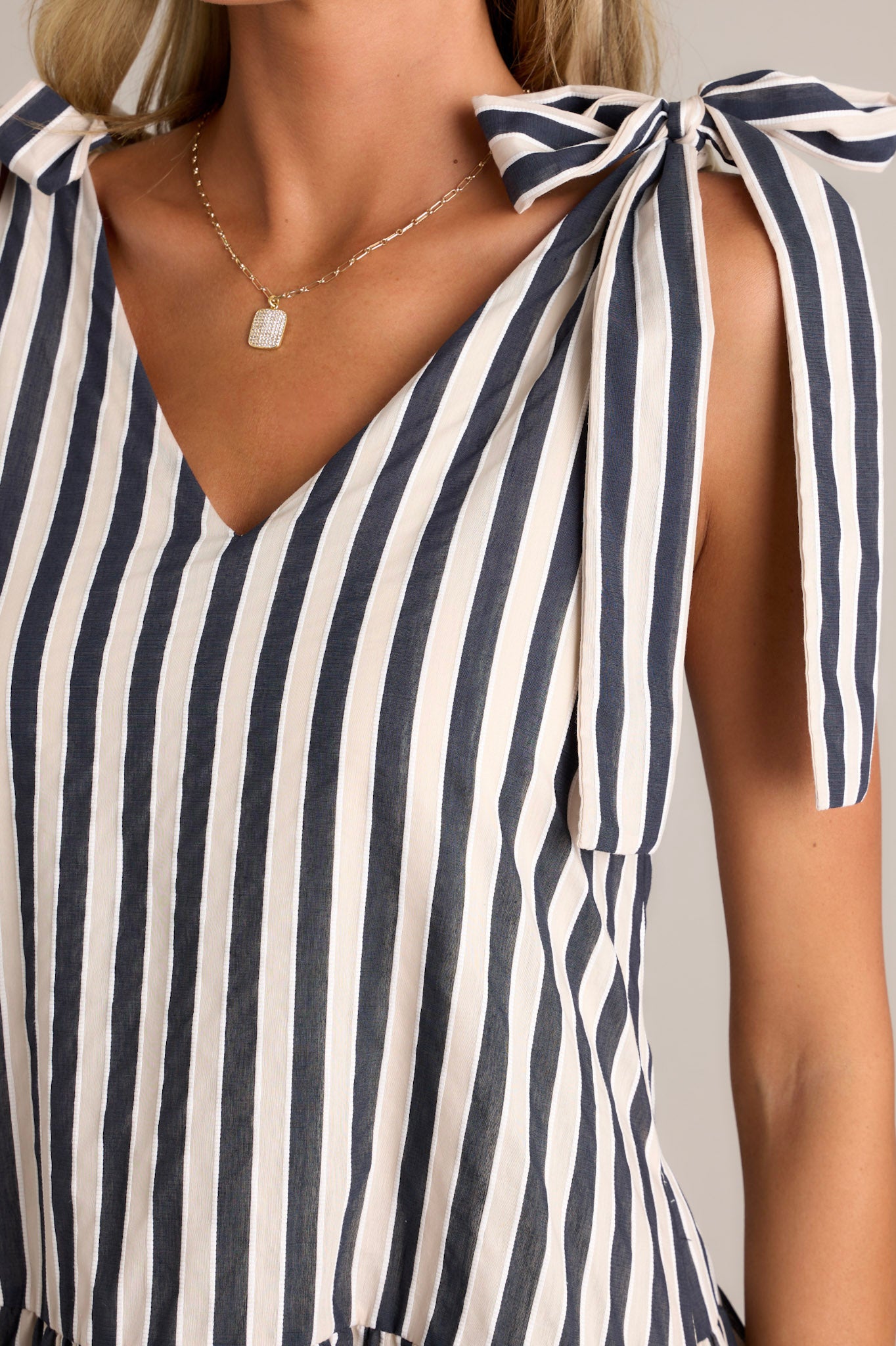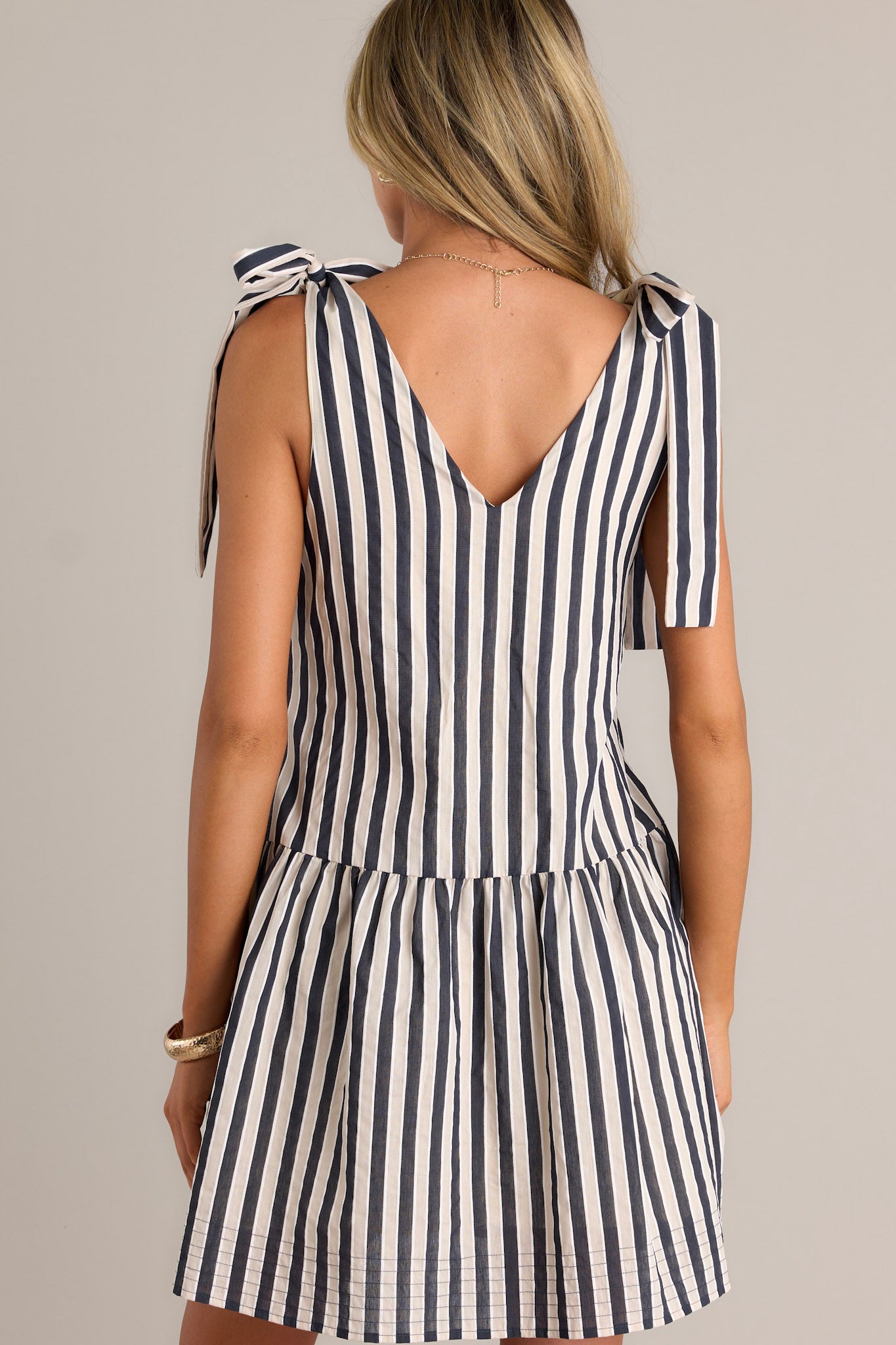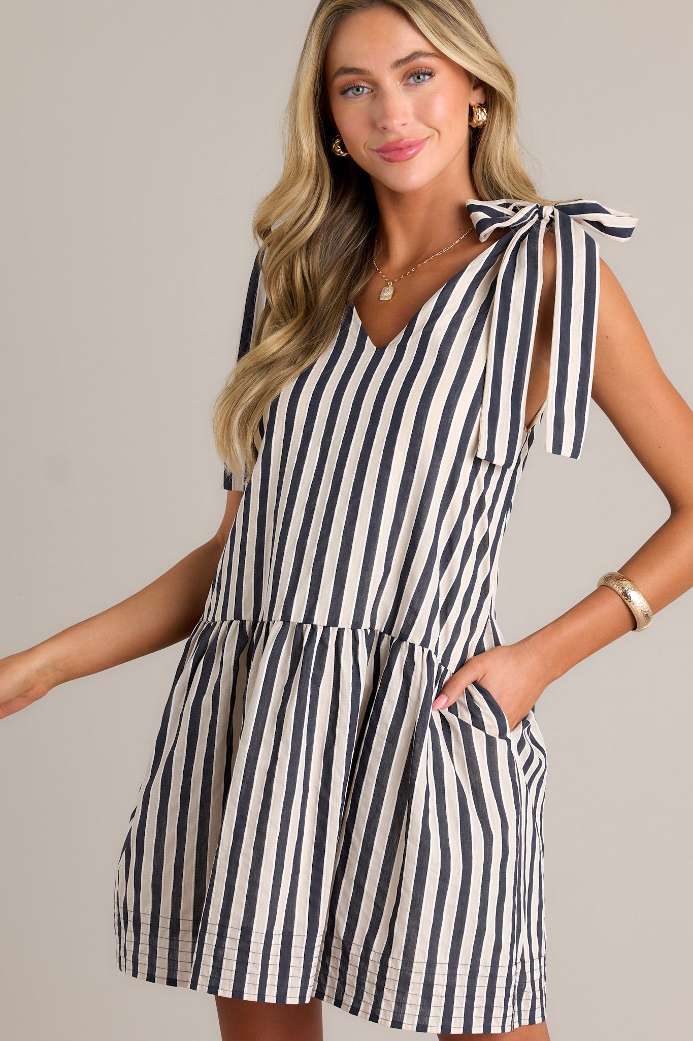 Dazzle everyone in this chic black stripe mini dress. With its sleek design and alluring stripes, this dress will make you stand out in any crowd. Perfect for a night out or a special occasion. Don't miss out on this must-have addition to your wardrobe! This black stripe mini dress features a v-neckline, self-tie straps, a single tier, functional hip pockets, and a relaxed fit.