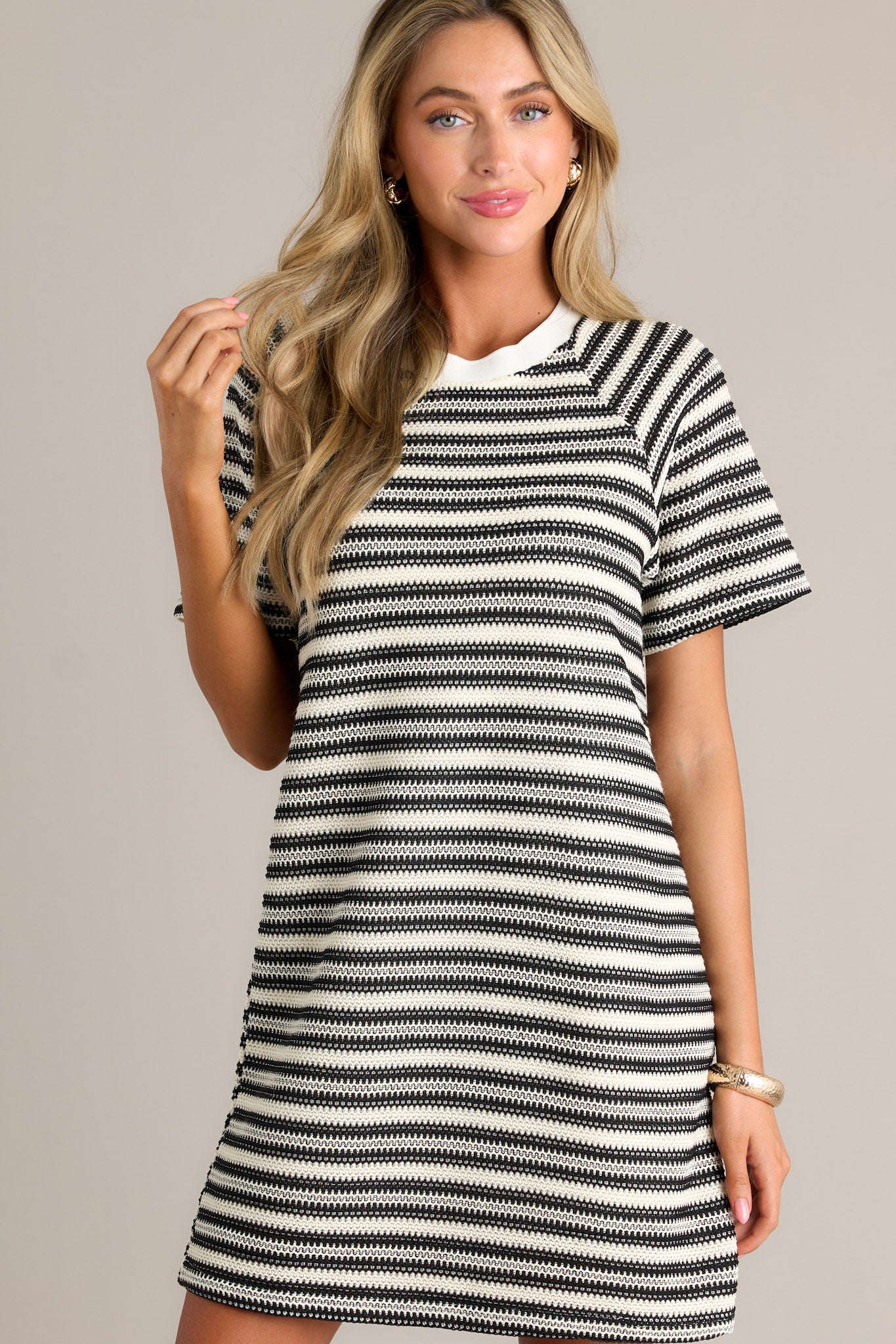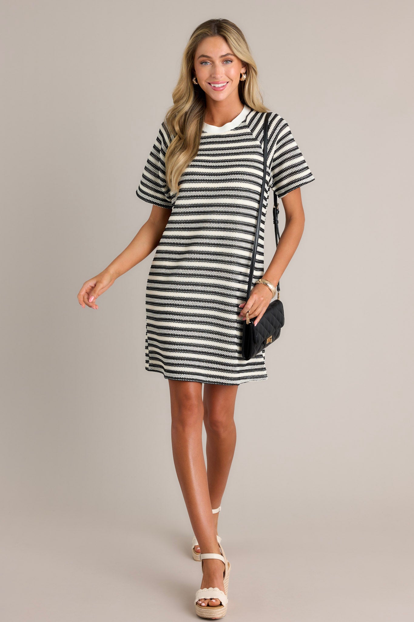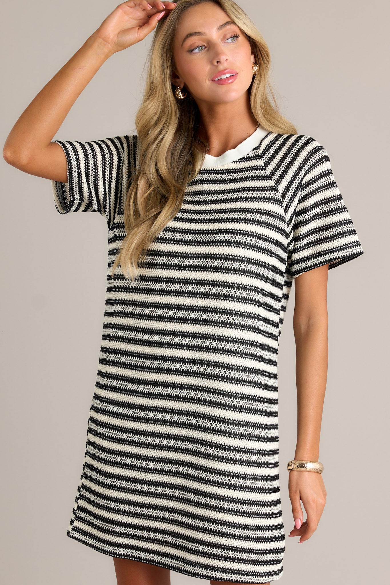 Be bold in our Classic Comfort Black Stripe Knit Mini Dress. With a flattering striped pattern and comfortable fit, you'll feel chic and carefree at your next event. Go ahead, let your playful side shine through. This black stripe mini dress features a crew neckline, a knitted horizontal stripe design, a relaxed fit, and short sleeves.