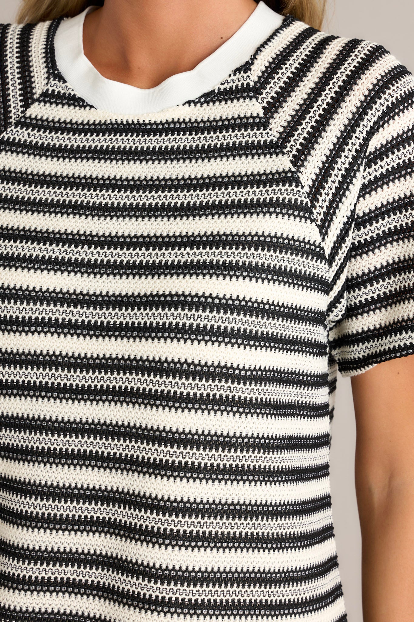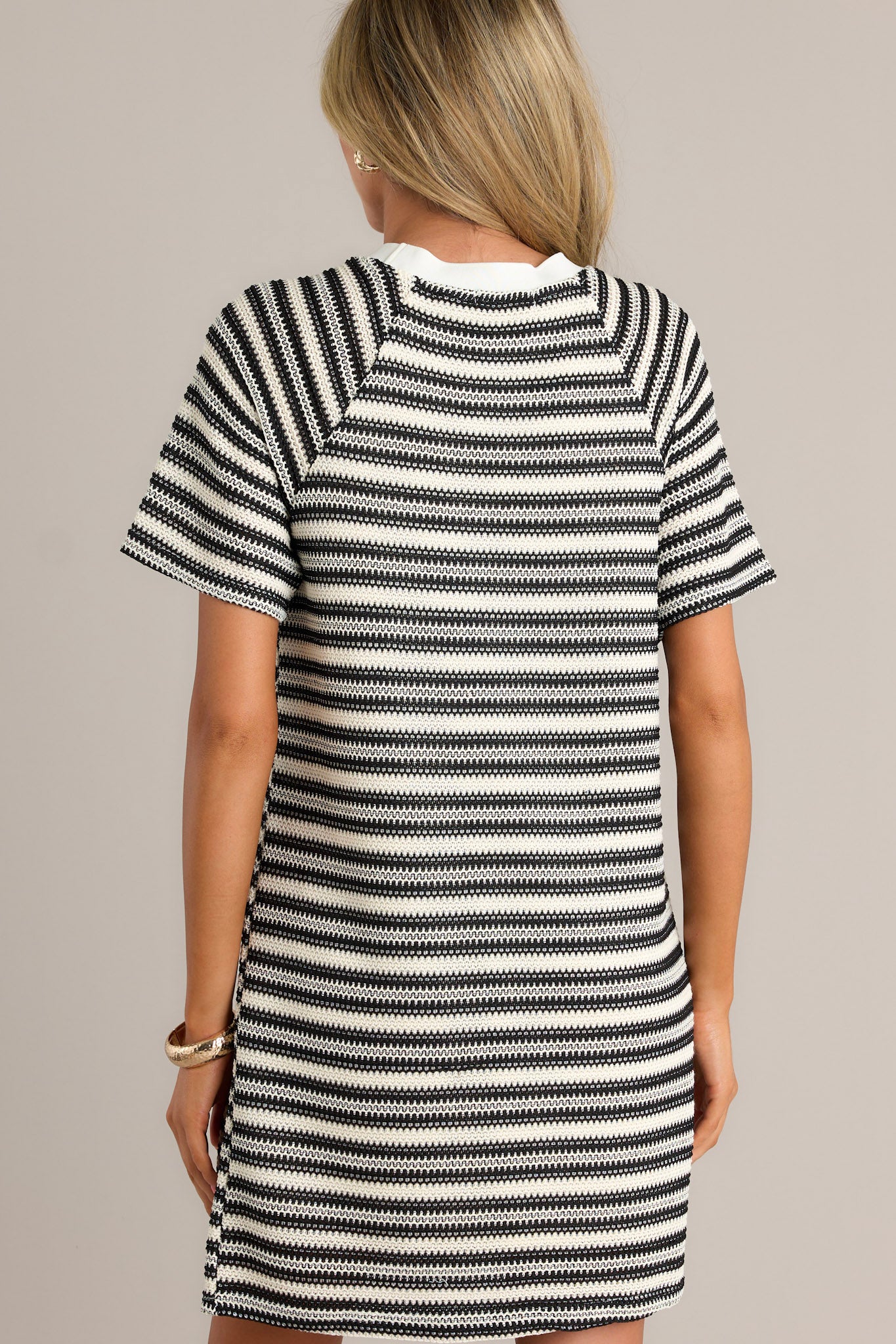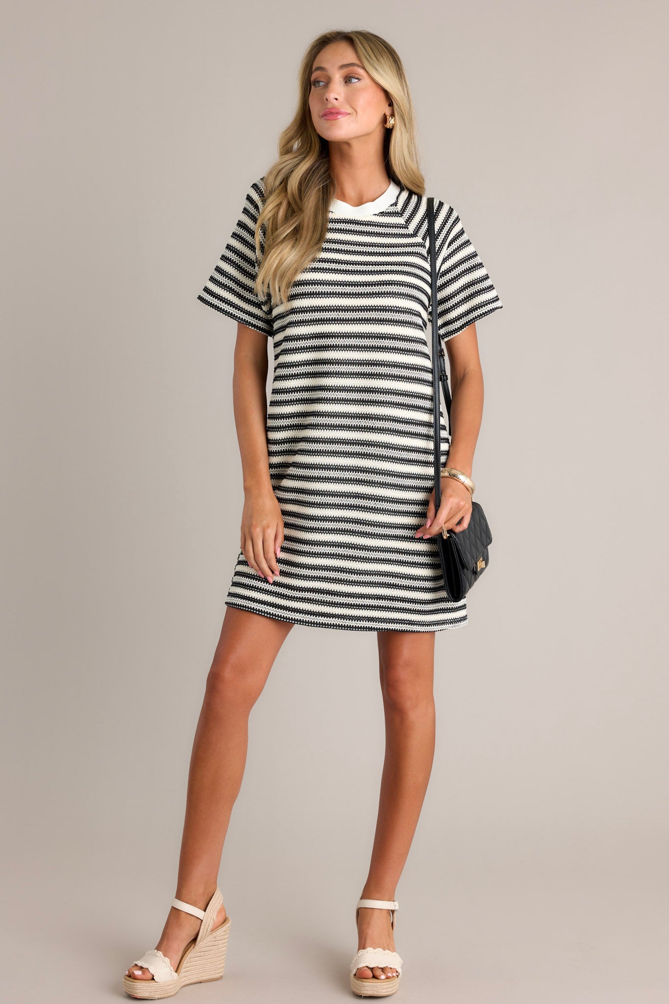 Be bold in our Classic Comfort Black Stripe Knit Mini Dress. With a flattering striped pattern and comfortable fit, you'll feel chic and carefree at your next event. Go ahead, let your playful side shine through. This black stripe mini dress features a crew neckline, a knitted horizontal stripe design, a relaxed fit, and short sleeves.