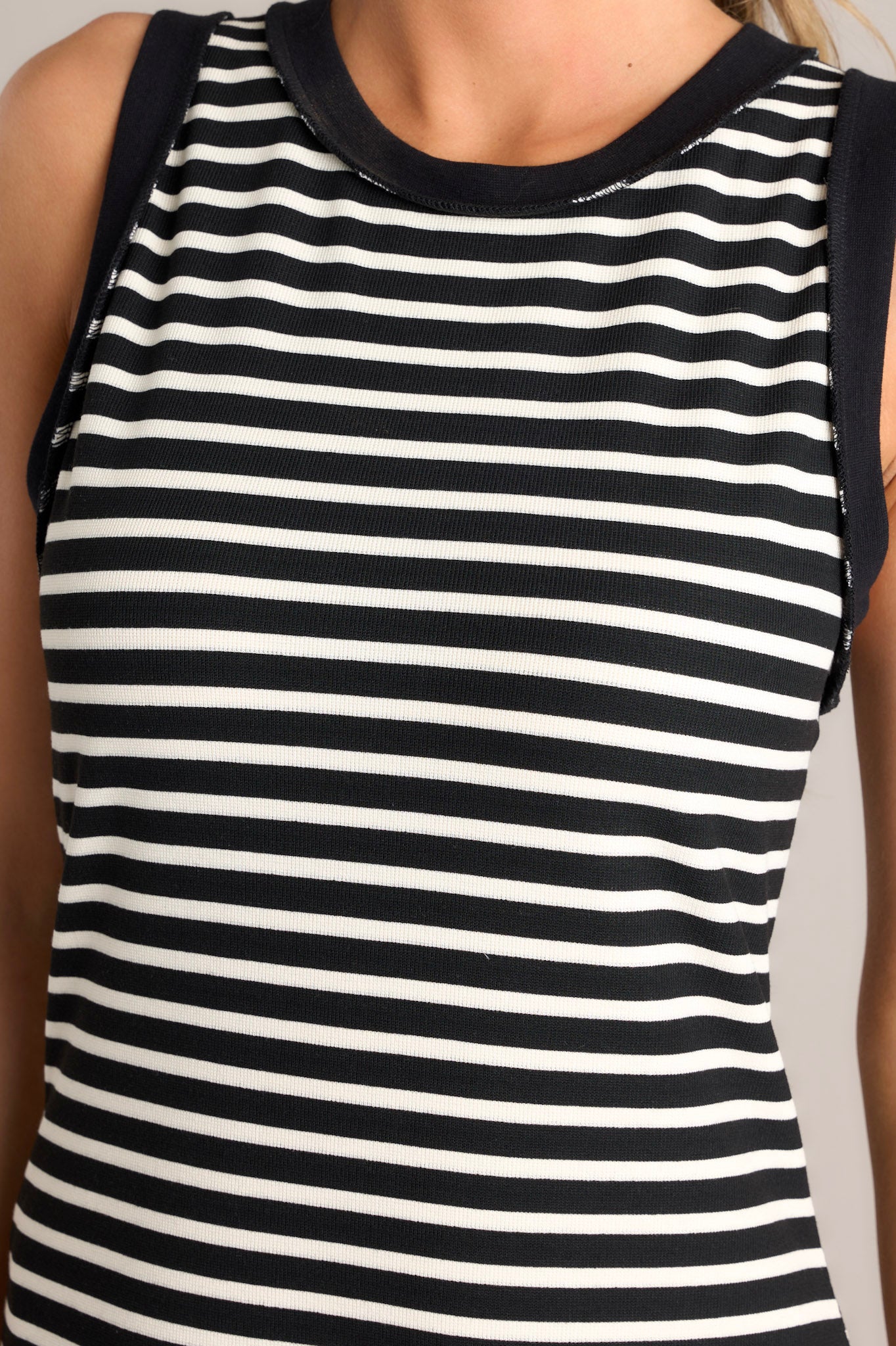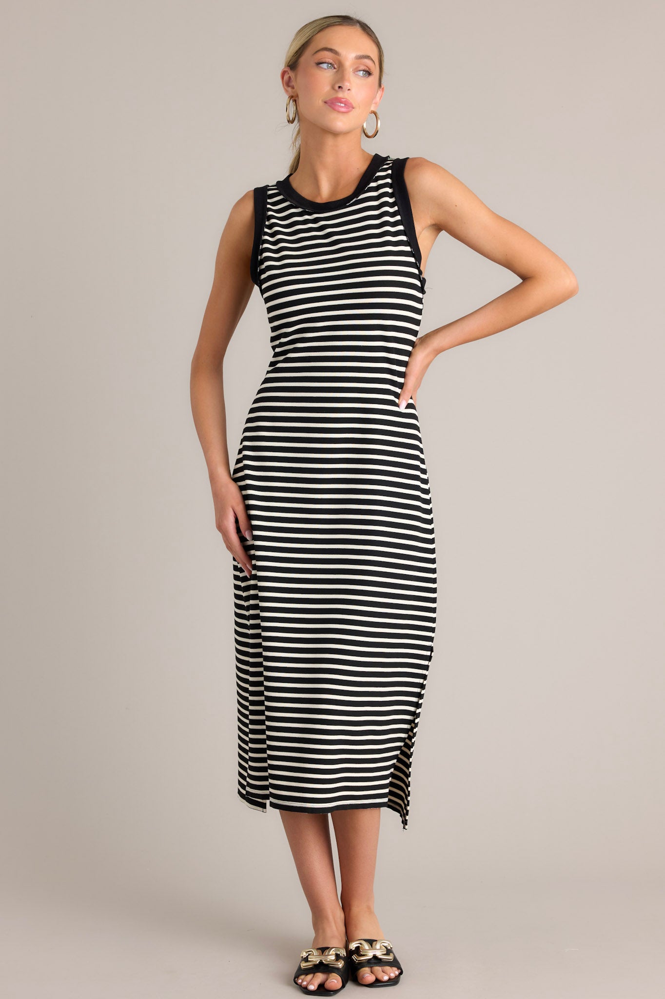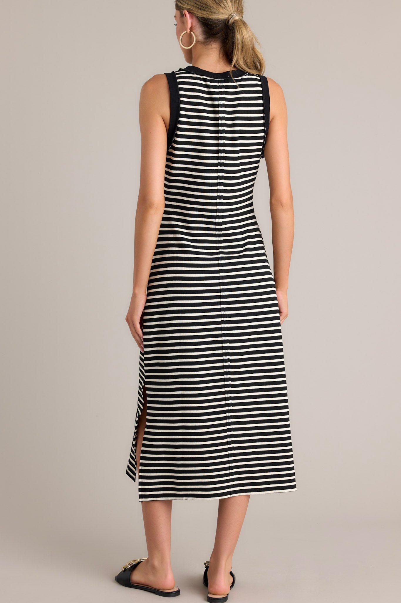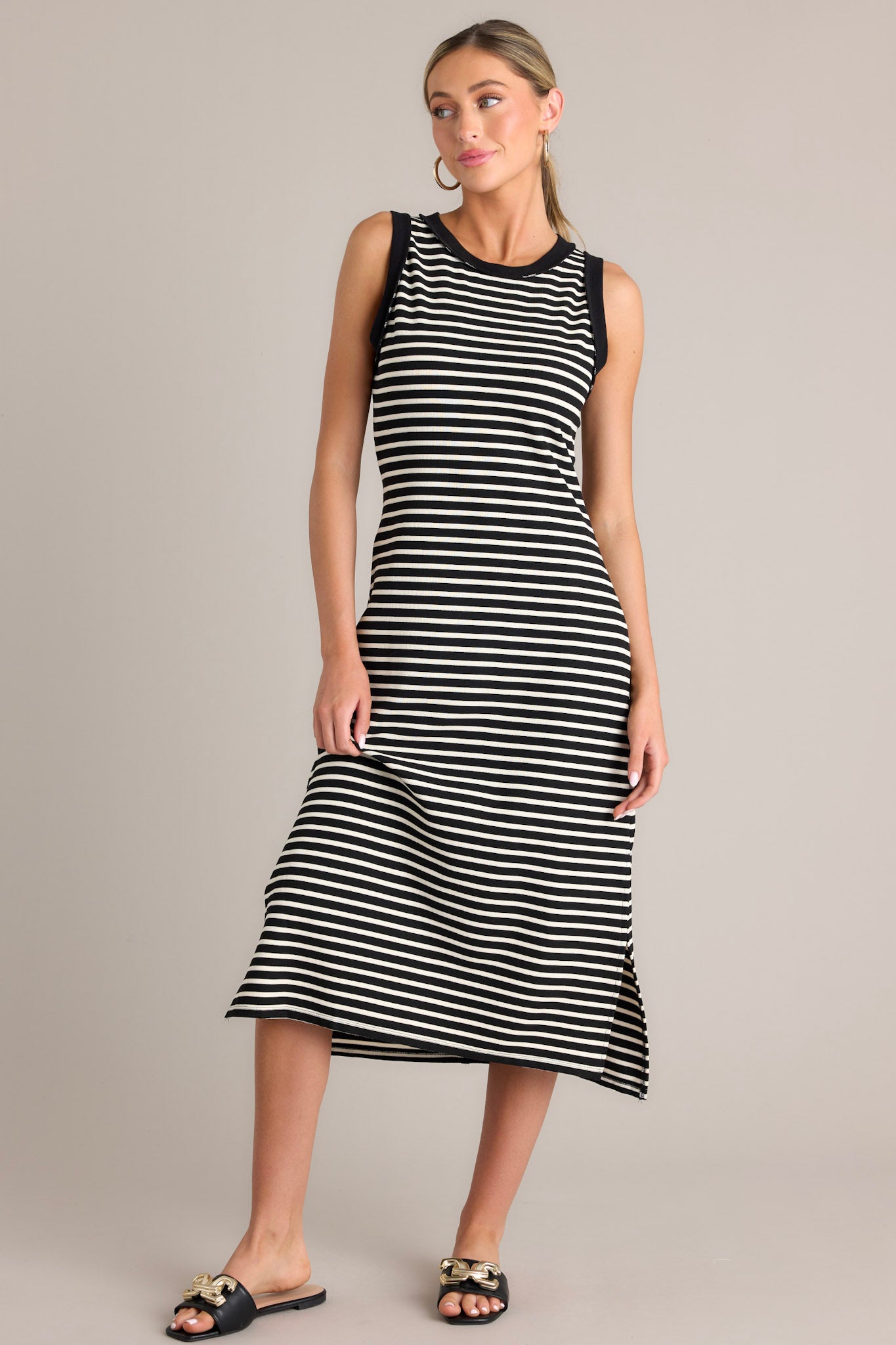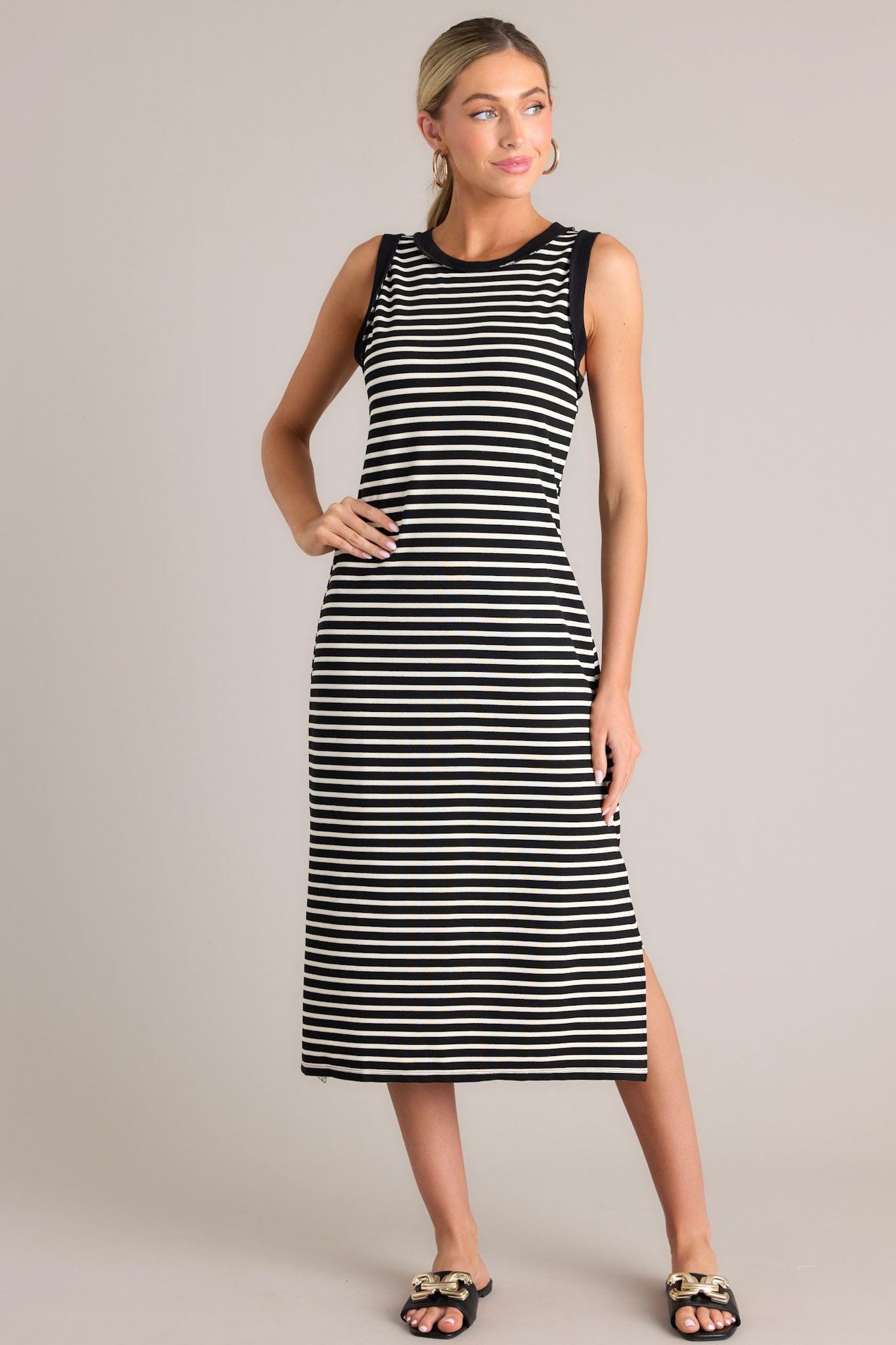 Get ready to turn heads in our Classic Contrast Black Stripe Midi Dress! This bold, yet timeless dress features a striking contrast stripe pattern that adds a touch of playfulness to your wardrobe. With its midi length and classic design, this dress is perfect for any laid back occasion! This black stripe midi dress features a crew neckline, a classic horizontal stripe design, and a split hemline.