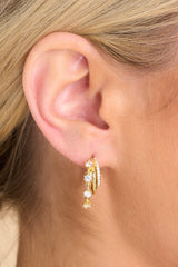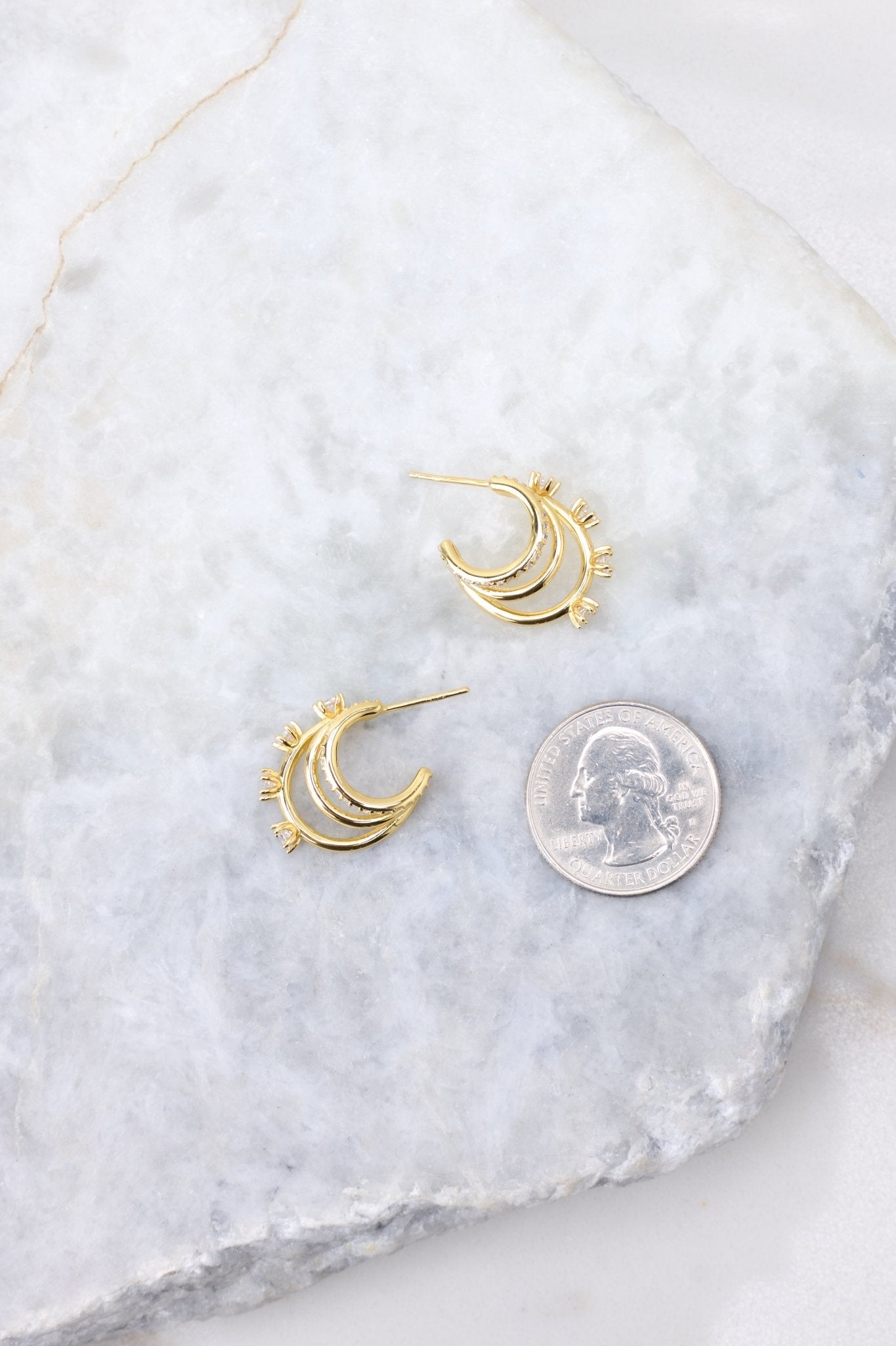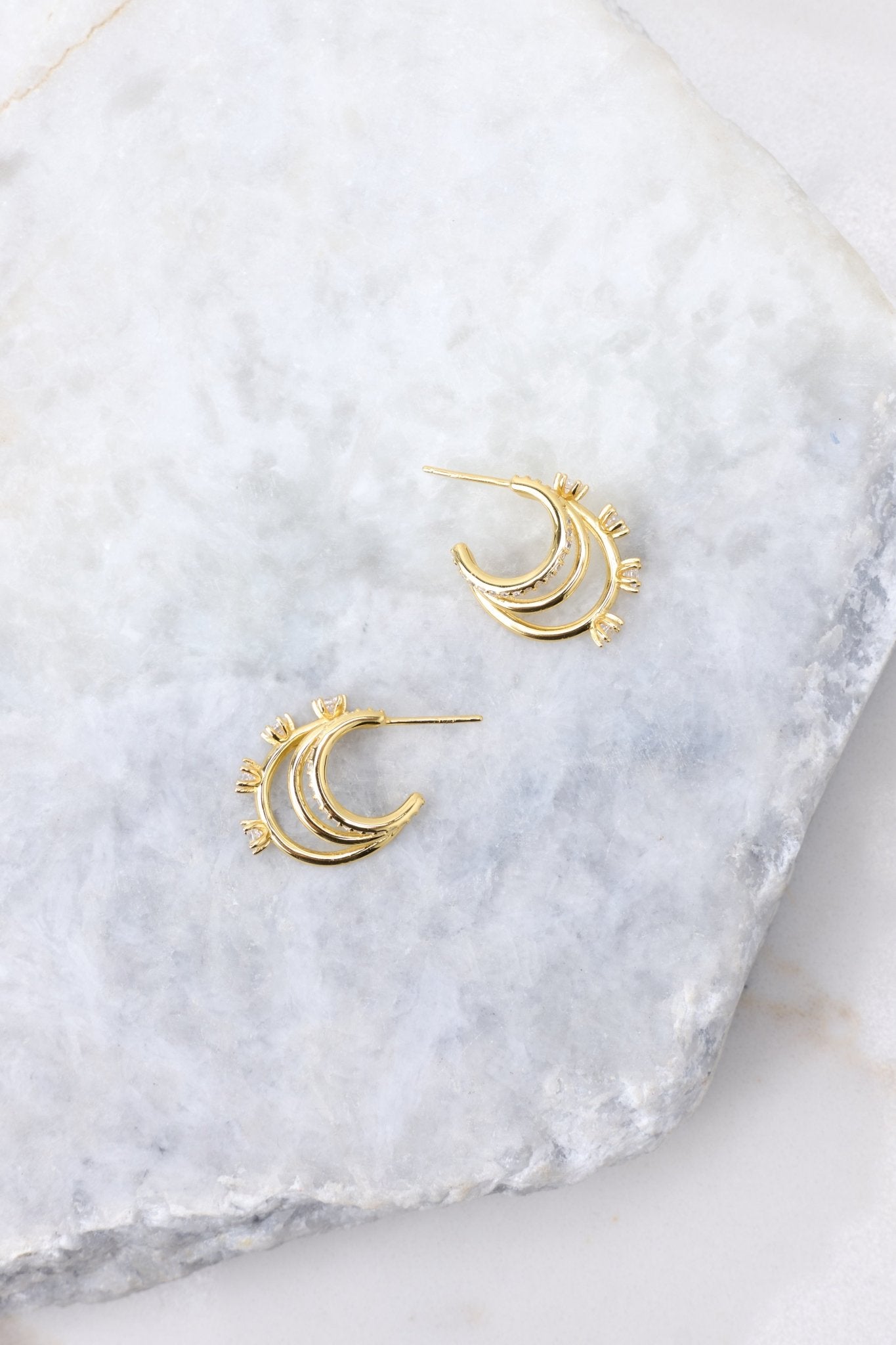 You're looking lovely as ever in these Classy Huggie Gold Hoop Earrings! You're practically running rings around the rest of us with your exquisite taste in jewelry! These earrings feature encrusted rhinestones, gold hardware, 3 layered hoops, and a secure post backing. Earrings measure .75" in length. • Imported
