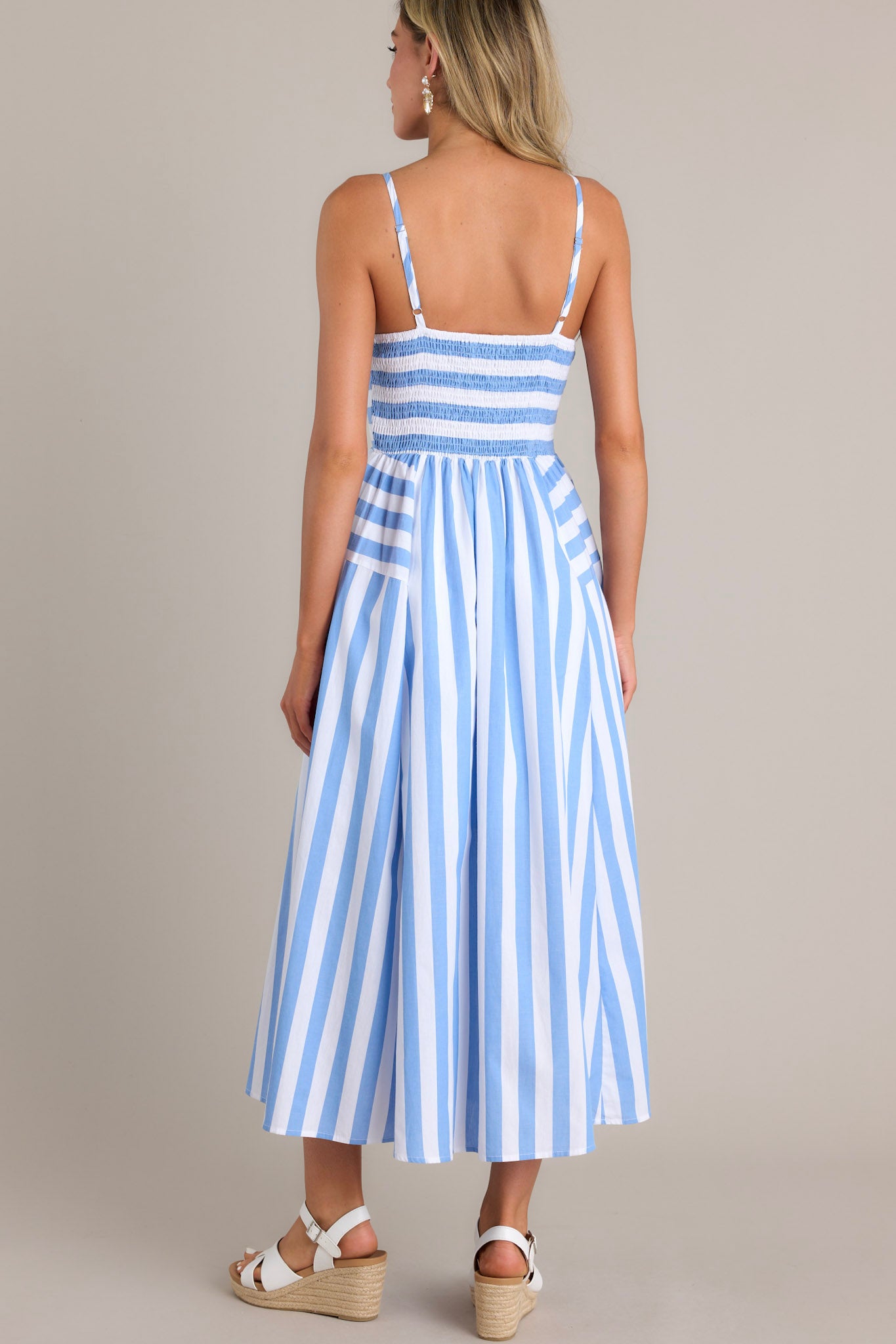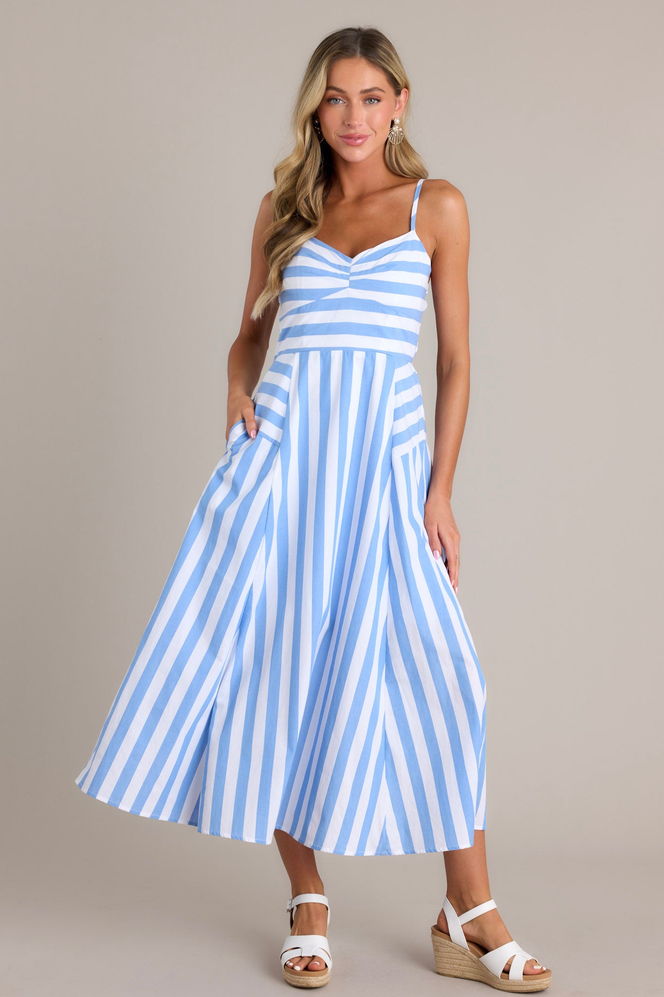 Embrace your inner coastal cutie with our light blue stripe midi dress! Made with soft, breezy fabric, this dress features a stylish striped design and a trendy midi length. Perfect for a day or night out, this dress will have you looking and feeling effortlessly chic. This blue stripe midi dress features a sweetheart neckline, thin adjustable straps, a fully smocked back, functional hip pockets, and a unique striped pattern.