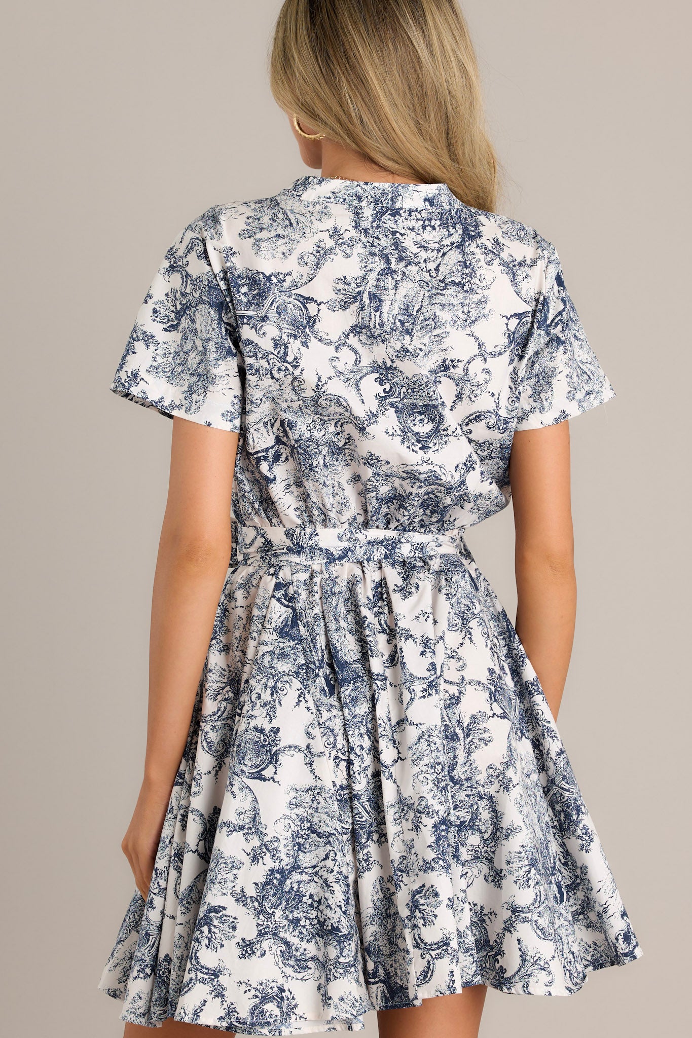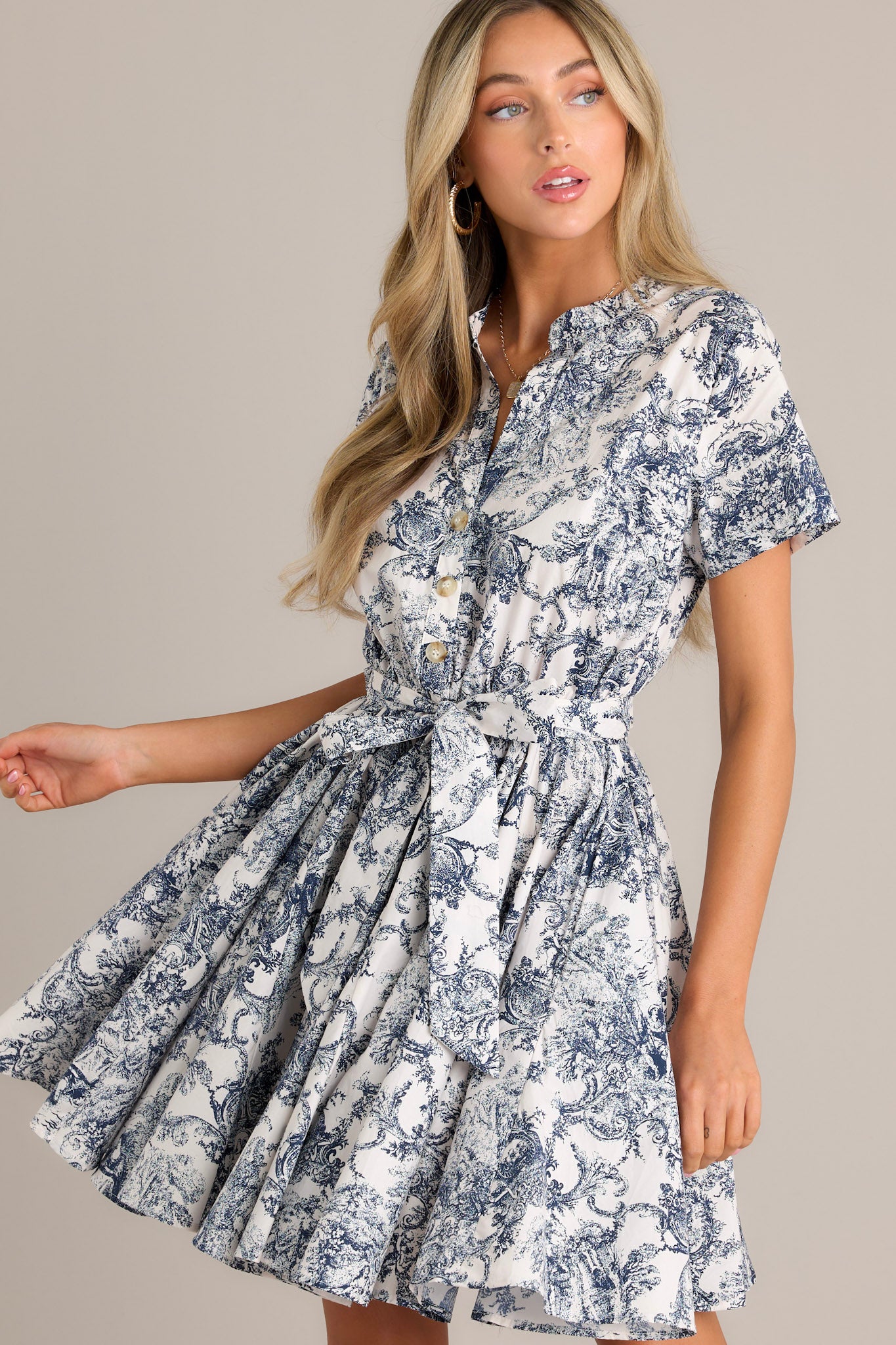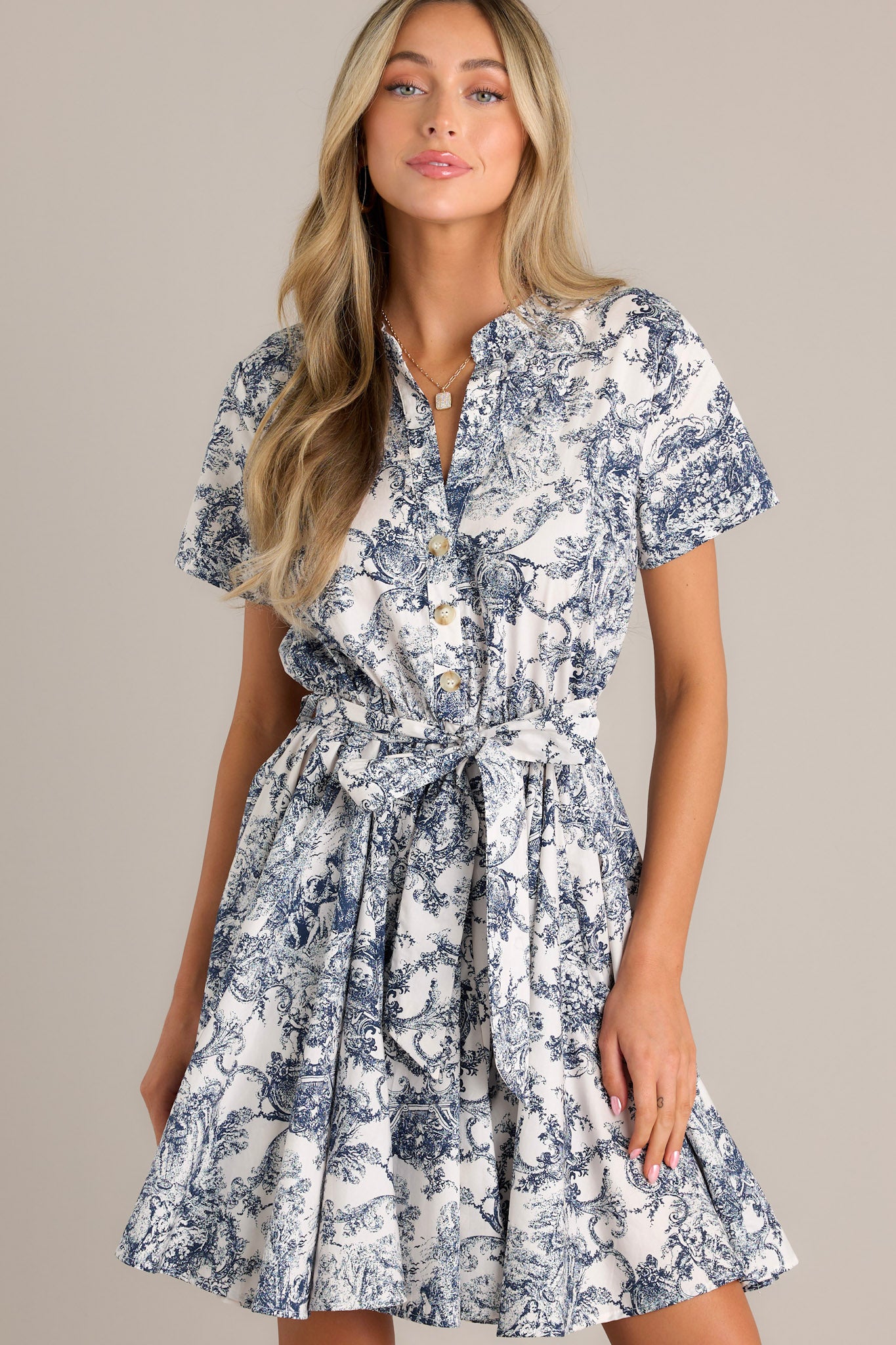 Get ready to make a statement with the Coastal Vista Navy Toile Mini Dress! This dress features a stunning navy toile print that will turn heads and a mini length for a sassy touch. Perfect for any coastal getaway or summer event, this dress is sure to bring out your playful and adventurous side. Don't miss out on this quirky and stylish piece! This navy mini dress features a v-neckline, a button front bodice, an elastic waistband, a self-tie waist belt, belt loops, short sleeves, and a flowing silhouette.