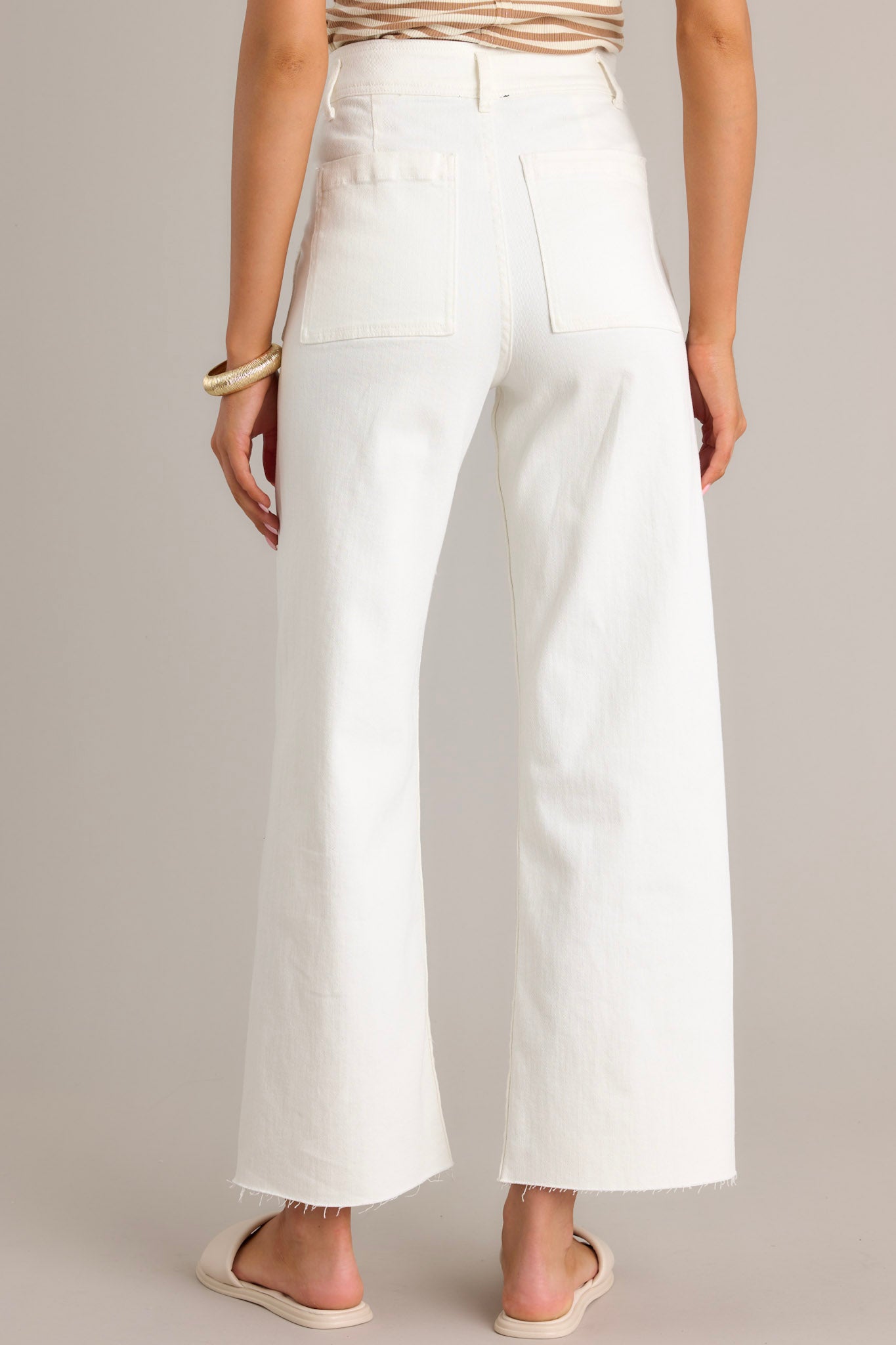 Unleash your inner fashionista with the Crisp Canvas White Denim Wide Leg Jeans. These stylish pants feature a wide leg design for a flattering fit and are made from a high-quality crisp material for a clean look. Perfect for any occasion, these pants will have you looking and feeling your best! These white jeans feature a high waisted design, a classic button & zipper closure, belt loops, functional front & back pockets, a wide leg design, and a raw hemline.