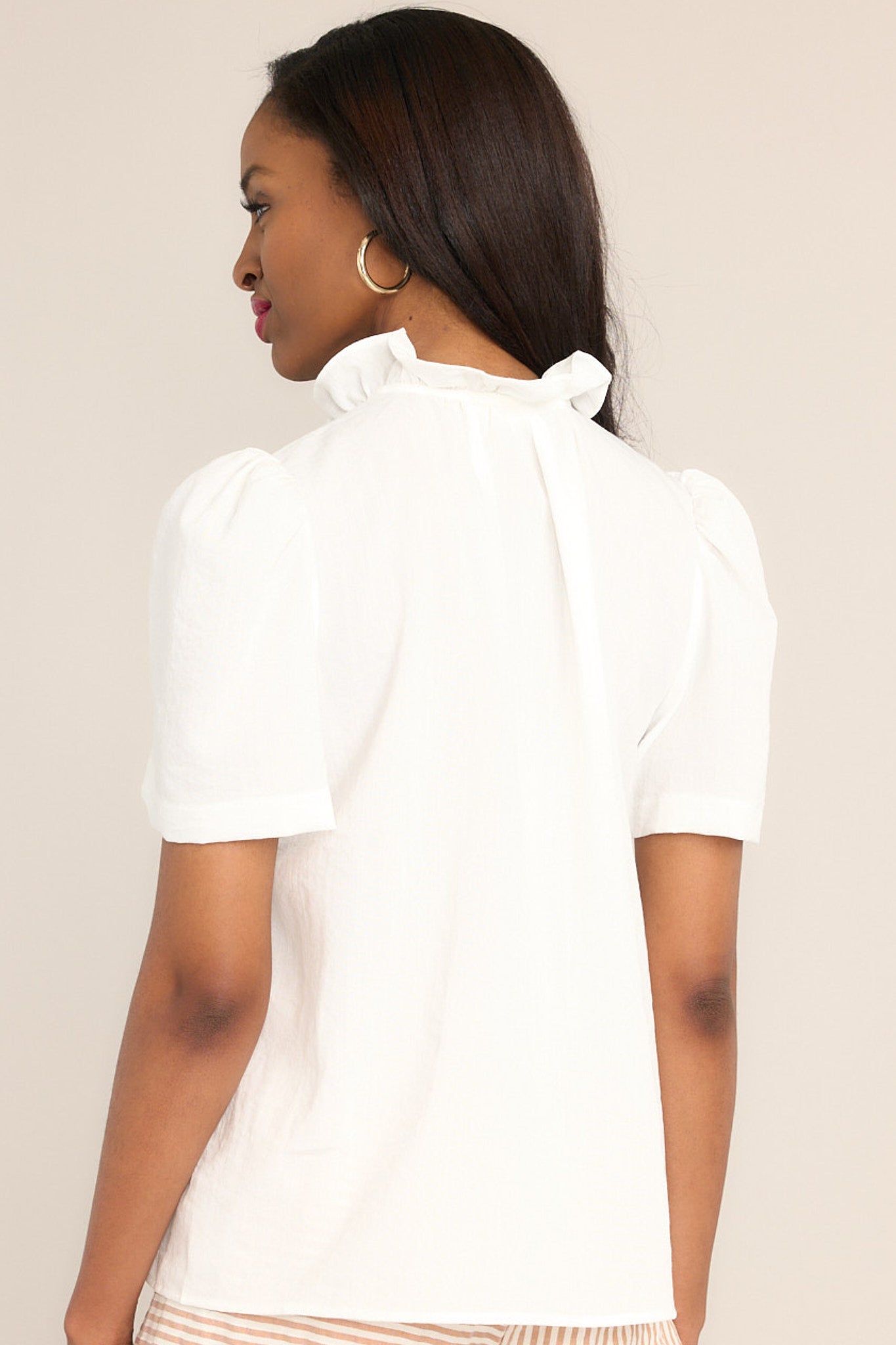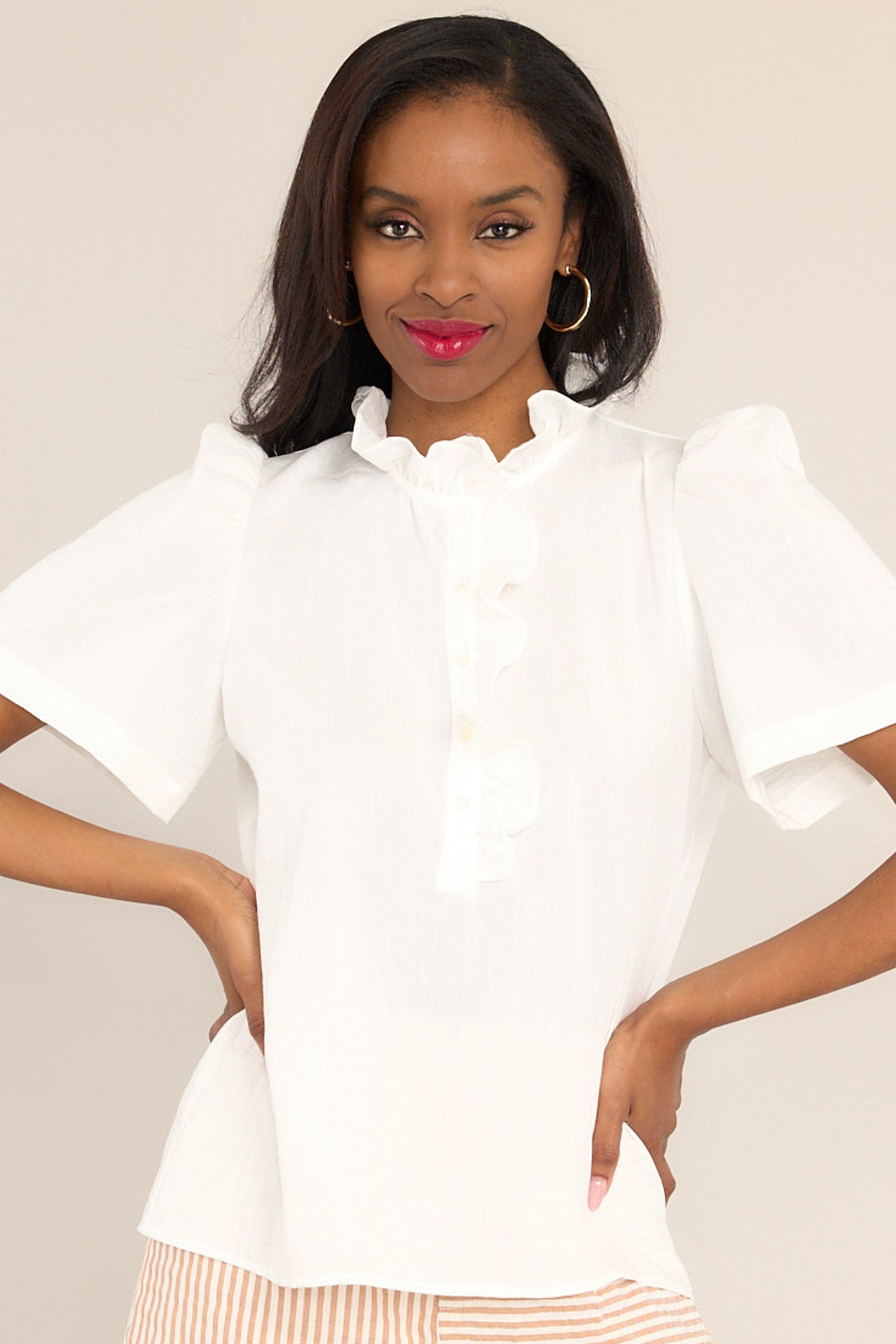 Get ready to shine with our Crystal Clear White Short Sleeve Top! This white blouse is perfect for any occasion, adding a touch of elegance to your wardrobe. Embrace your inner sparkle and stand out in style! This white top features a high ruffle neckline, five functional buttons down the front, and short sleeves.