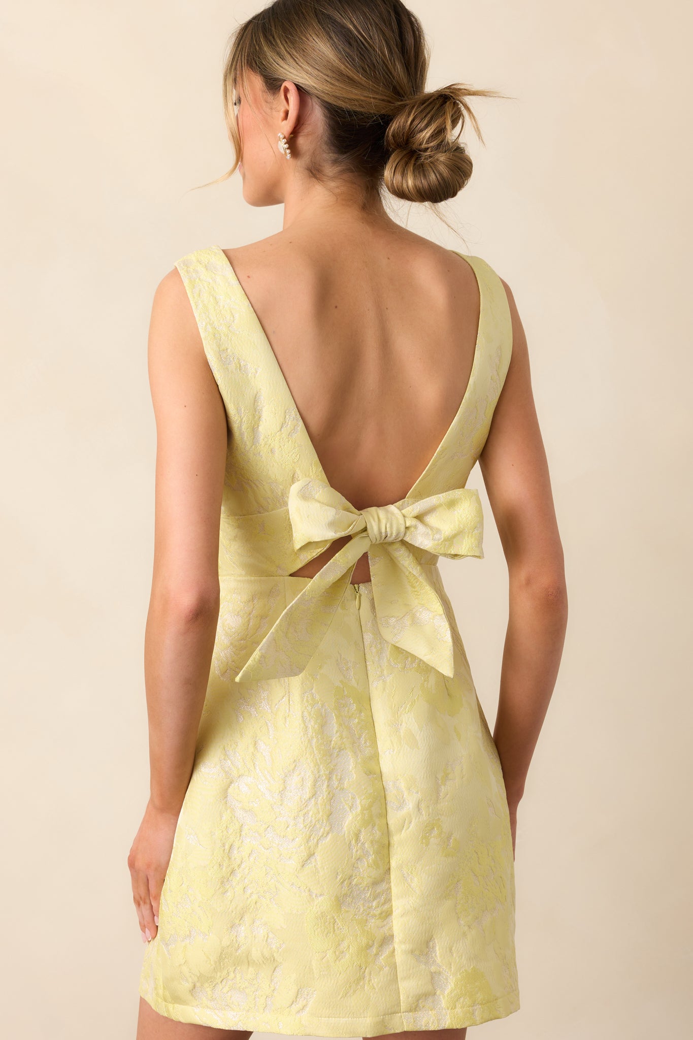 Experience the joy and beauty of the Daily Delight Yellow Floral Jacquard Mini Dress. Embrace the vibrant yellow hues and intricate floral jacquard design that will leave you feeling both stylish and confident. Made with high-quality materials for all-day comfort. A must-have for any fashion-forward individual! This yellow dress features a discreet back zipper, self-tie back bow, sleeveless design, gold detailing throughout, v-neckline, and a mini length.