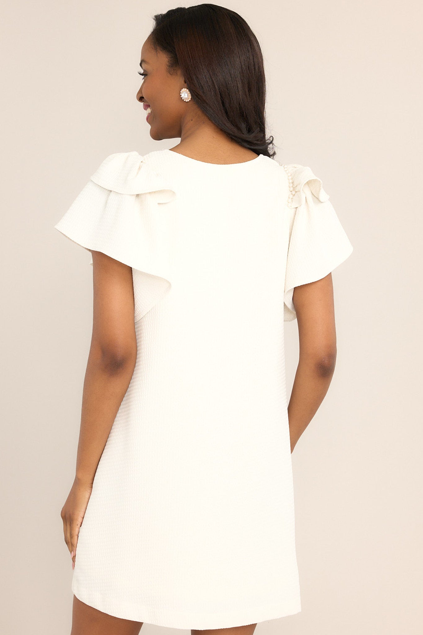 Get ready to dance through life in the fun and flirty Dancing Through Life White Mini Dress! This stylish mini dress features a flowing silhouette and playful ruffle details, perfect for twirling on the dance floor. With its versatile and comfortable design, you can easily wear this dress from day to night. So go ahead and dance your way through life in style with this must-have dress! This dress features a v-neckline, ruffle sleeves, pearl detailing on the sleeves, and a soft fabric.