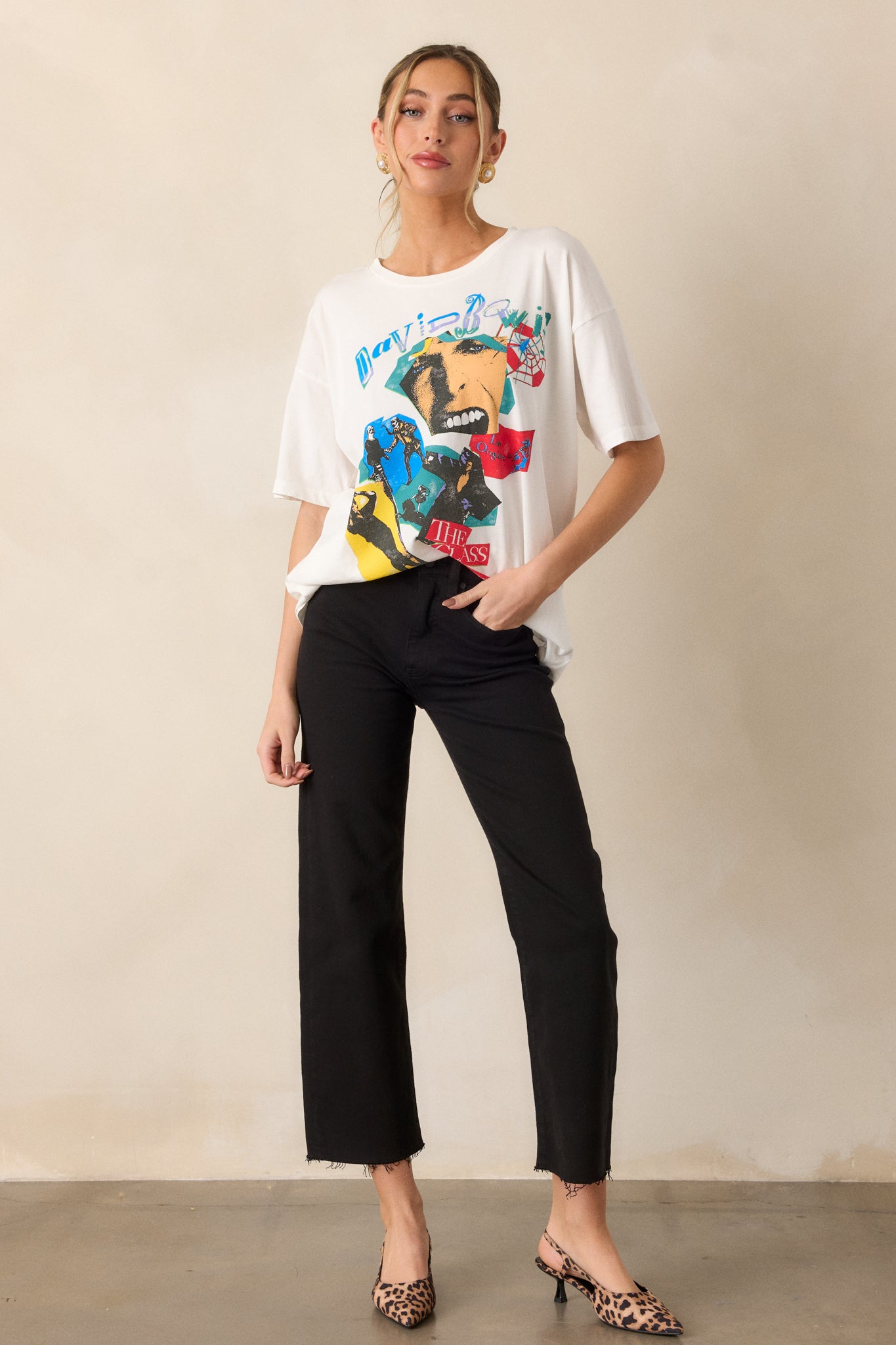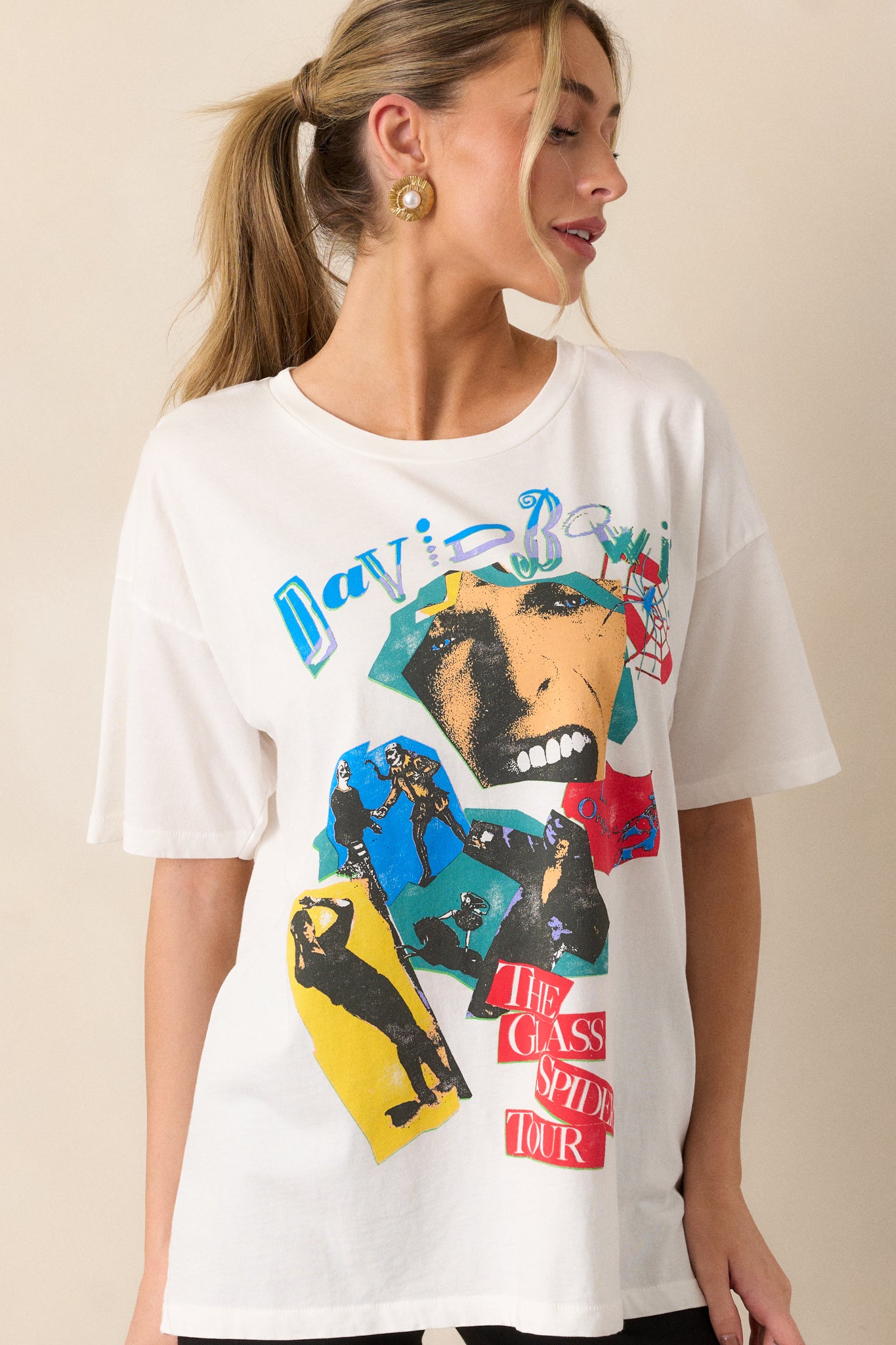 Indulge in the iconic style of David Bowie with this soft white Les Origines Merch Tee! Embrace the legacy of Ziggy Stardust and bring your wardrobe to life with this classic design. Made with premium materials, this t-shirt provides both comfort and style. Channel your inner rockstar and make a statement with this must-have piece. This white tee features a round collar, short sleeves, and a "David Bowie The Glass Spider Tour" graphic on the front and back.