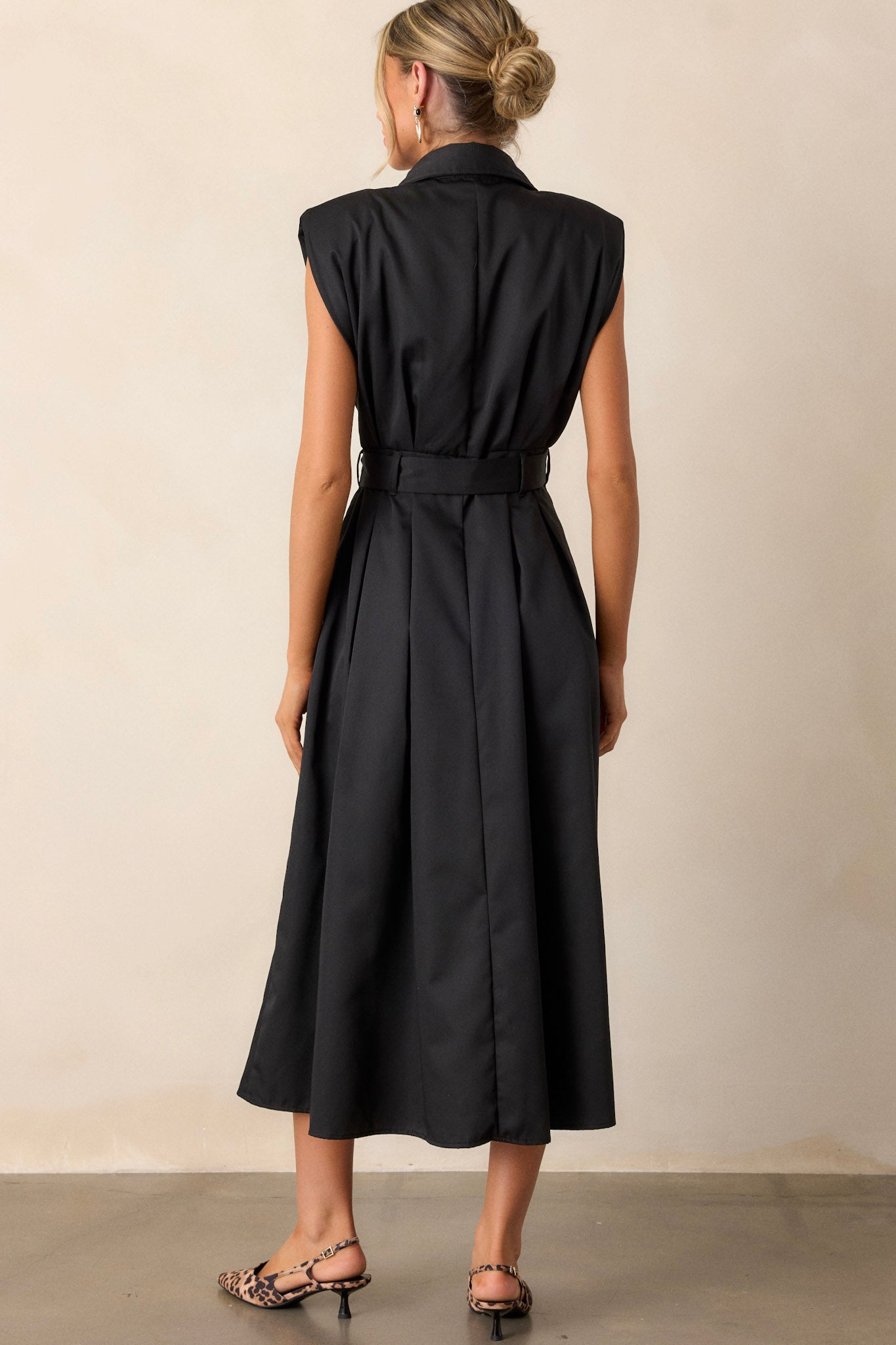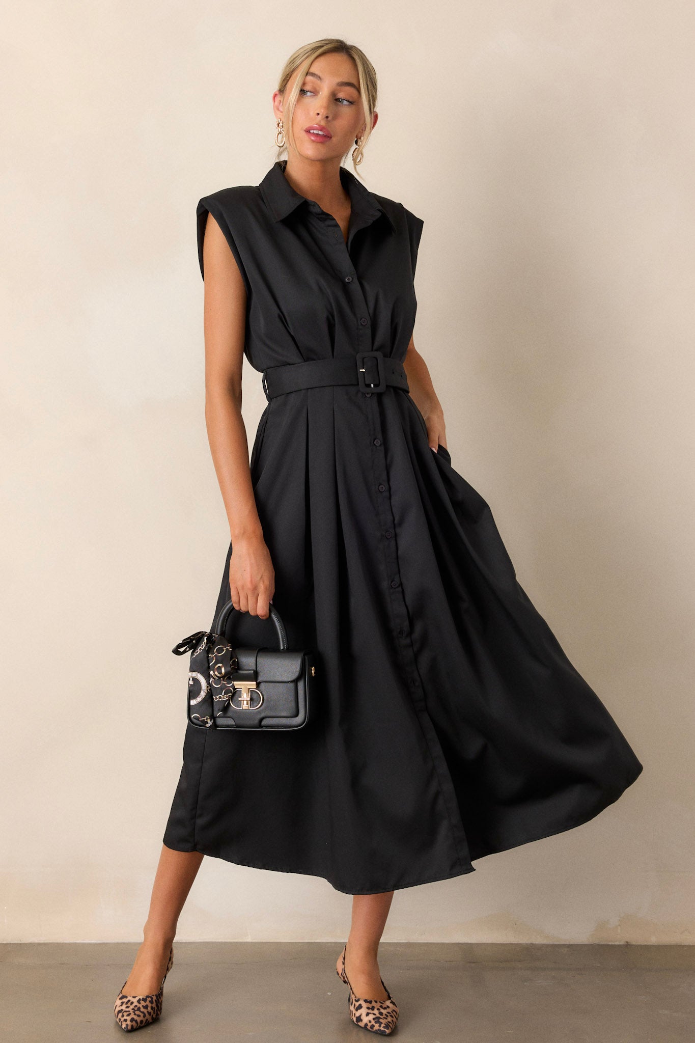 Conquer any adventure in our Days Go By Black Belted Midi Dress. With its sleek and versatile black design, this dress is the perfect bold statement for any journey. The belted waist adds a touch of challenge and adventure to your look. Empower yourself and stand out in this midi dress! This black dress features built-in shoulder pads, a functional belt and a functional button front.