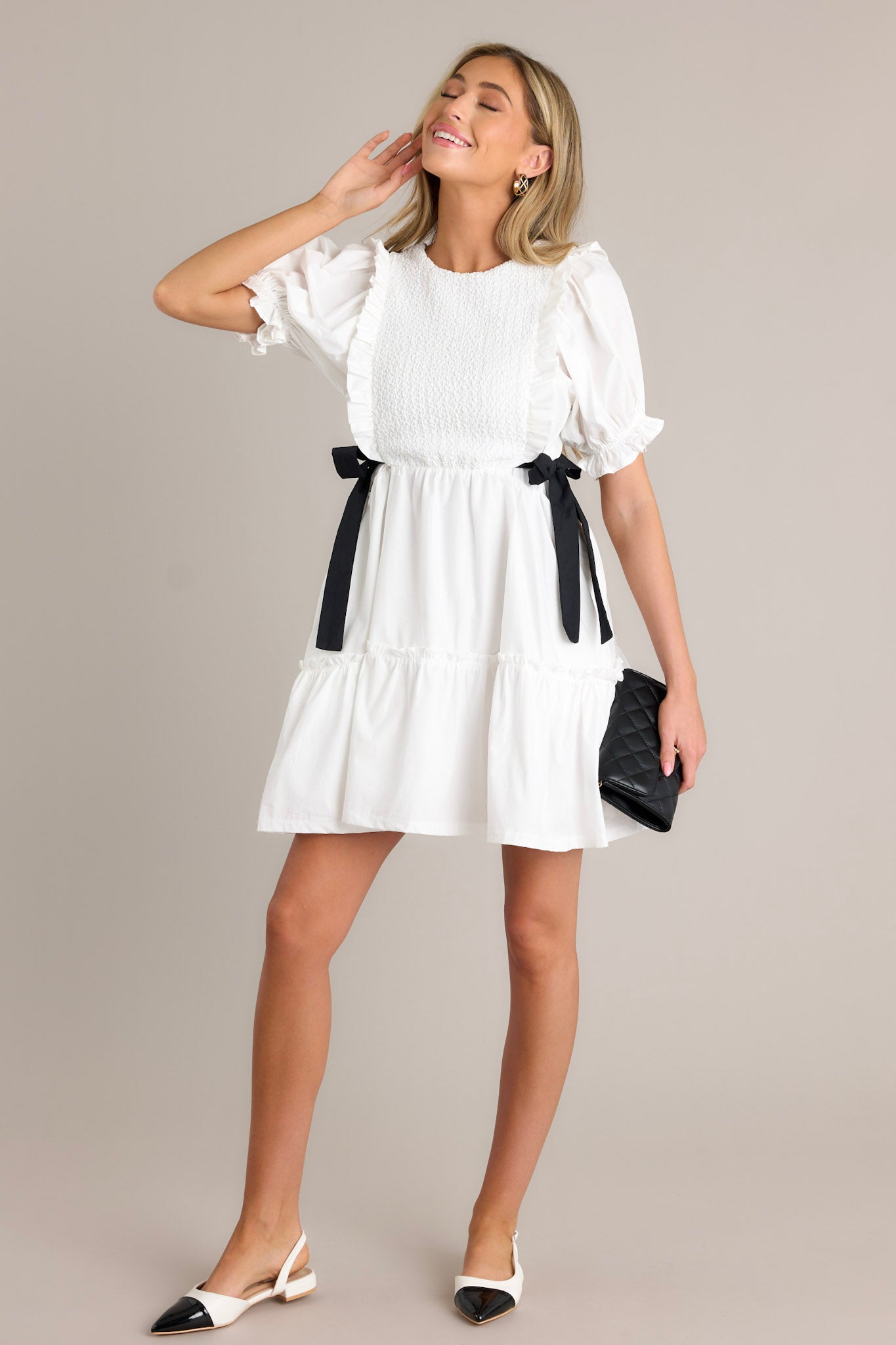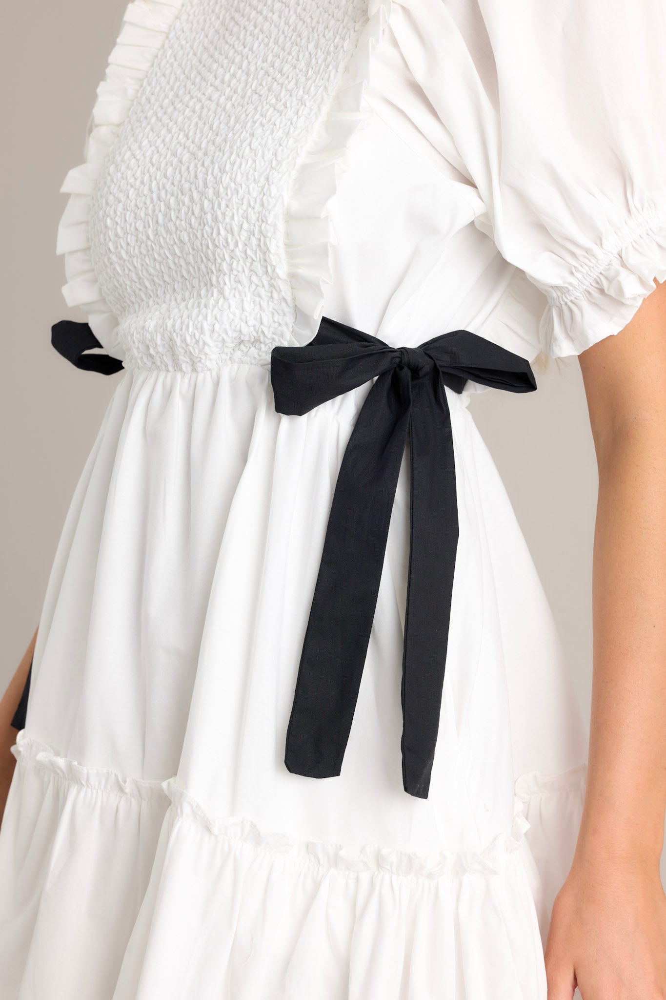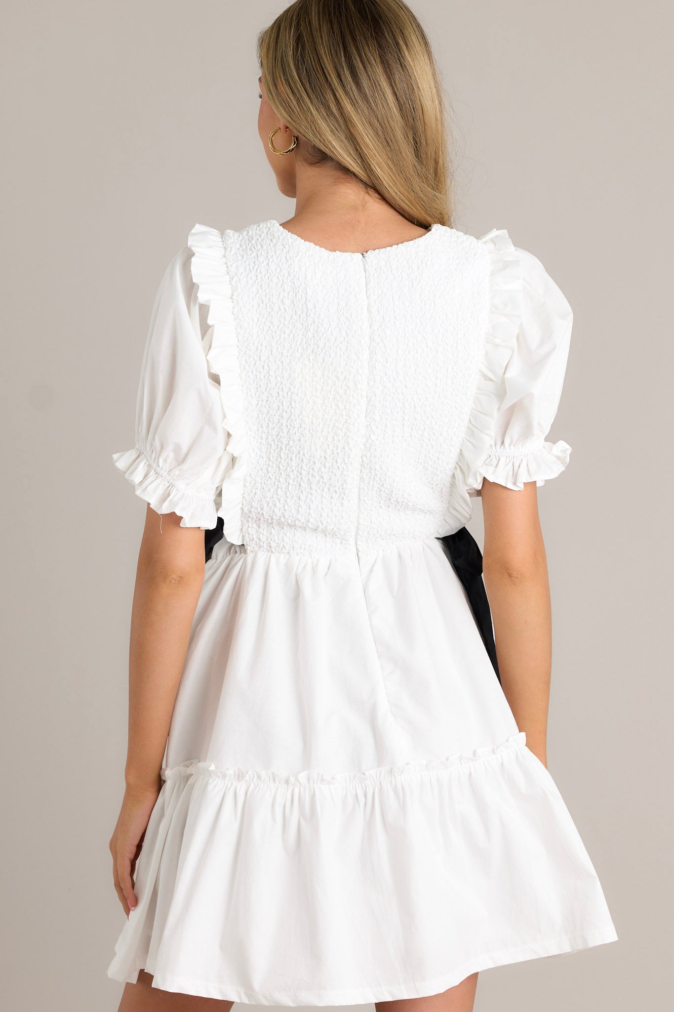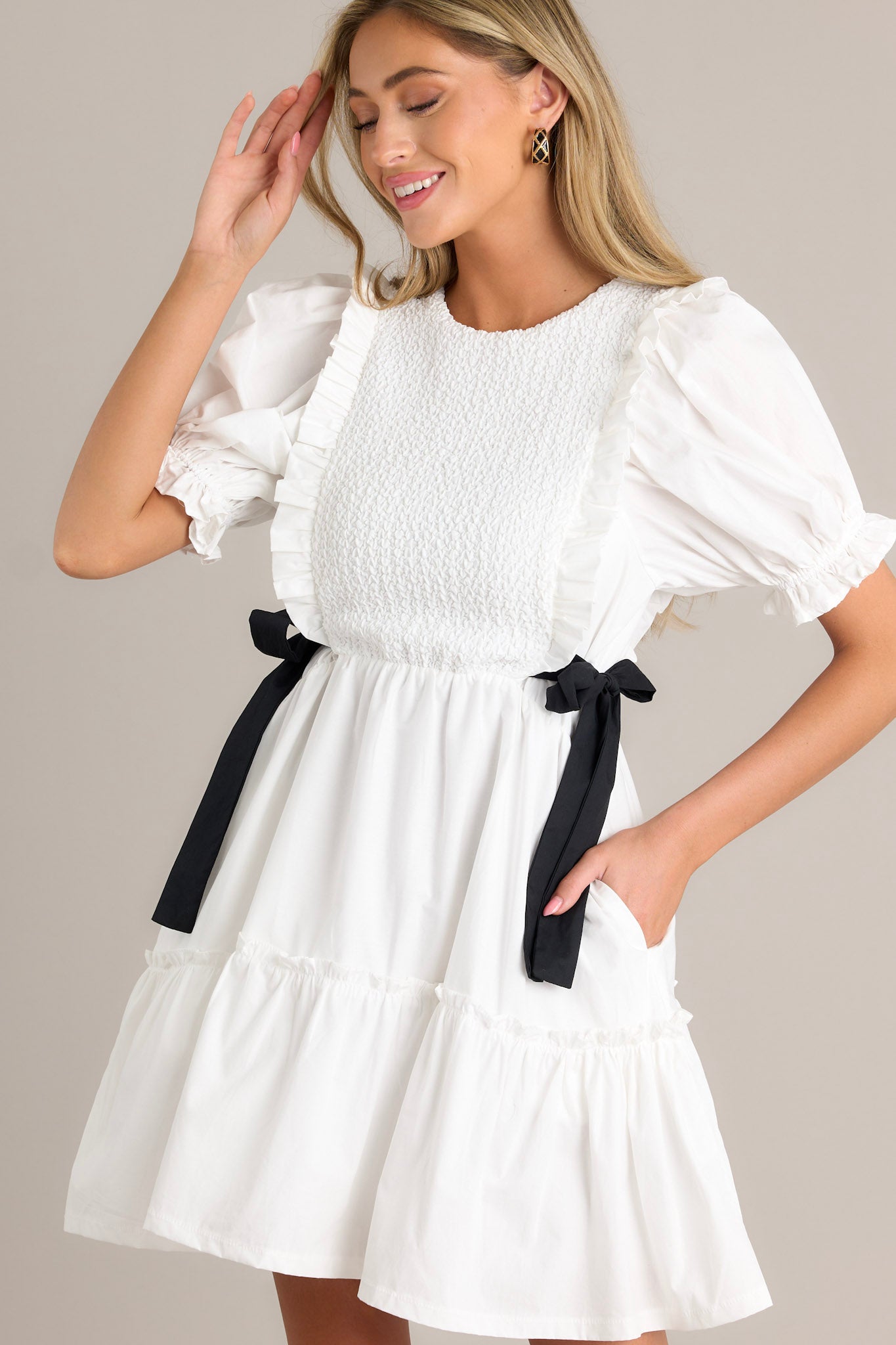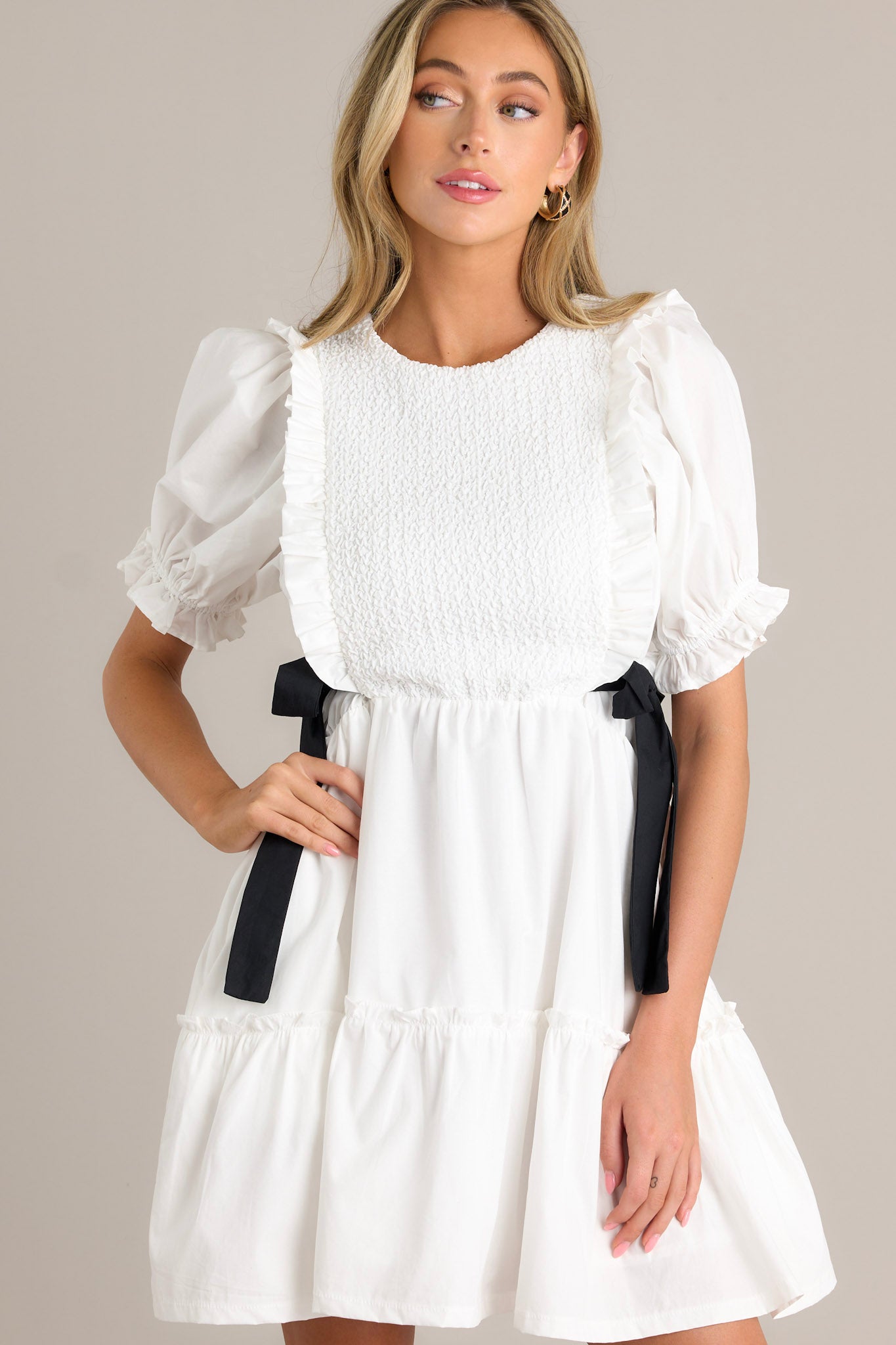 Make the ultimate style decision with our Decision Made Ivory Puff Sleeve Mini Dress! This dress features playful puff sleeves and a mini length for a fun and flirty look. Perfect for any occasion, this dress will have everyone saying yes to your fashion choices! This ivory mini dress features a smocked bodice design, self tie waist bows, a tiered design, a discrete back zipper, and cuffed puffer sleeves.